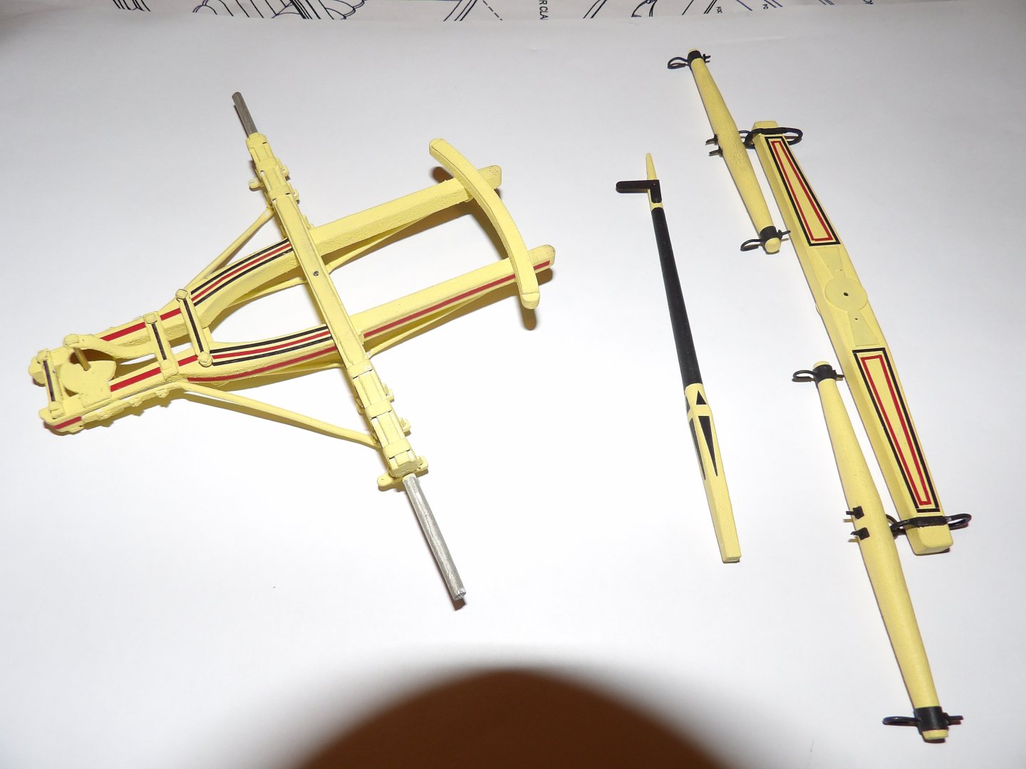 I enjoyed building the Doctor's Buggy so much that I ordered the Concord Stagecoach and am well into it at this time. Picture of finished model from the manual: I see opportunity for lots of scratch-made doodads! Starting the undercarriage: Pins are soldered to the U-straps to simulate bolts: Made a mistake in reducing the width and length of the wooden part of this axle assembly because the drawings showed them as matching. . . This resulted in a poor fit of the U-straps as well as not providing enough stand-off for the wheels; I'll need to add material somehow: Waiting on a couple of missing parts to continue with the undercarriage. So I assembled the wheels. The wheels have a carved scalloped design between the spokes. Not easy to make these uniform in plywood! I finished painted one wheel. The red and black decoration is done with Sharpie pens, which quickly stopped flowing when used on painted wood. The decorations also came out somewhat wobbly. If I can do better on the other wheels, I may re-do this one. The decorations are supposed to be on both sides of the wheel, but I may decide not to do them inboard. . .