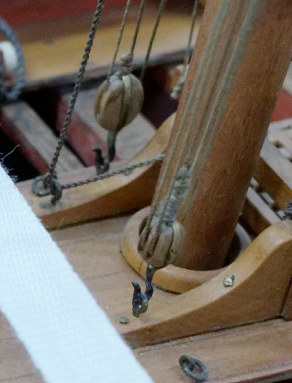 You should get a lot of feedback on this, but I was particularly taken by a method Chuck demonstrated with Speedwell. Instead of making eyebolts that look like the little jewelry eyelets provided with most kits, one simply makes a U-shape from the wire being used. The following is clipped from the post by Chuck. You then counter sink this "eyebolt" into your work and it looks very realistic. The "hole" you sink it into needs to be a little oval shaped instead of round. I have since observed this feature on contemporary models and artifacts. Here it is on a salvaged gun carriage. Here is an example from a contemporary model. It is really effective for small applications like the gun port lid.