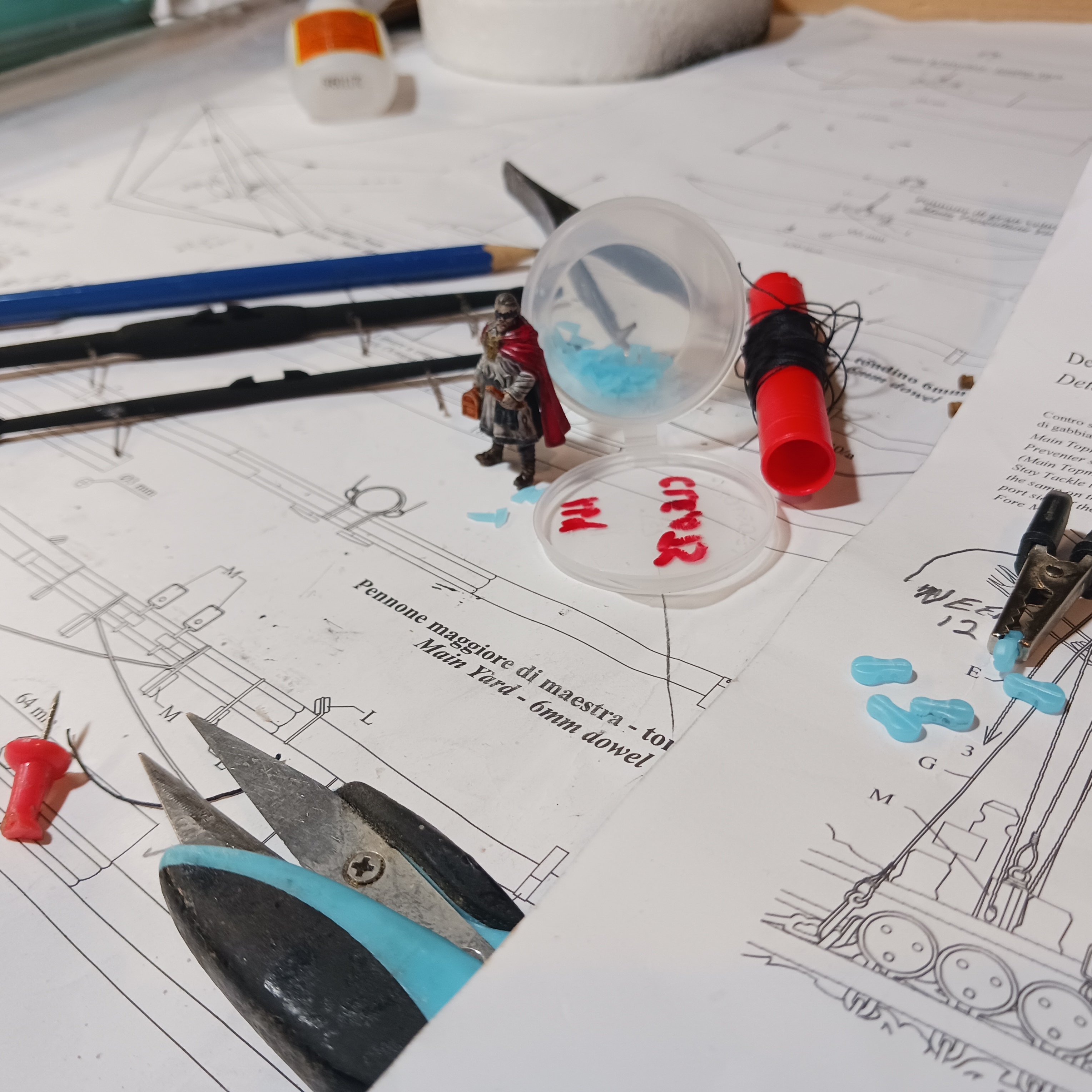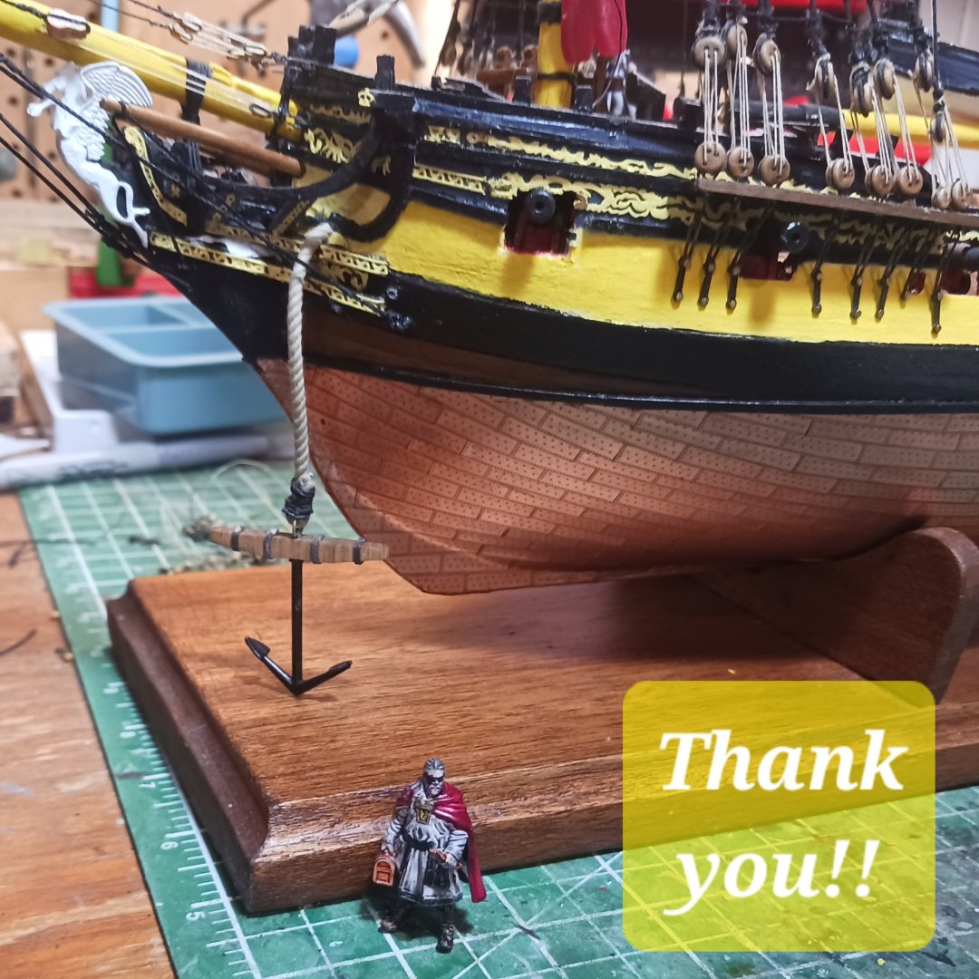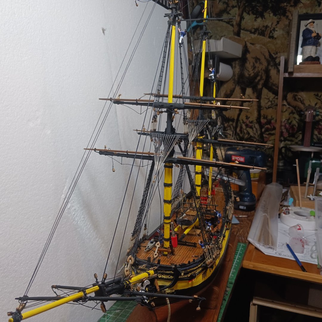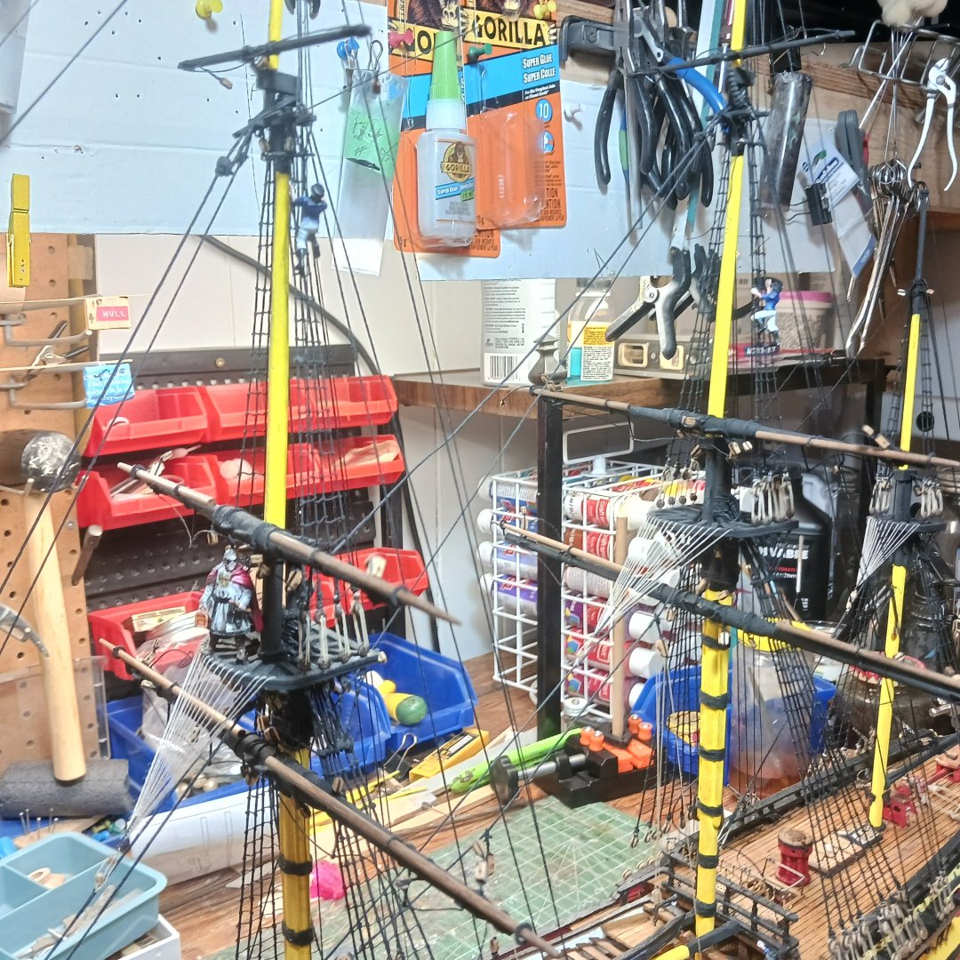 Today had lots of outside interferences, Christmas decorations to put up, last minute check for hoses and things that freeze, septic tank to cover, winters coming. Yeepppieeee, shipyard time 😆. After the boat was installed it was time to get back at the aft stays, I have 6 left on the portside to tie on, lots of fun, deadeyes and lanyards, and seizing. More crew men have been in listed to help untange the stays. I have 6 fore stays to in stall, 2 each on the main and fore mast, and the two that run through the bees. Then on to the dreaded bowsprit mast, several lose ends there that I need to study, but I belive I will be moving on to the yards soon . The excitement is growing for some reason, I still have lots to do, my mined is full of dreams and builds. I have two left to do and can't decide which one I would like to try. Plus I have a train engine and a ferris wheel 🎡 to build for dioramas. The is nothing like the rush of having so much to do and so little time left to do it. I want to try to build one of every kind, I don't have a Swedish ship yet, but I do have a kit of a Vasa--Wasa that I am anxious to build. Lol, let's finish the Peg first lol. Thanks so much for all the likes and help. I know one thing for sure I owe MSW/NRG and all of you a debt more than I could ever repay. Deeply greatful for everything. Knocklouder 😁 Kurt ⚒️
