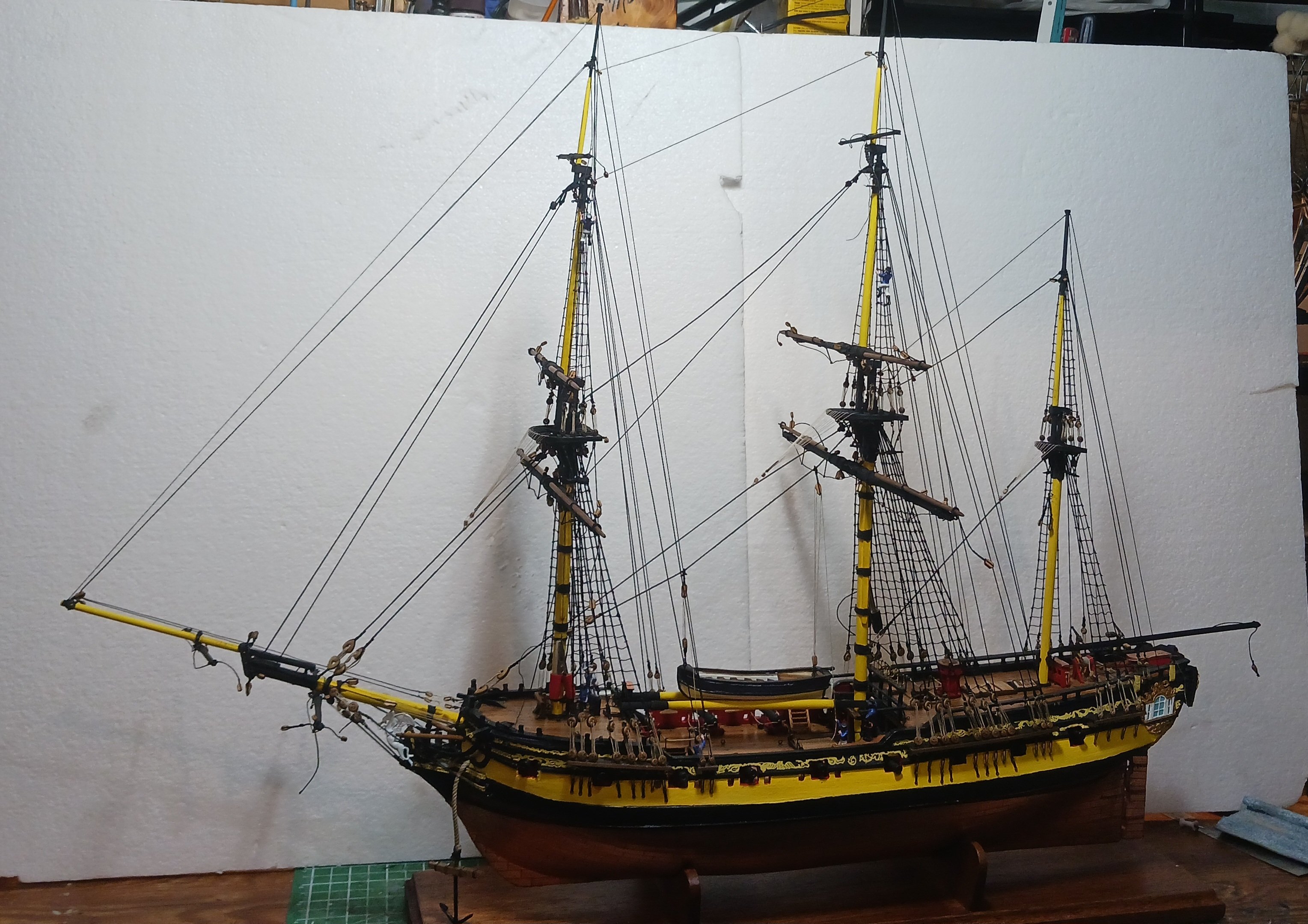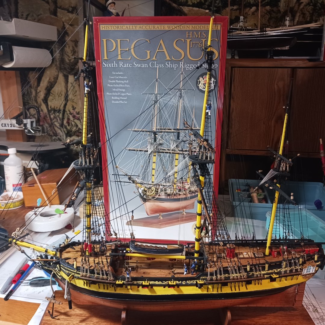 @buntzi, in the four years that I have been modeling, @Chriswatton at Vanguard Models have been the best for explaining and telling were things go and what size. The Pegasus was designed by Chris, I have done six Amati Models the Pegasus was the easiest to follow, that's why my next model will be a Vanguard Model. Instructions and the help you get from Vanguard is top notch.. yesterday I had the privilege to go have lunch with fellow modeler @Gabek. I needed to give him some needle threaders and my resin man made me 50 cleats and 50 fiddle blocks, with round edges beautiful stuff So very greatful I met him, he get first place on the long list of thank you 's @Keith Black thank you also for all your help, and putting up with my Neanderthal humor lol. Keith has lead me to logs of unbelievable perfection on rigging . The Texan , @Glen McGuire, the best SIB man there ever was, Thanks. Also @John Ruy, @LyleK1, @Loracs, @HardeeHarHar, @Landlubber Mike @Bryan Woods, @GrandpaPhil, @Ronald-V , @Ryland Craze. @ccoyle @Coyote_6 @aliluke @Dave_E @mtaylor Just to name a few, and everyone that I missed And the new member, who like my ships . And MARY of MSW, and all MSW/NRG. So just a bunch of tieing off, and she will be done Mizzen booms and gaff. The yards are pinned on , now I can rig them and slide them back on easily. It Has a little more yellow than on the box, oh I see the anchors need to be added, and a ladder 🪜 on the side of the ship. Lol As @John Ruy would say, Details, it's all in the Details. . My apologies if I missed some one on the thank you list, I just thought of a few more in The U K. Next time Knocklouder 😁 Kurt ⚒️