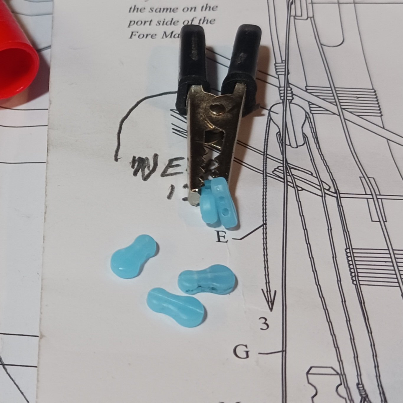 I have all the stays run fore and aft , just have to tie them on to the deck. Kurt likes the pacifier Pegasus that I installed, 😎 , cool I think lol. Just tieing a few lose ends then on to the bow spirit mast. A really big thanks goes to buddy @Gabek who told me about these Collapisible Eye Needles . They are fantastic to use, makes treading 2mm deadeyes a breeze. @Glenn-UK you got to try these, if you can find some. I used one to thread all three crowsfeet lines on the Pegasus and didn't have to stiffen the lines once, so eazy just to push the wire through the little hole thread the line pull back done. Makes doing crowsfeet lines so eazy , I would requmended them ,it's a game changer . Seems I am missing a 5mm deadeye on the Bowsprit mast, and missing a single block at the tip of the Bowsprit mast as well.. Should have it all tied up in a couple more days I hope. Then it is off to the display case just to give me space to build the yards. Toying with the idea of putting all the swivel guns back on, as well as the gun port lids, I have a ladder on the port side to install, then the hand rails that go with that. And dare say, install the figurehead. Lol So lots to do. But she looking great to me, a slight applause from the deck of the Astrolabe could be heard, lol. Thanks so much for look in. Knocklouder 😁 Kurt ⚒️