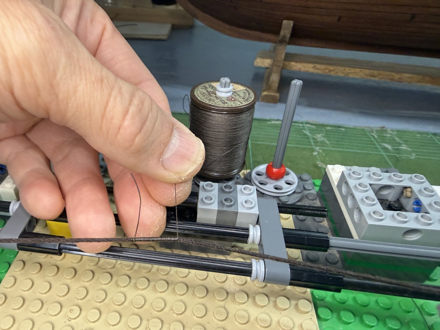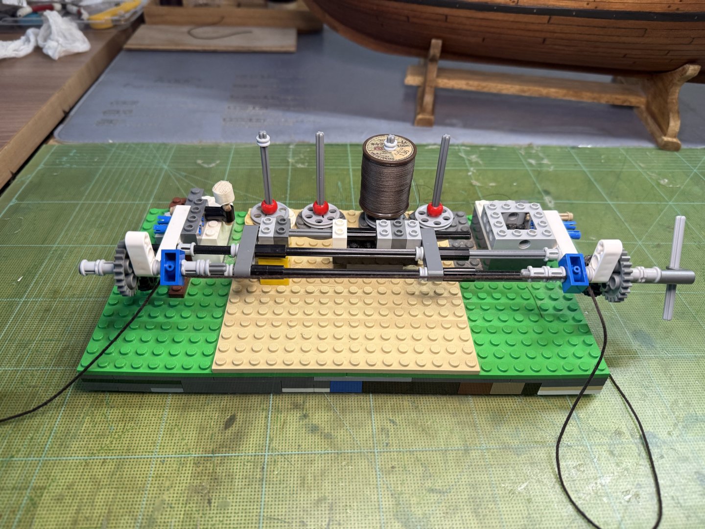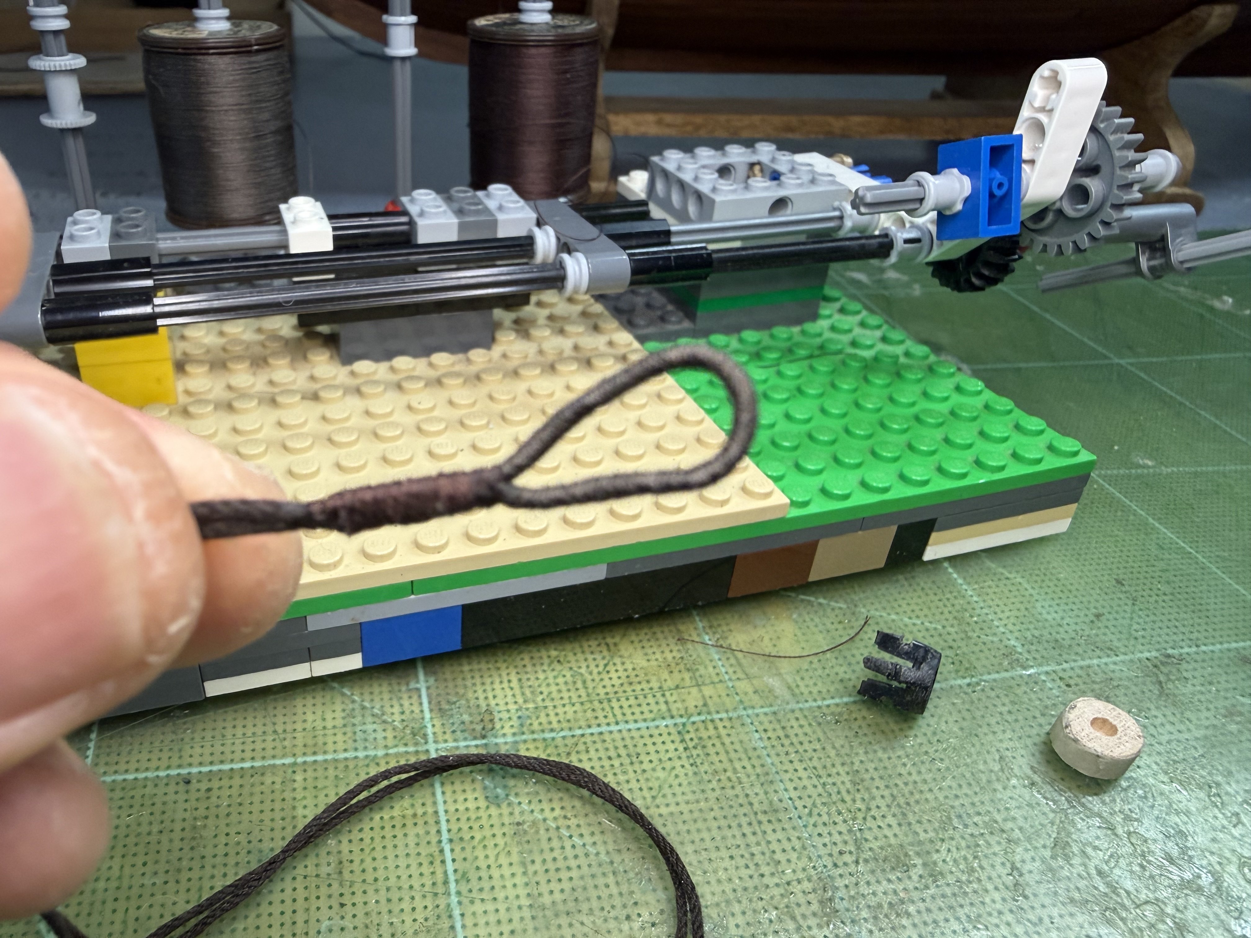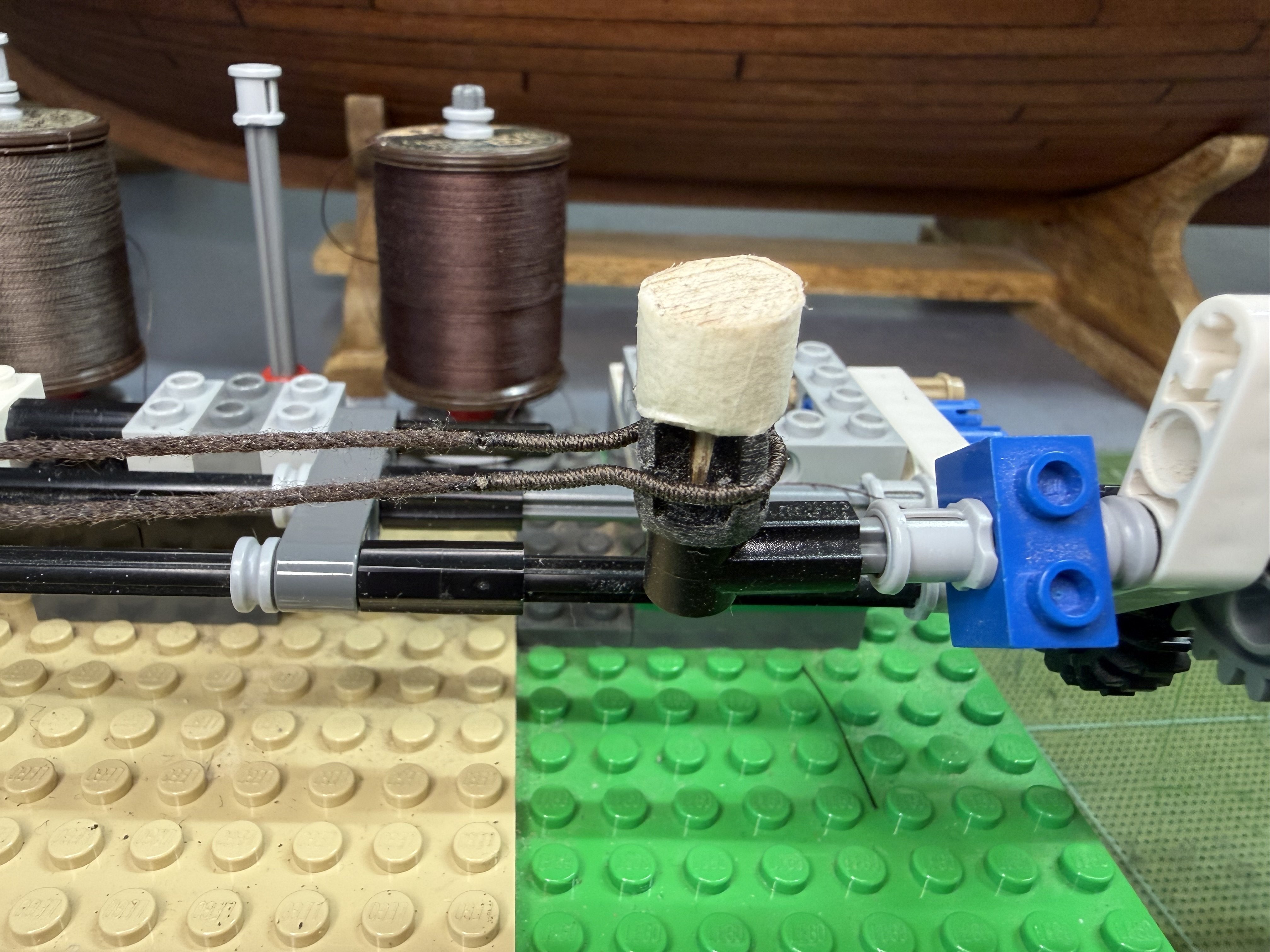 5. Hi All~ Progress report on GH1 & GH2 : quite a lot of testing, trying out various stuffs, proof of concept kind of activities were carried out since my last update. These include 1) trying out pine tar treated threads for stays and shrouds (vis-a-vis the appropriateness of color, thickness and ease of serving with my newly procured dark brown polyester thin threads and etc.), 2) trying out various methods and positions for the stays and shrouds, 3) dry runs in regards to the rigging of some sheets for the purpose of pre-determining overall belaying positions and also to assess (to some degree) if the current number of belaying facilities are enough or not. The below pictures show the end results of pine tar dyeing of two types of threads. Thinner one (about 1 mm in diameter, for shrouds and upper mast stays ) was originally light brown cotton thread - dyed using 1:1 (pine tar : thinner) proportion. This one took about a week to touch dry. The thicker one (about 1.5 mm in diameter, for lower mast stays ) was originally white cotton thread - dyed using 2:1 (pine tar : thinner) proportion. This one took about 3 weeks to touch dry. Testing serving on couple of samples (shroud lines and stay related blocks) on my Lego serving machine- to which I added more function to enable other tasks. First try-outs of the served threads.