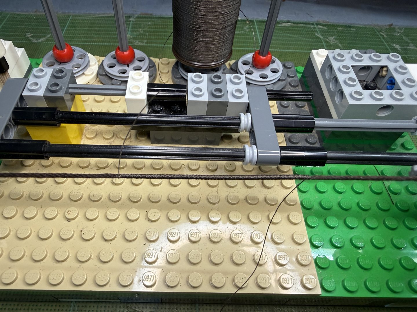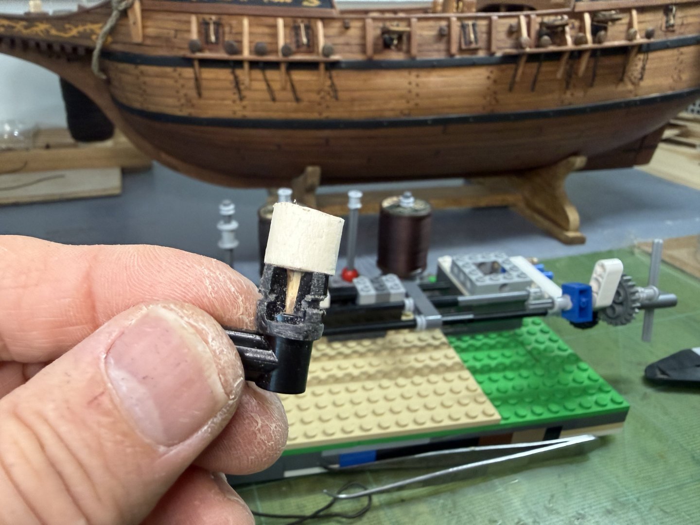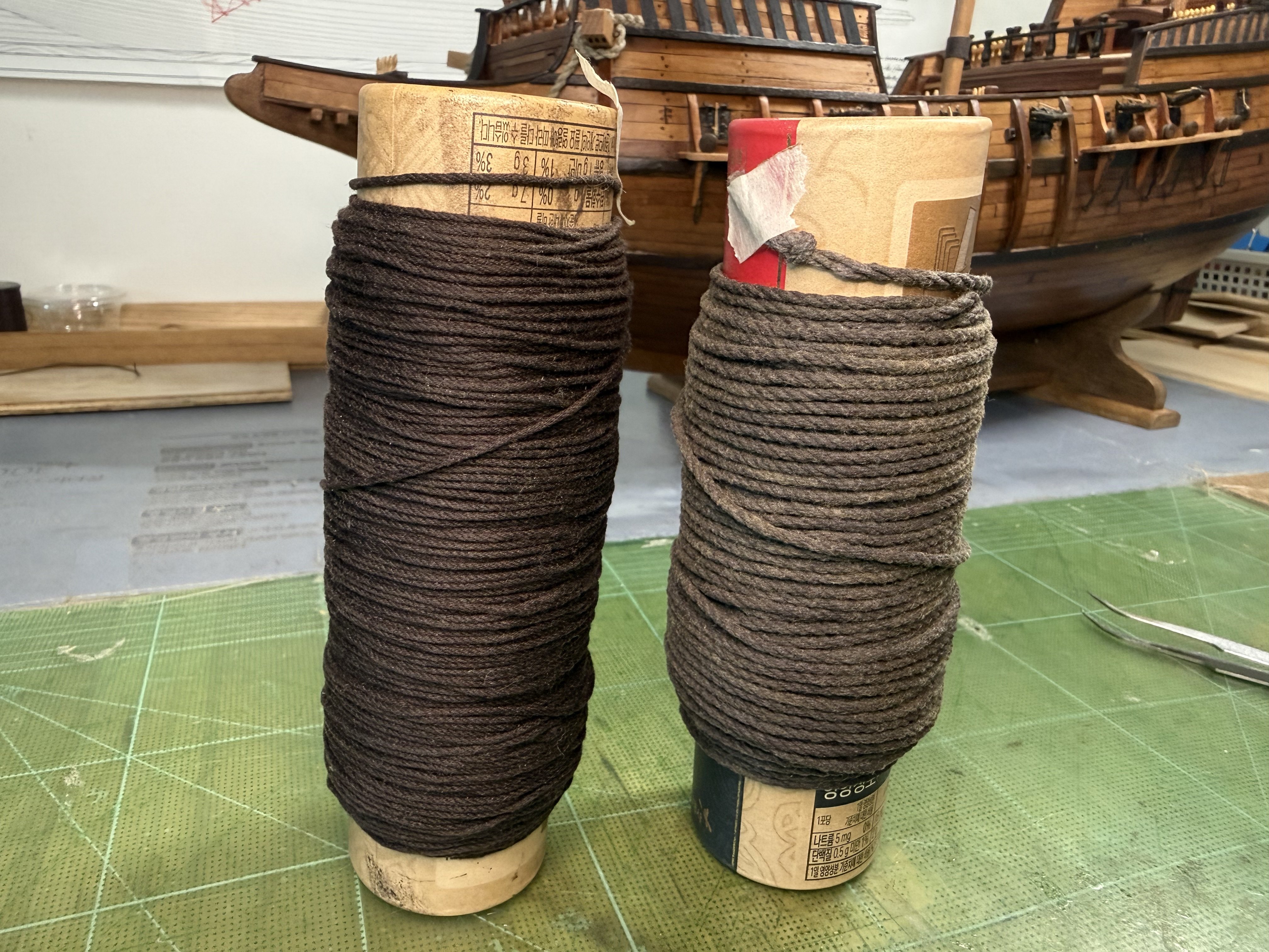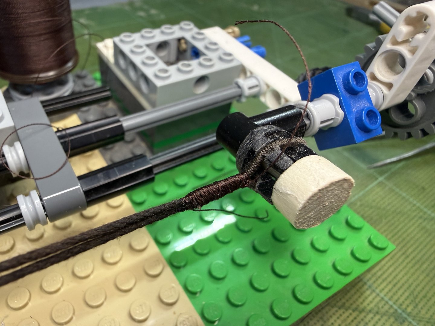 5. Hi All~ Progress report on GH1 & GH2 : quite a lot of testing, trying out various stuffs, proof of concept kind of activities were carried out since my last update. These include 1) trying out pine tar treated threads for stays and shrouds (vis-a-vis the appropriateness of color, thickness and ease of serving with my newly procured dark brown polyester thin threads and etc.), 2) trying out various methods and positions for the stays and shrouds, 3) dry runs in regards to the rigging of some sheets for the purpose of pre-determining overall belaying positions and also to assess (to some degree) if the current number of belaying facilities are enough or not. The below pictures show the end results of pine tar dyeing of two types of threads. Thinner one (about 1 mm in diameter, for shrouds and upper mast stays ) was originally light brown cotton thread - dyed using 1:1 (pine tar : thinner) proportion. This one took about a week to touch dry. The thicker one (about 1.5 mm in diameter, for lower mast stays ) was originally white cotton thread - dyed using 2:1 (pine tar : thinner) proportion. This one took about 3 weeks to touch dry. Testing serving on couple of samples (shroud lines and stay related blocks) on my Lego serving machine- to which I added more function to enable other tasks. First try-outs of the served threads.