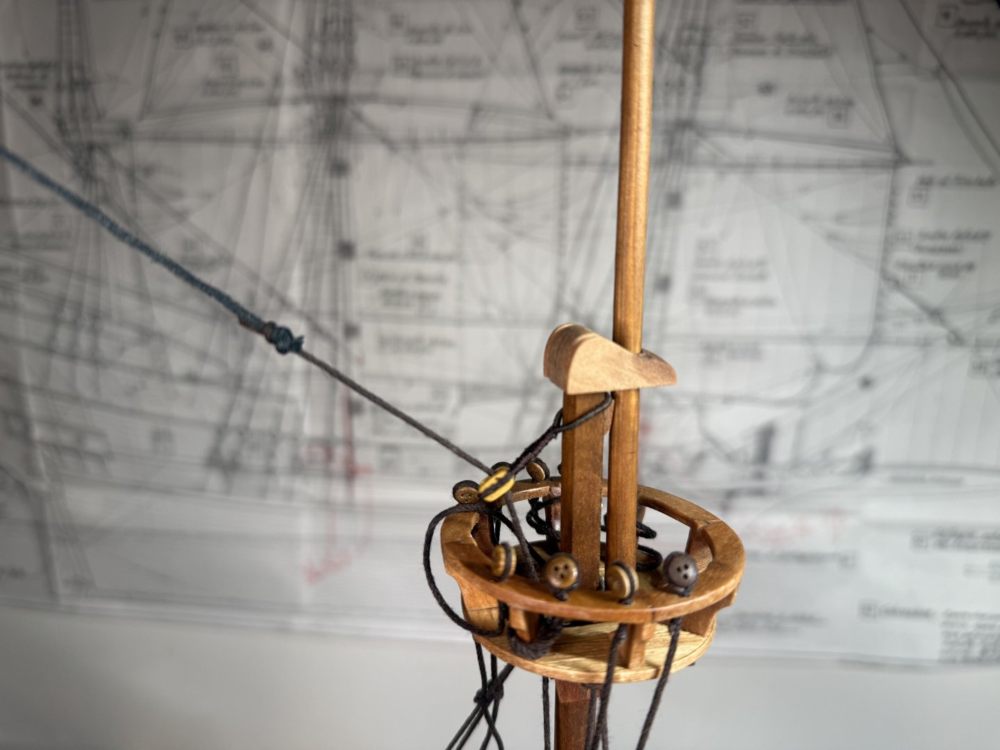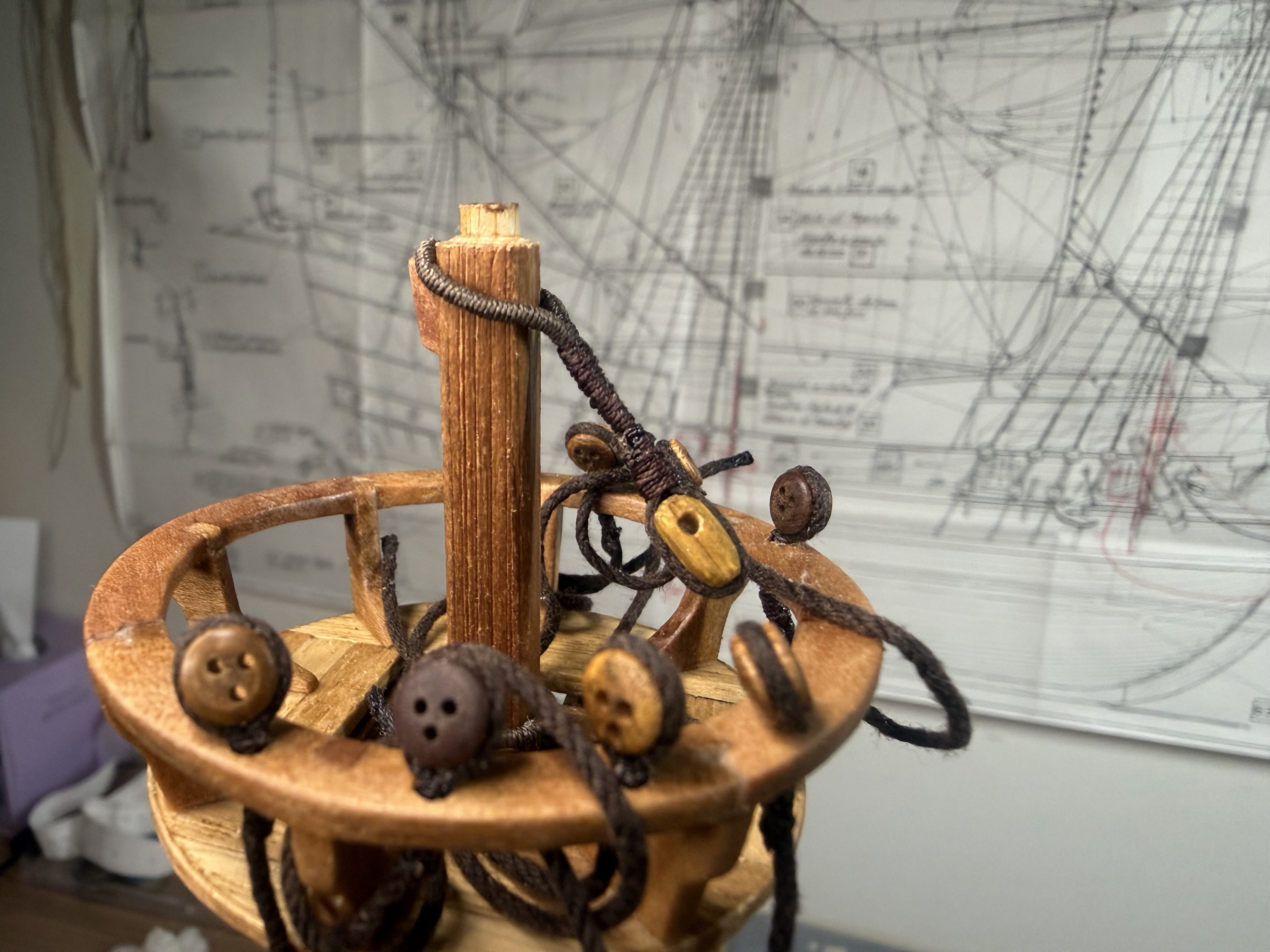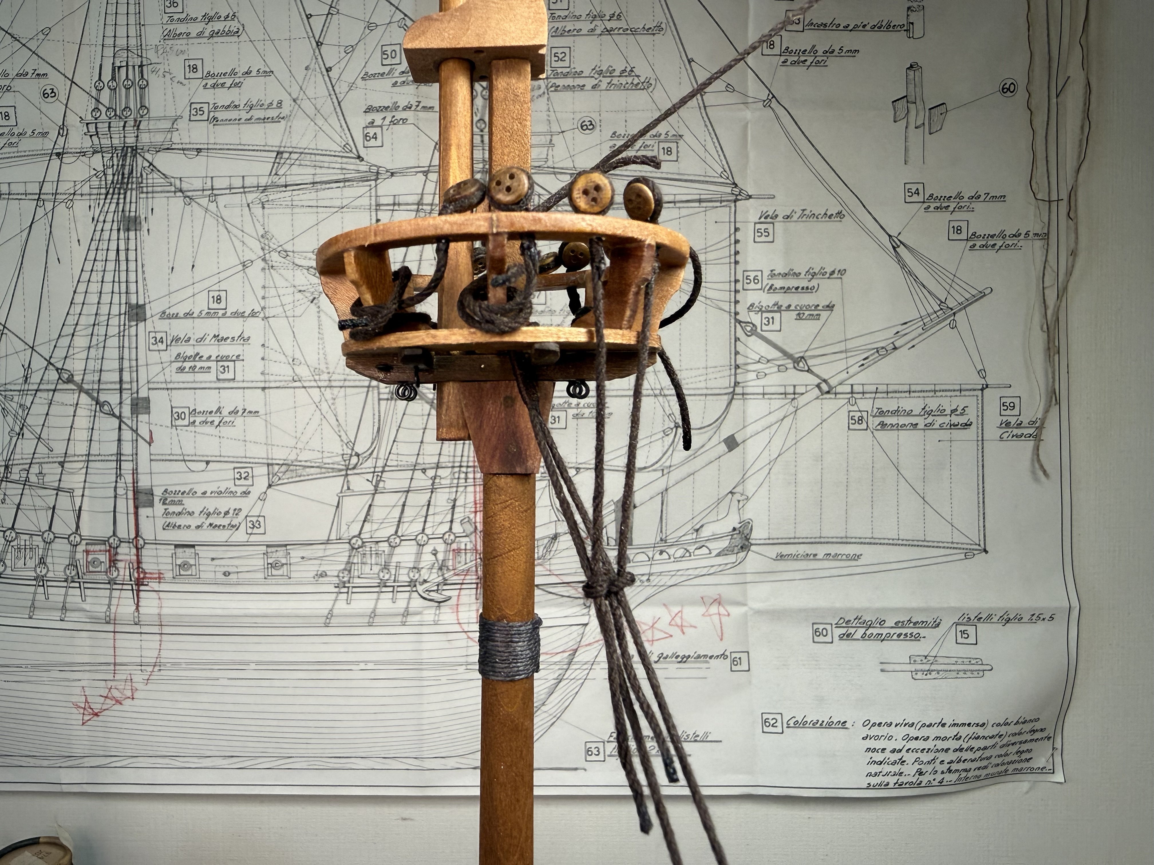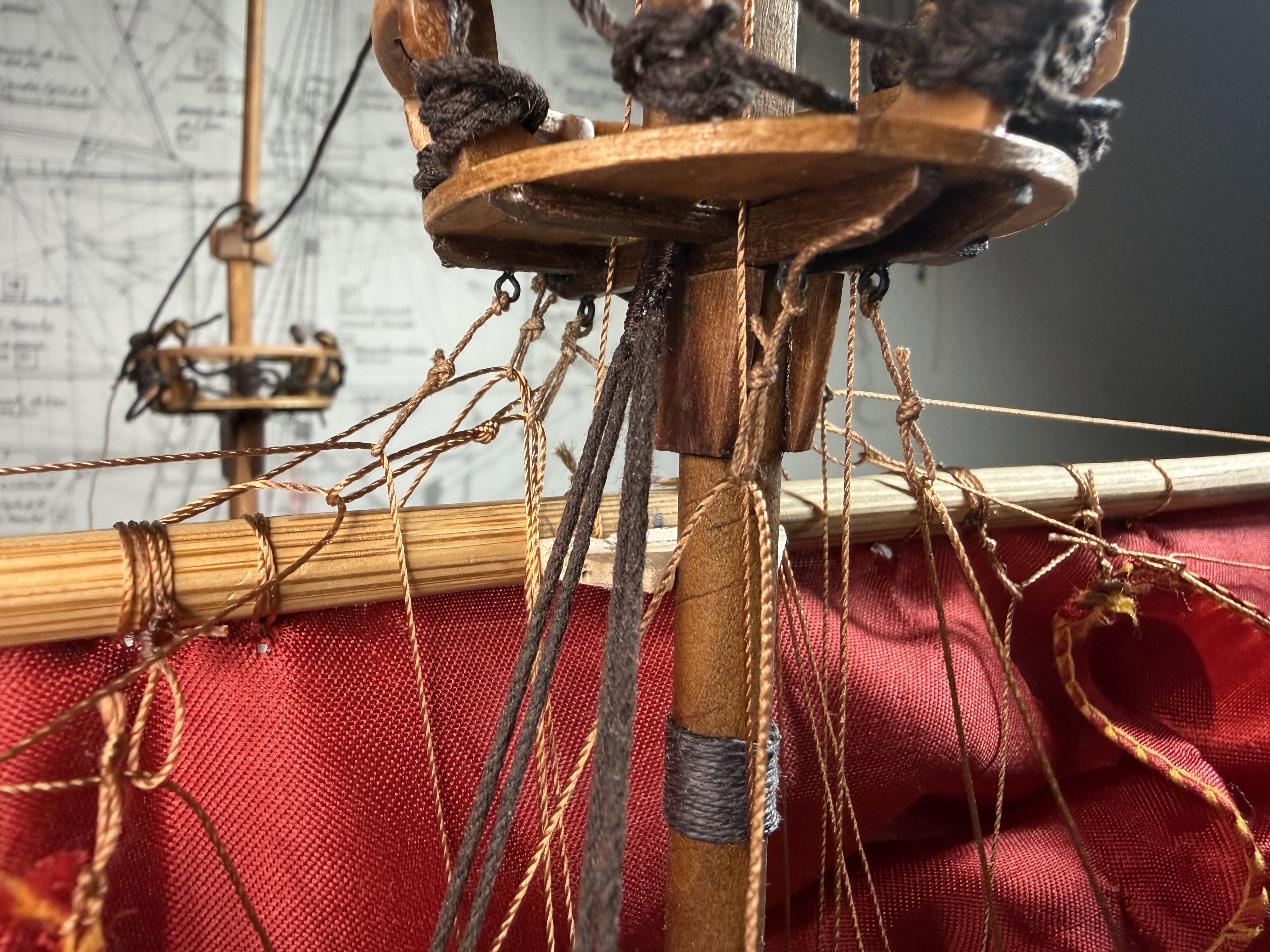 8. Next, the fore and main upper stay stoppers : small single stoppers applied. Now the dead eye fixture on the crow’s nest. I decided to follow the original plan - fixing the 5mm dead eyes with cotton thread instead of bronze. Finally, minor additions to crow's nest supporting structure.