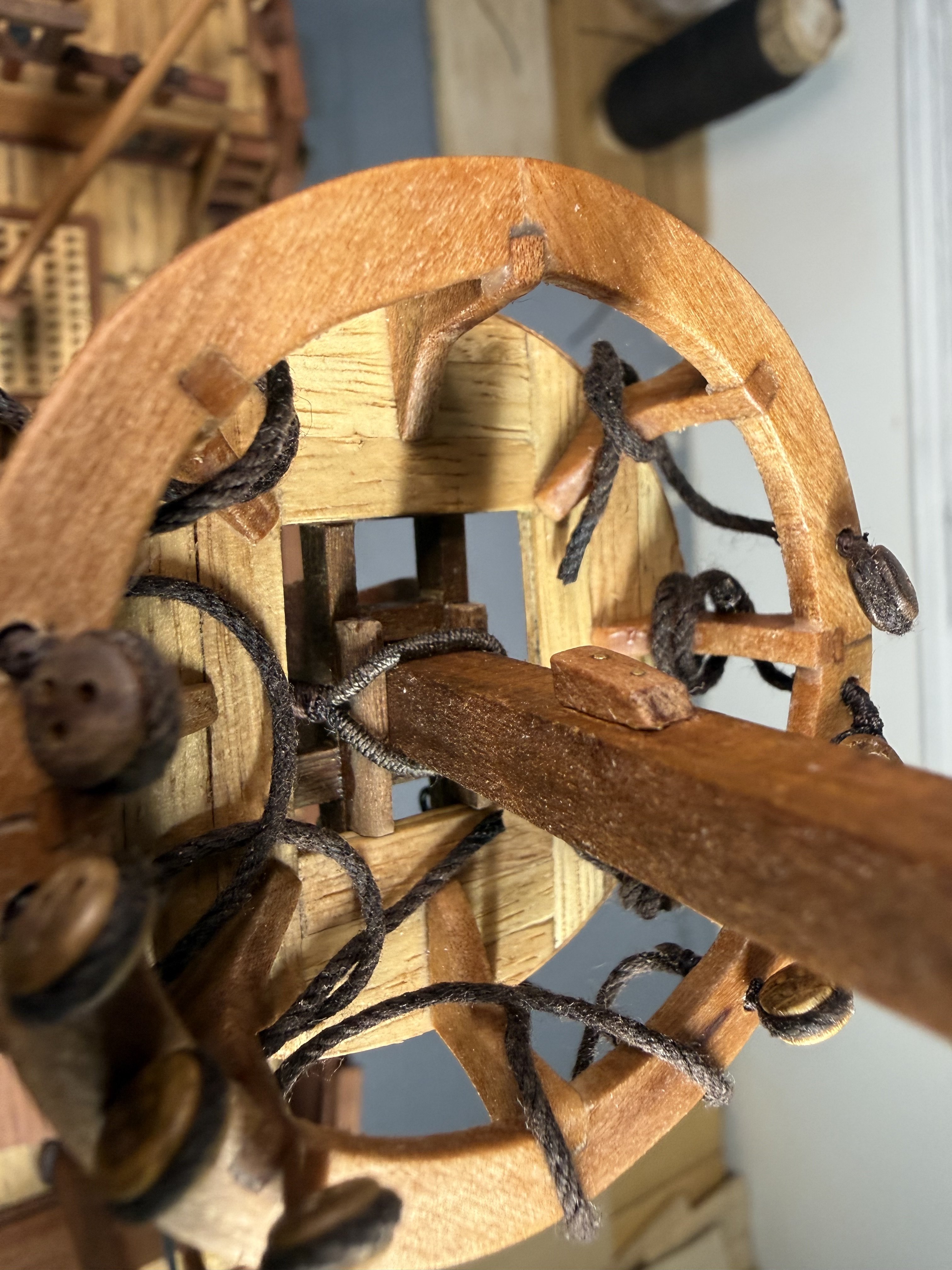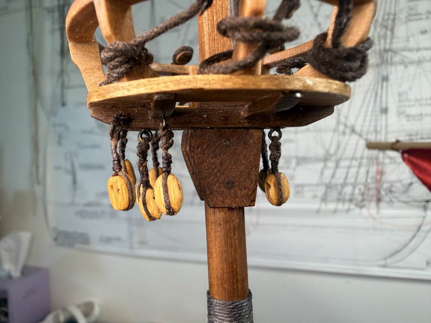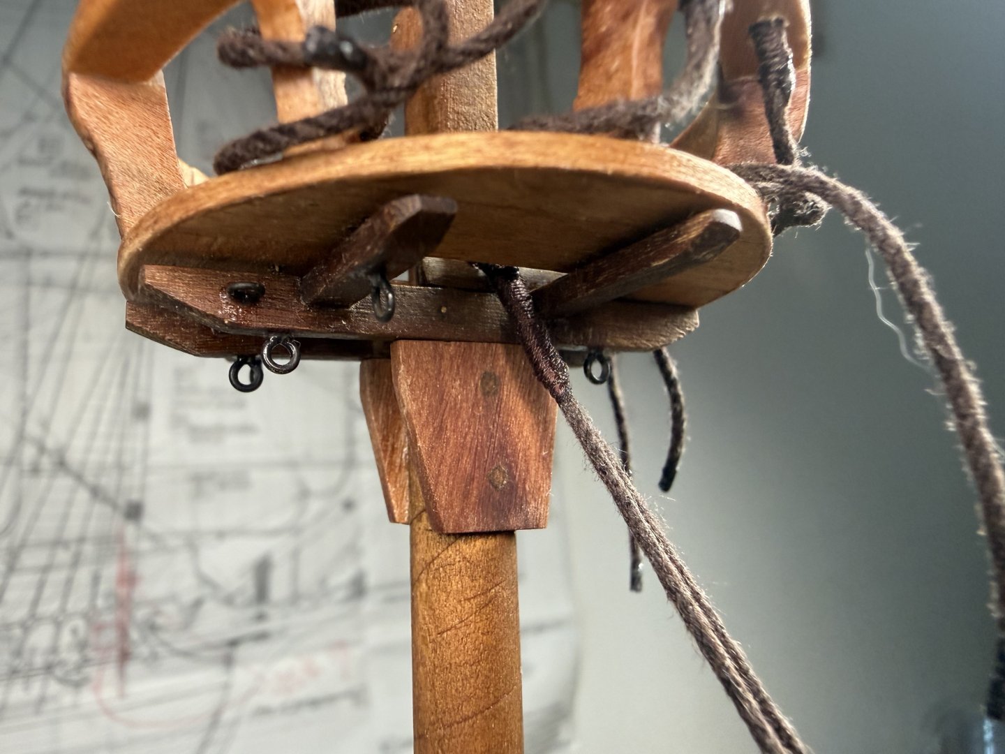 8. Next, the fore and main upper stay stoppers : small single stoppers applied. Now the dead eye fixture on the crow’s nest. I decided to follow the original plan - fixing the 5mm dead eyes with cotton thread instead of bronze. Finally, minor additions to crow's nest supporting structure.