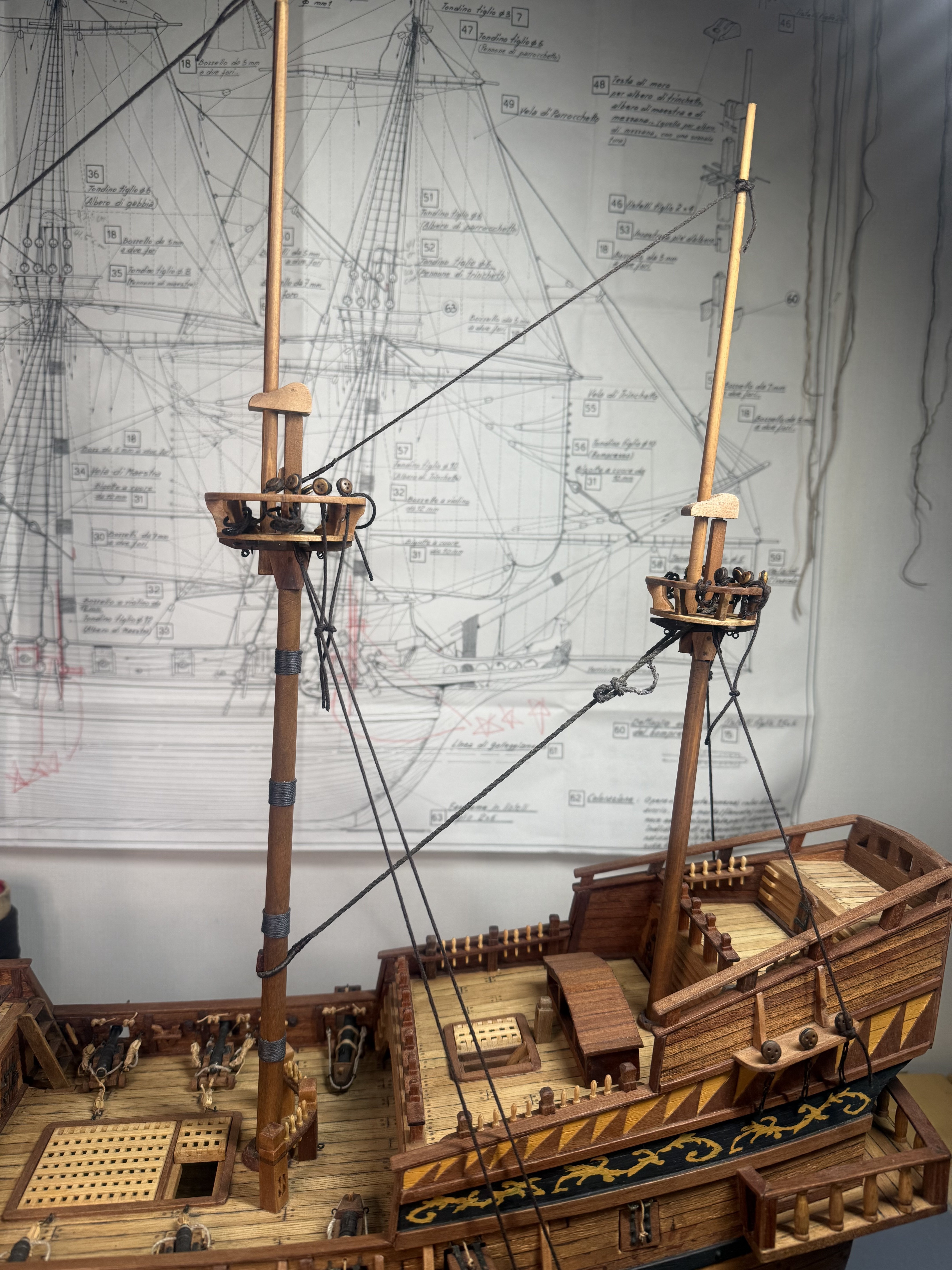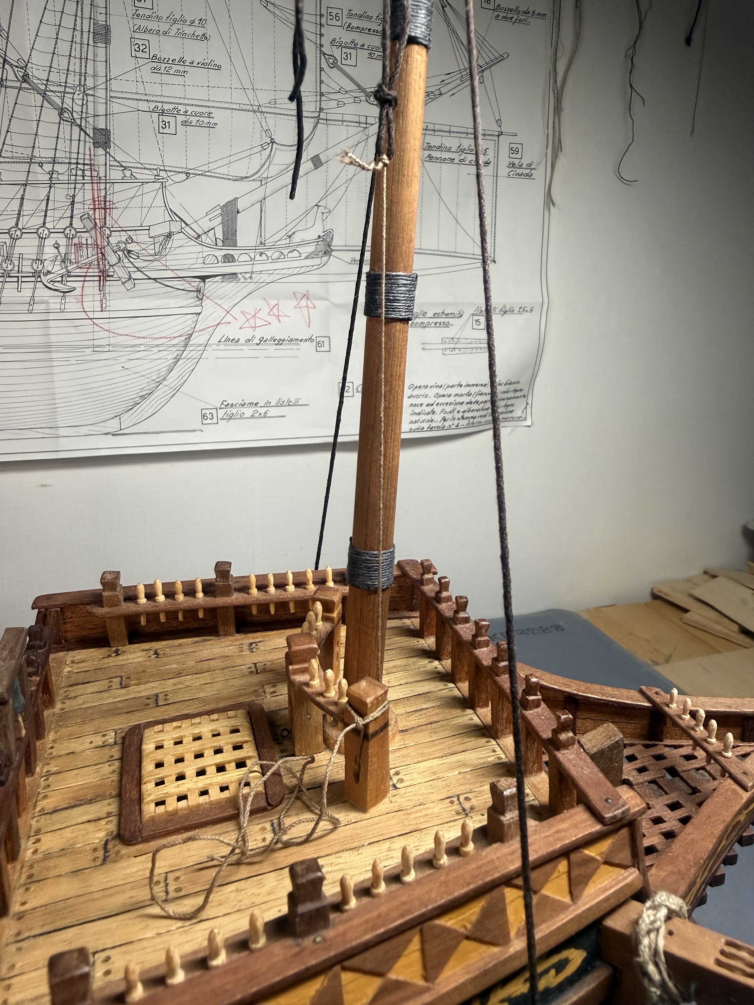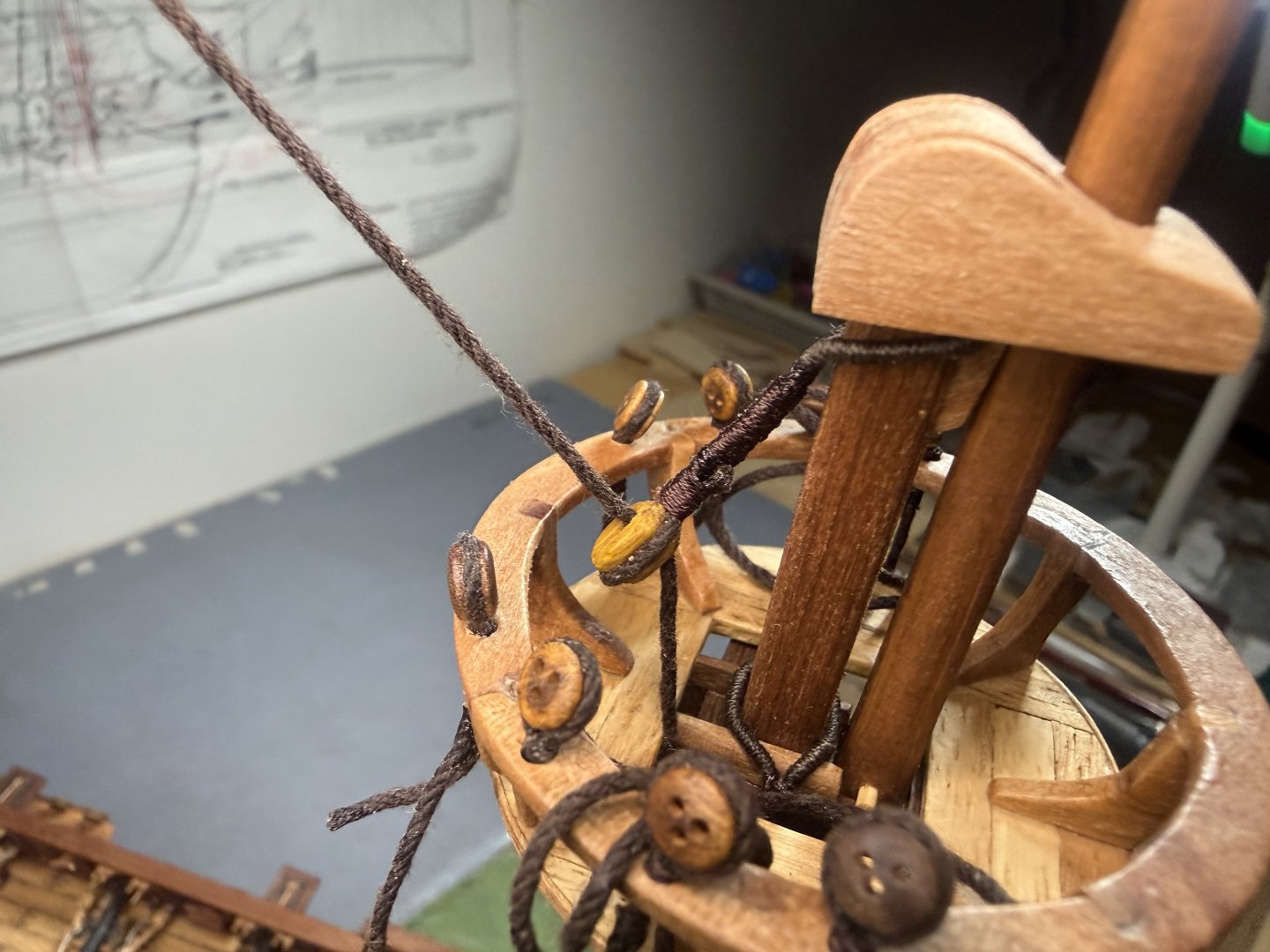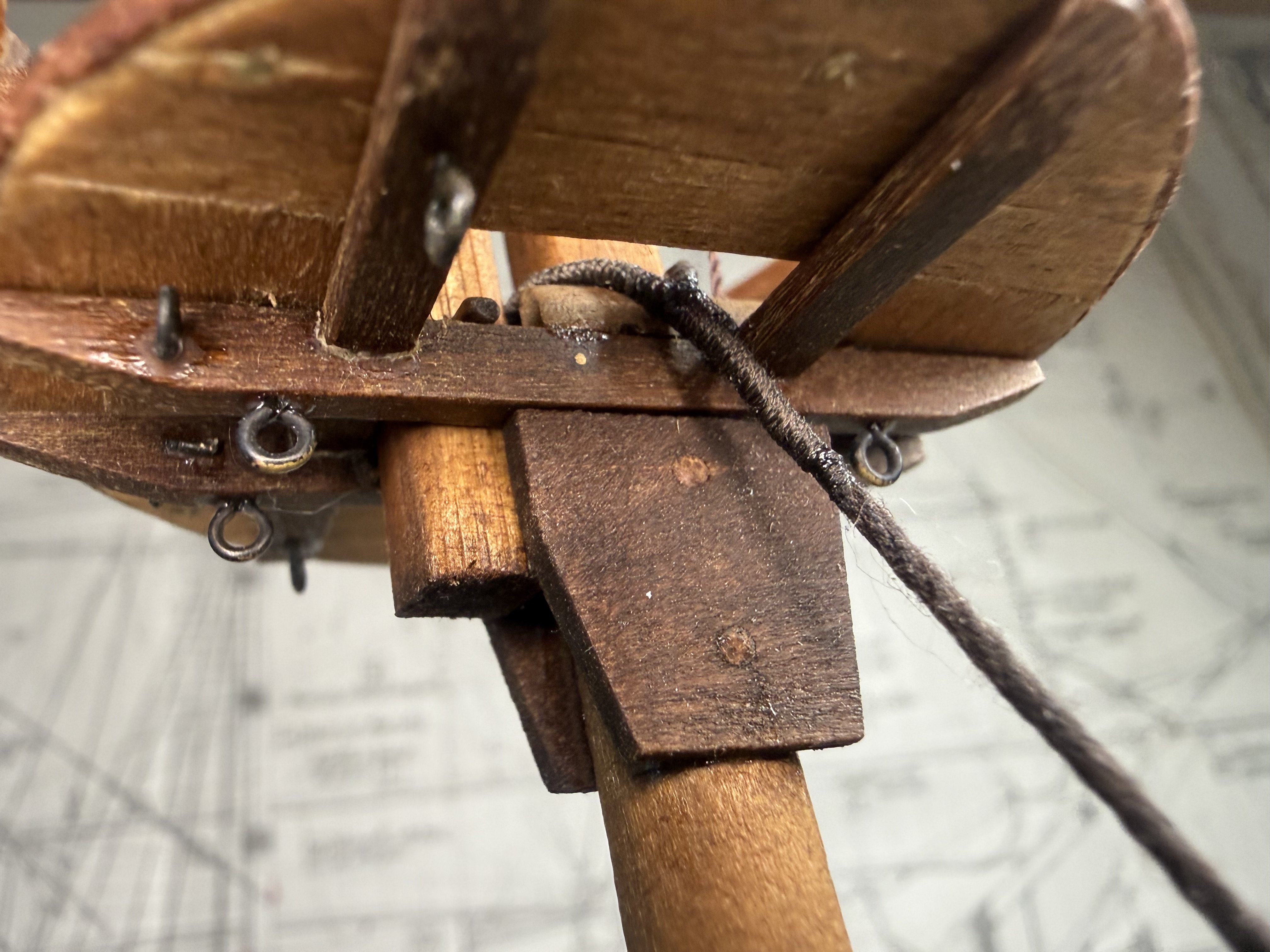 8. Next, the fore and main upper stay stoppers : small single stoppers applied. Now the dead eye fixture on the crow’s nest. I decided to follow the original plan - fixing the 5mm dead eyes with cotton thread instead of bronze. Finally, minor additions to crow's nest supporting structure.