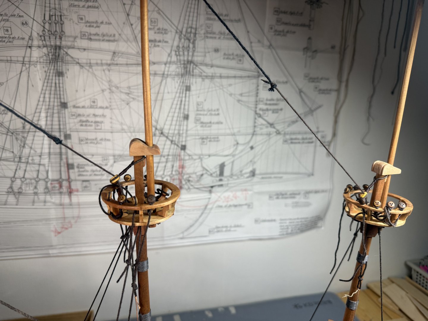 11. Hello shipmates! Just a quick update on GH1 and GH2 shipyards. The fighting tops are finally all done~ I am posting some pictures of these below. First up are the photos on the fighting top on mizzen mast. Significantly smaller than the fore and main mast fighting top. While working on the fore and main mast fighting tops, I devised a method for a quick marking of the 8 pillar positions. And when I started to work on the mizzen mast fighting top, I kind of forgot this method. Fortunately the memory came back quickly. So, I decided to document the methodology so that I don’t forget it next time. The mizzen mast fighting top on GH1 done and moving on to GH2. Pictures of both GH1 and GH2 with all the fighting tops done and put in place but not glued or fixed yet. Next, I am planning to put blocks under the fighting top structure before finally glueing things together. But, the Aeropiccola plans really lack details on rigging . Does anyone have a good picture of plan on fighting top block rigging please?