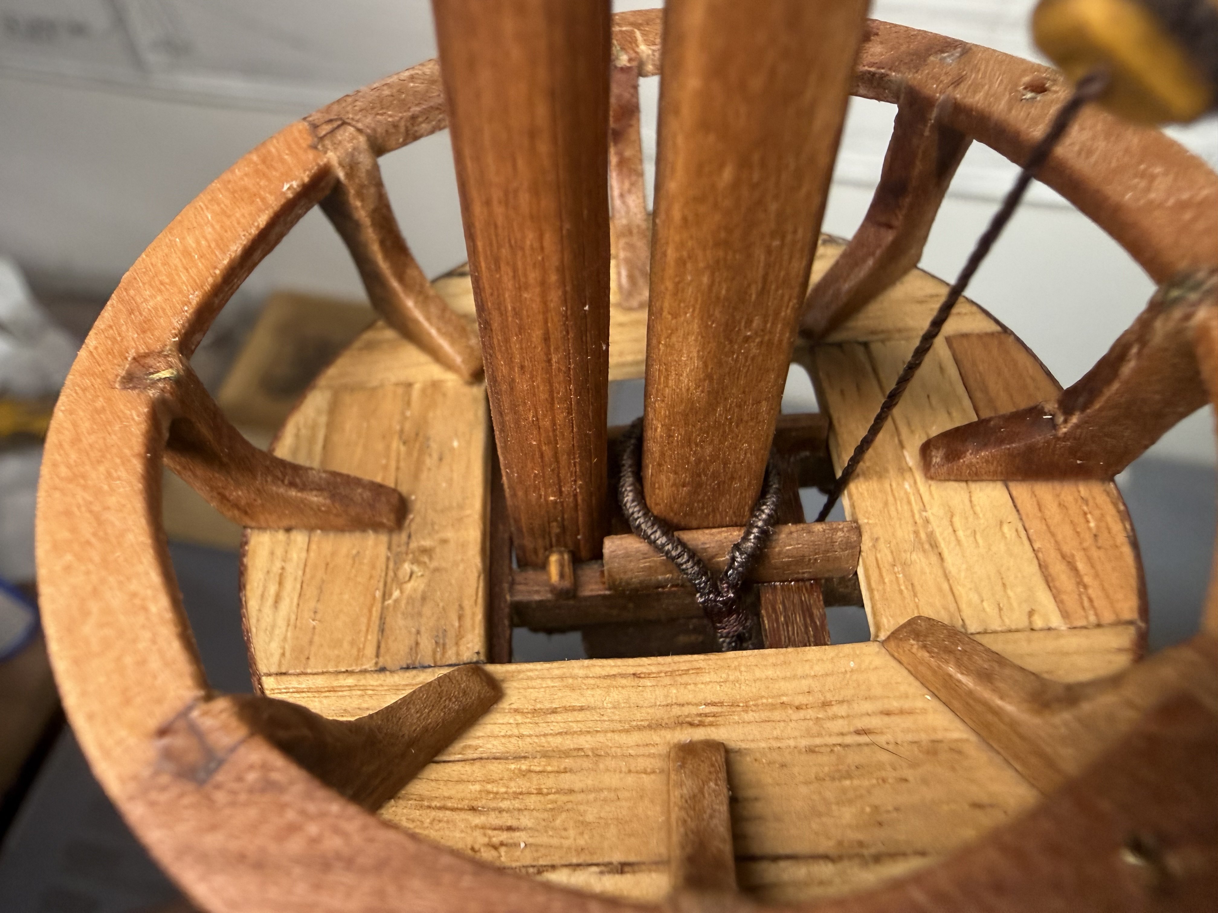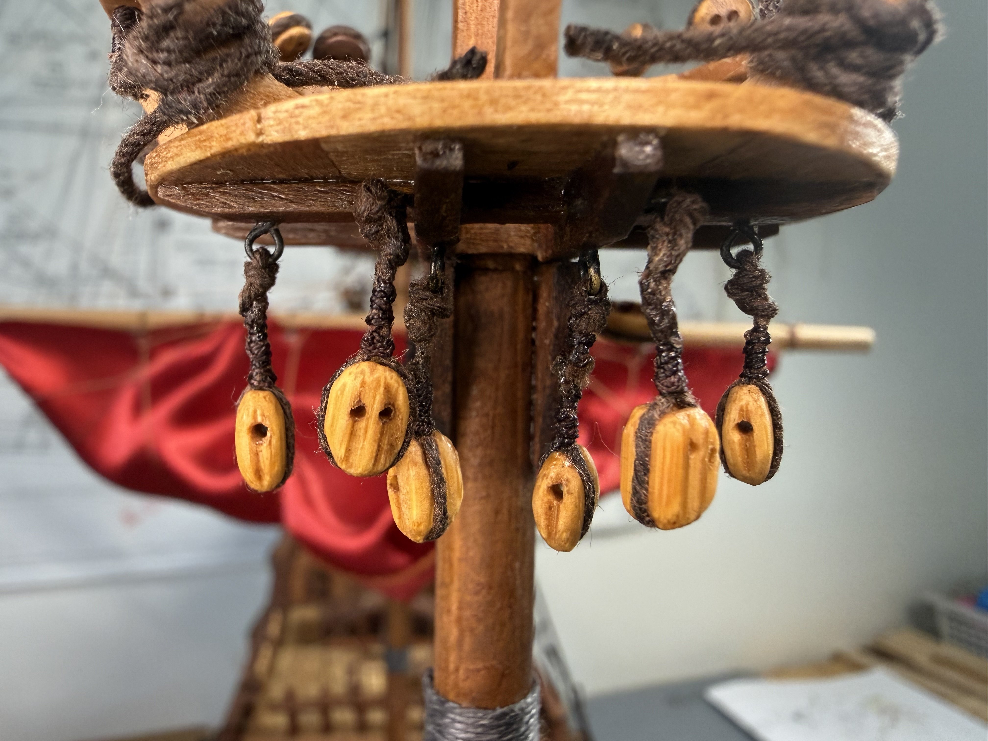 17. Moving on to the upper level of the main mast and mast cap, I realized that I almost ran out of the wooden hanger material from Ikea. And since there are no more broken wooden hangers, I had utilize a perfectly well functioning wooden hanger - for which I obtained wife’s permission.