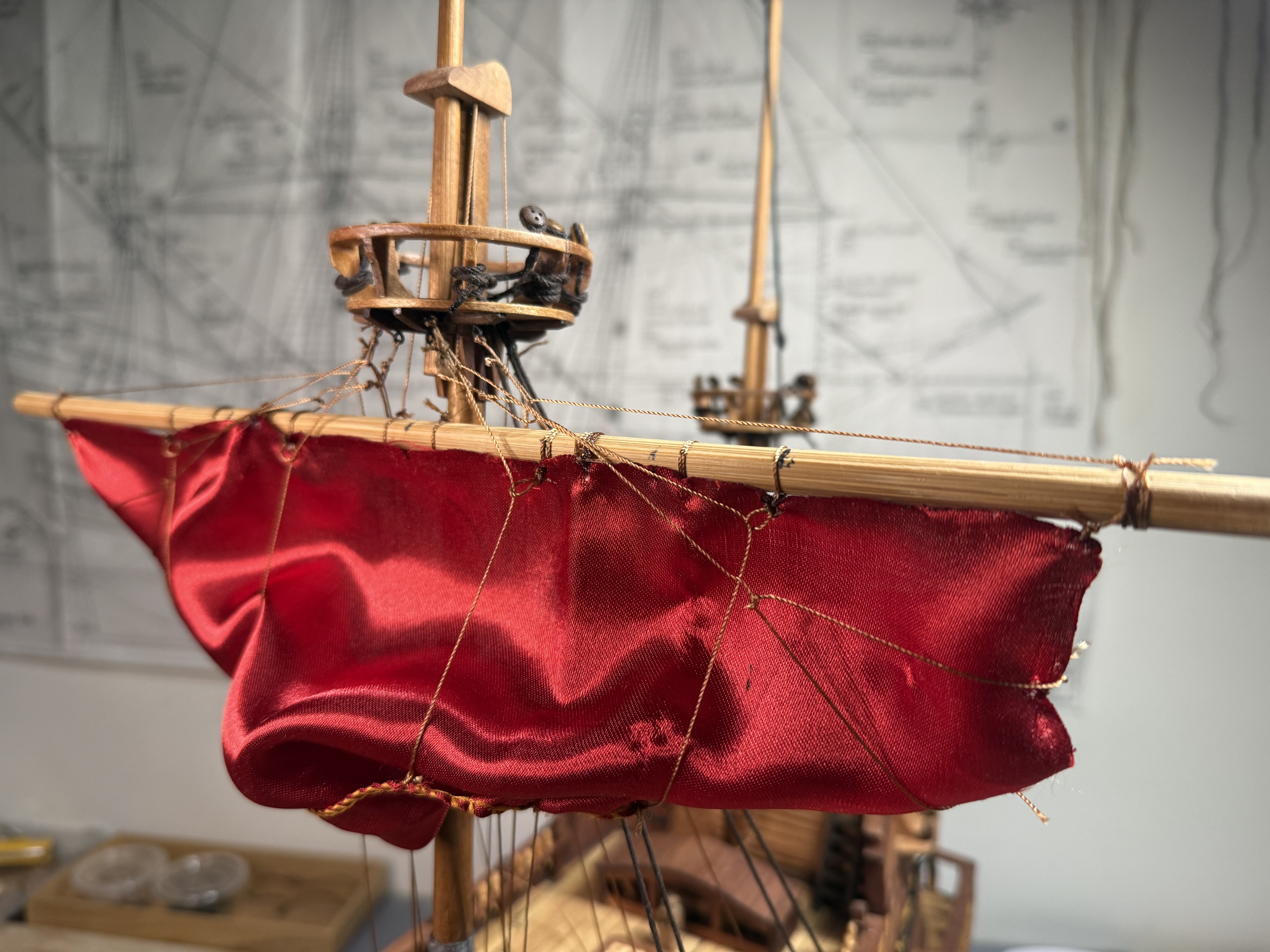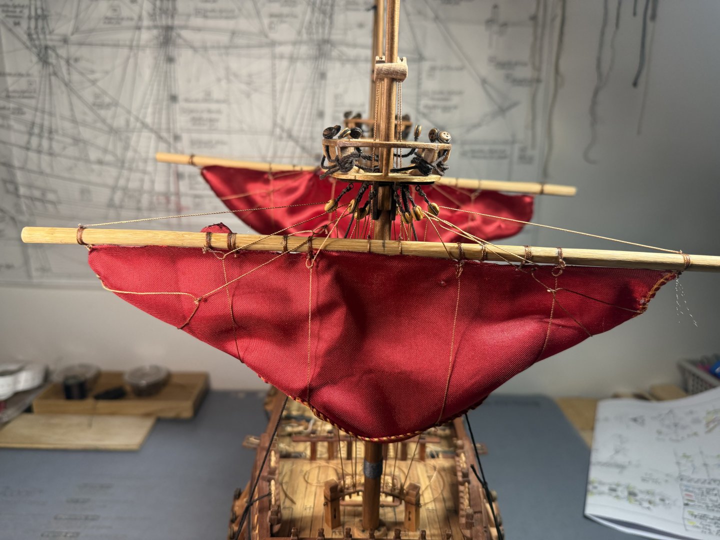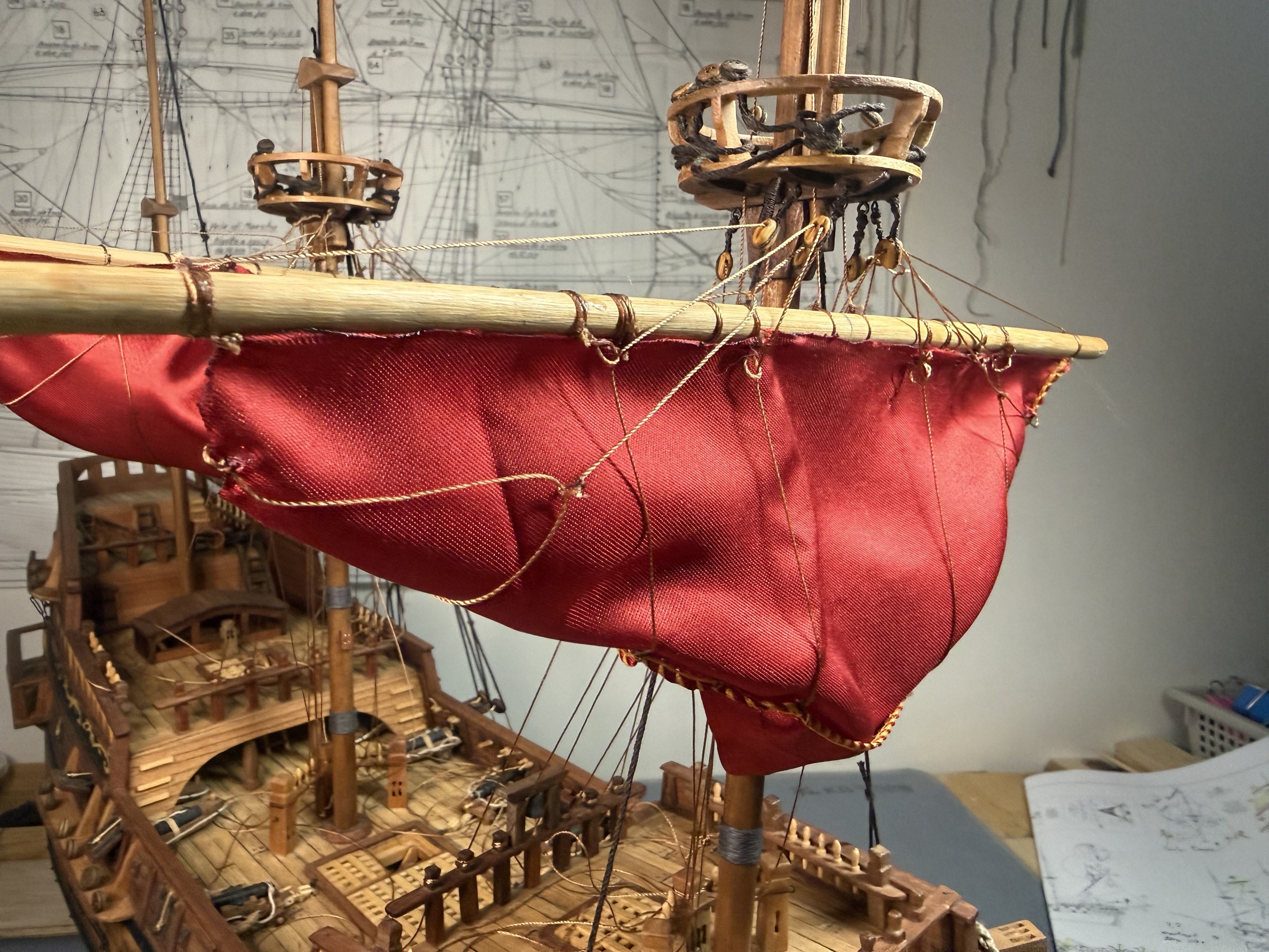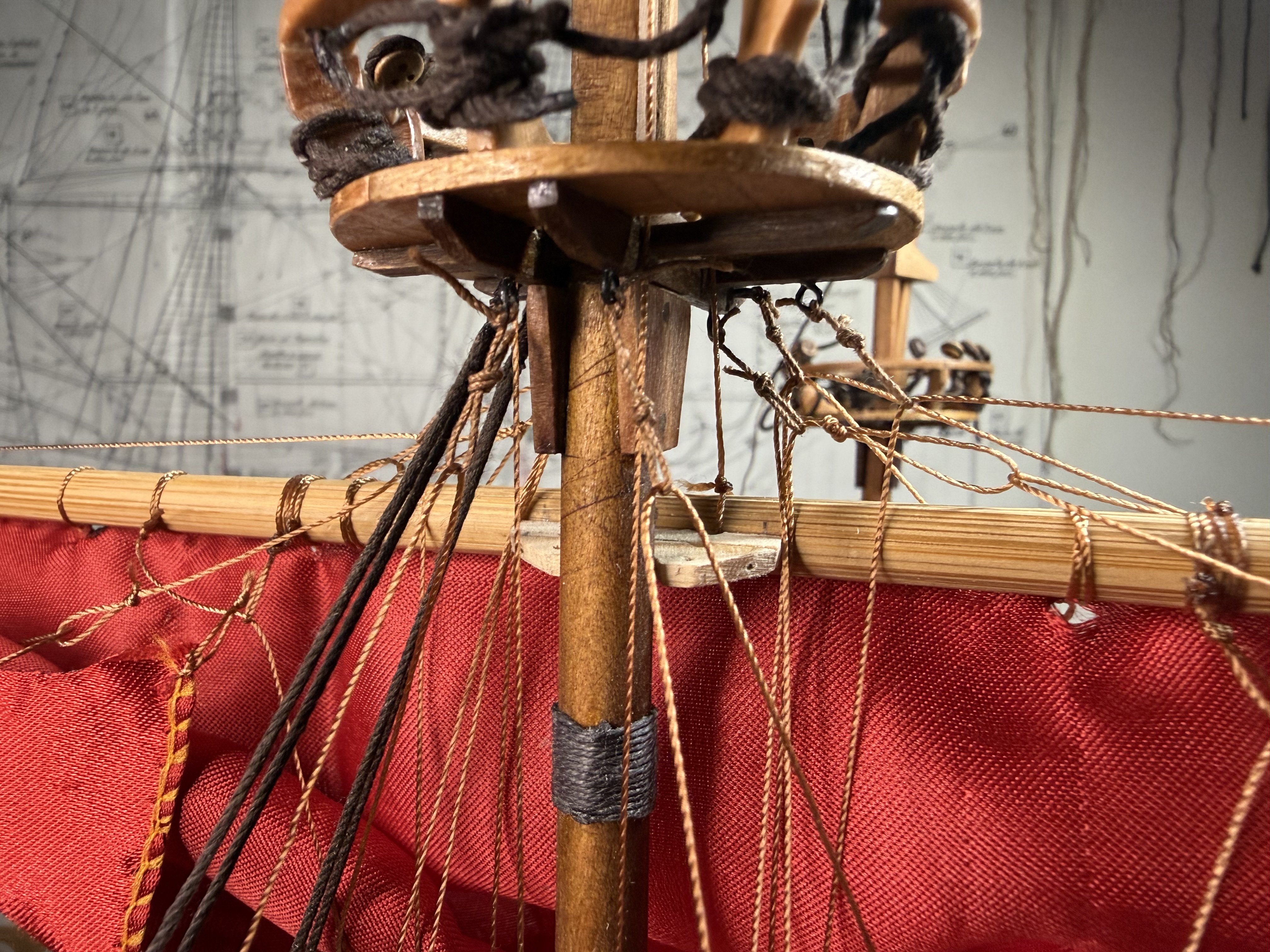 2. Lastly, I decided to go through a dry run of rigging on main sail and fore main sail as the Aeropicola plans do not provide much rigging details. I did substantial research on this through internet and YouTube - quite helpful. However, regarding the belaying positions on the deck level, I had to combine my common sense (or imagination) with the belaying plans of my previous build (Corel Endeavor). Forgive my choice of using red colored material for the dry run sheets. This red Korean traditional silk fabric was the most similar material (in terms of thickness and softness) to the ultra thin cotton fabric that I intend to use for the actual sheets. Below are the pictures of main sheet trial without blocks (with just temporary threads in place of actual blocks). Initial proof of concept on main sheet done and moving on to fore main sail dry run, this time with blocks attached. As you can see from below pictures, I employed two buntlines that run through single blocks (here represented by thread loops) attached on the yard, and passing through double blocks attached underneath the crow's nest. I also applied a slab line (at the point between the two buntline positions) on the back side of the sheet, running directly through a single block beneath the crow's nest (on the stern side). Which is then belayed to the rail behind. Let me know if this method should be reconsidered for a better and more historically accurate one. That's all for this update!