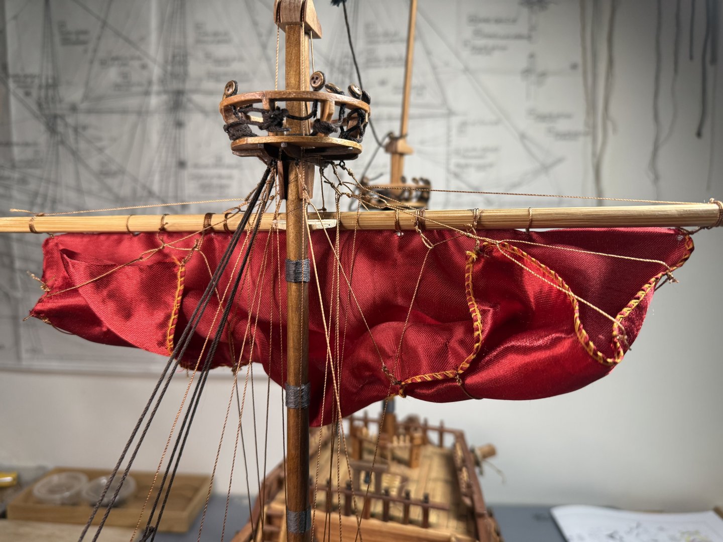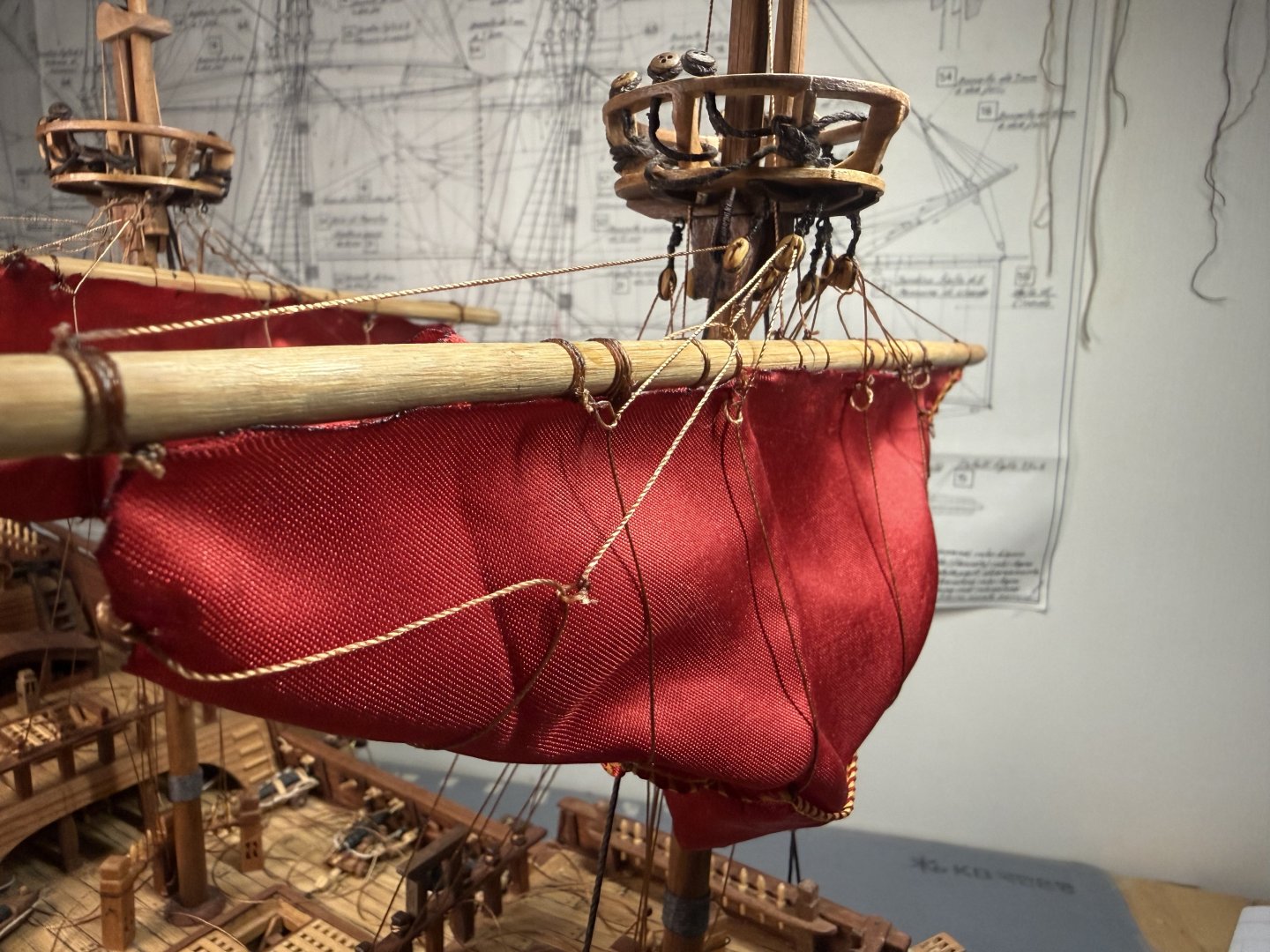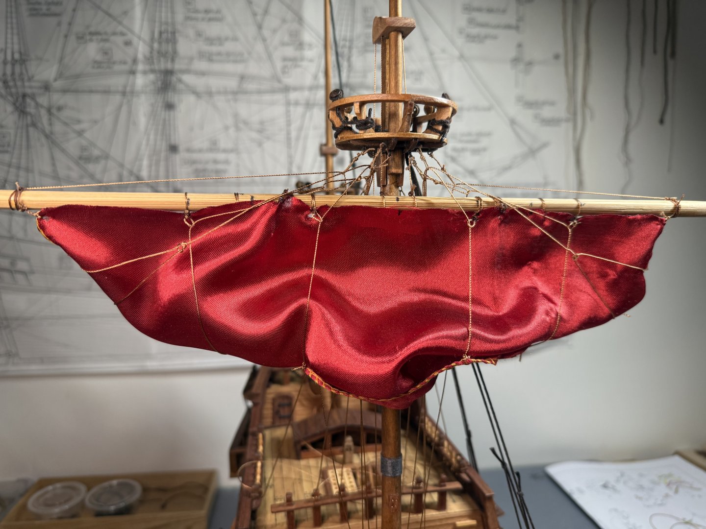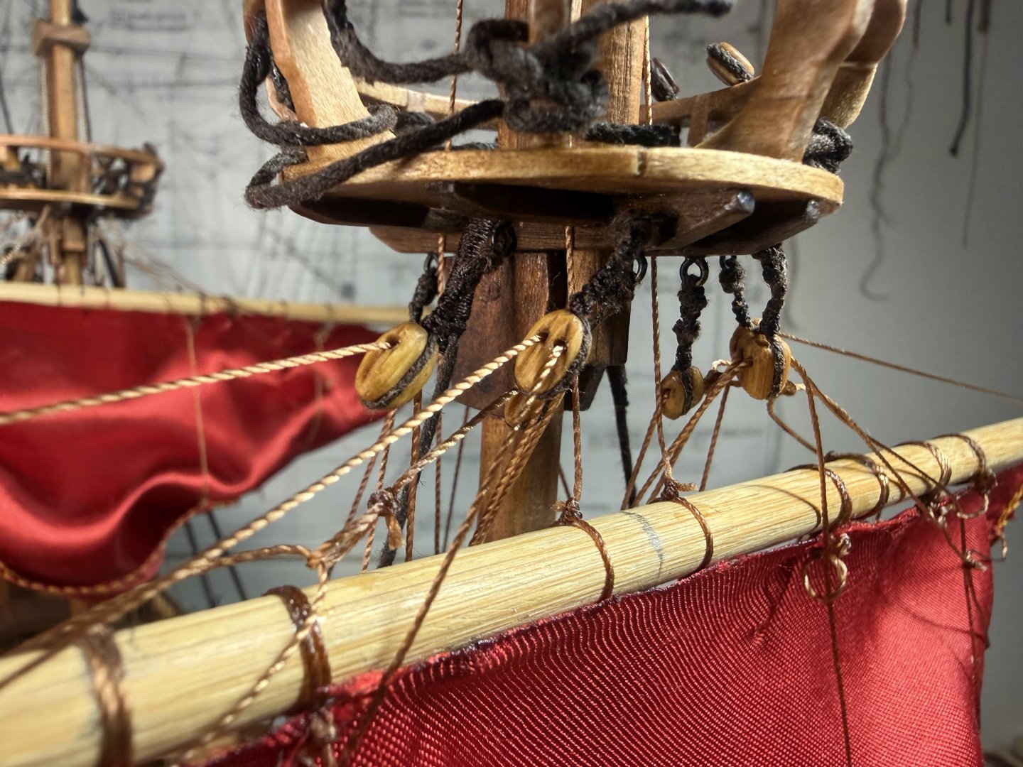 2. Lastly, I decided to go through a dry run of rigging on main sail and fore main sail as the Aeropicola plans do not provide much rigging details. I did substantial research on this through internet and YouTube - quite helpful. However, regarding the belaying positions on the deck level, I had to combine my common sense (or imagination) with the belaying plans of my previous build (Corel Endeavor). Forgive my choice of using red colored material for the dry run sheets. This red Korean traditional silk fabric was the most similar material (in terms of thickness and softness) to the ultra thin cotton fabric that I intend to use for the actual sheets. Below are the pictures of main sheet trial without blocks (with just temporary threads in place of actual blocks). Initial proof of concept on main sheet done and moving on to fore main sail dry run, this time with blocks attached. As you can see from below pictures, I employed two buntlines that run through single blocks (here represented by thread loops) attached on the yard, and passing through double blocks attached underneath the crow's nest. I also applied a slab line (at the point between the two buntline positions) on the back side of the sheet, running directly through a single block beneath the crow's nest (on the stern side). Which is then belayed to the rail behind. Let me know if this method should be reconsidered for a better and more historically accurate one. That's all for this update!