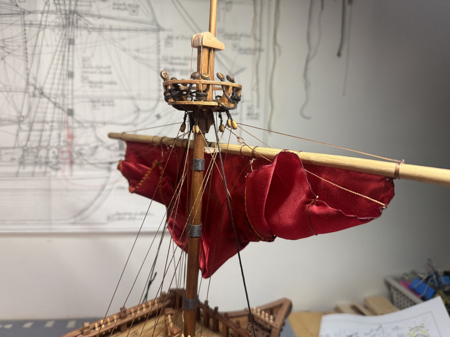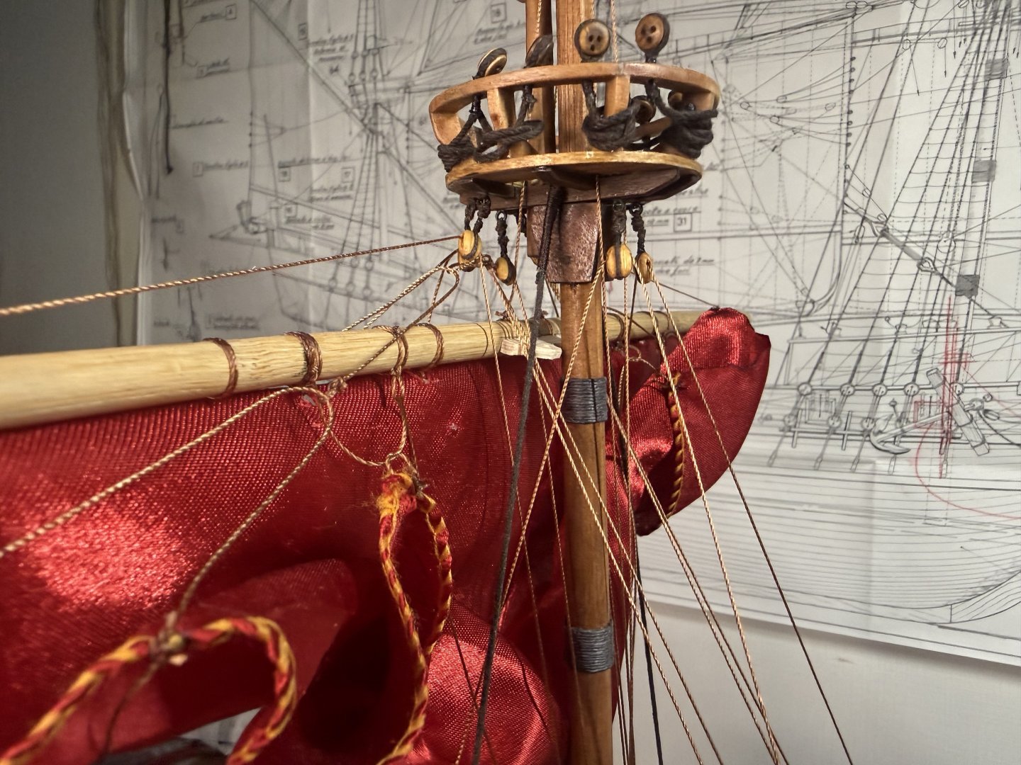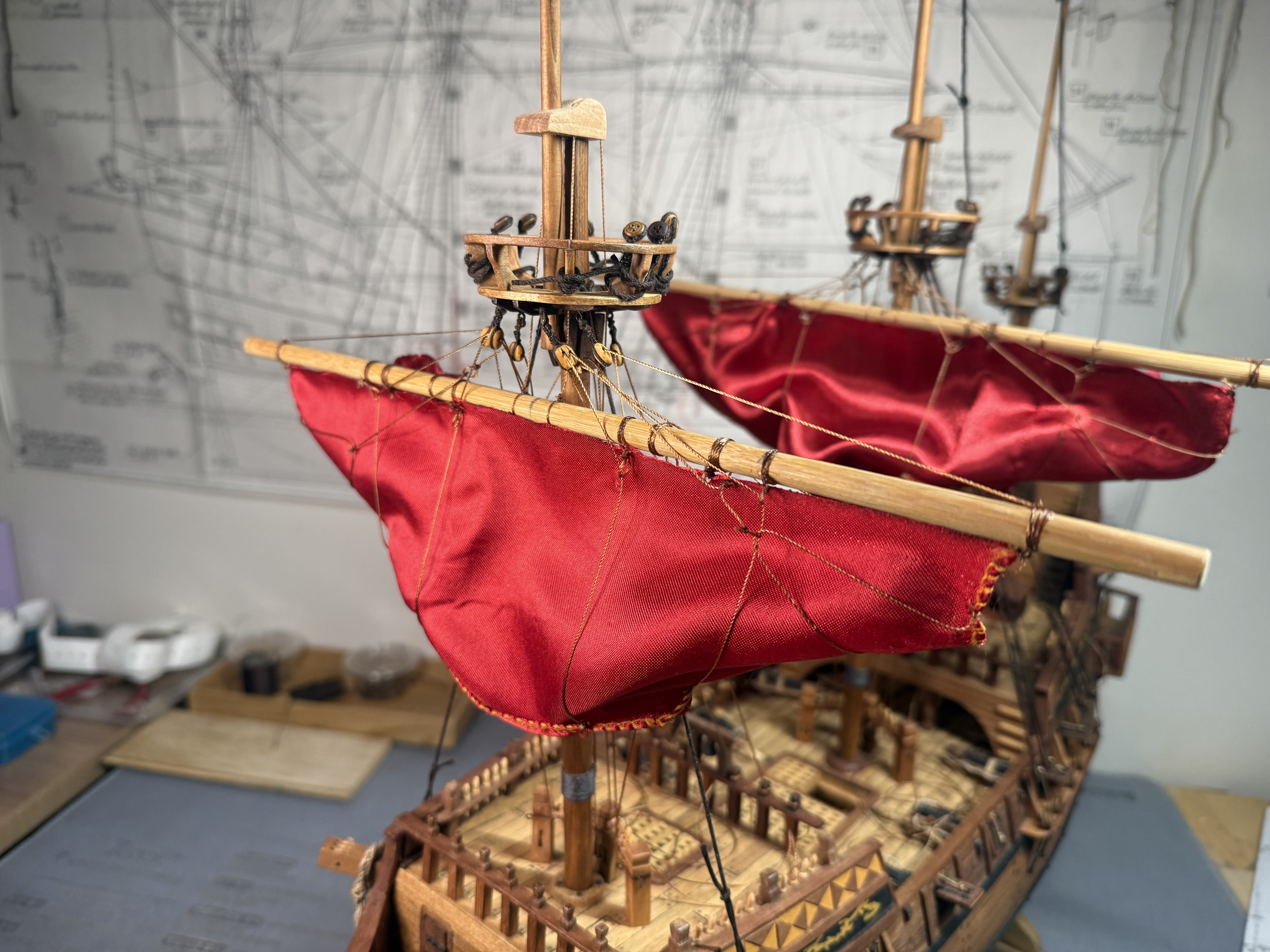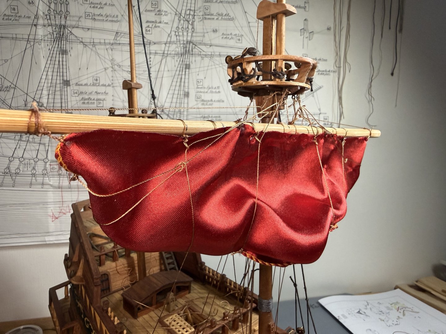 2. Lastly, I decided to go through a dry run of rigging on main sail and fore main sail as the Aeropicola plans do not provide much rigging details. I did substantial research on this through internet and YouTube - quite helpful. However, regarding the belaying positions on the deck level, I had to combine my common sense (or imagination) with the belaying plans of my previous build (Corel Endeavor). Forgive my choice of using red colored material for the dry run sheets. This red Korean traditional silk fabric was the most similar material (in terms of thickness and softness) to the ultra thin cotton fabric that I intend to use for the actual sheets. Below are the pictures of main sheet trial without blocks (with just temporary threads in place of actual blocks). Initial proof of concept on main sheet done and moving on to fore main sail dry run, this time with blocks attached. As you can see from below pictures, I employed two buntlines that run through single blocks (here represented by thread loops) attached on the yard, and passing through double blocks attached underneath the crow's nest. I also applied a slab line (at the point between the two buntline positions) on the back side of the sheet, running directly through a single block beneath the crow's nest (on the stern side). Which is then belayed to the rail behind. Let me know if this method should be reconsidered for a better and more historically accurate one. That's all for this update!