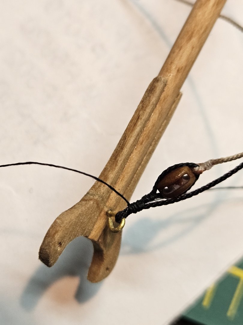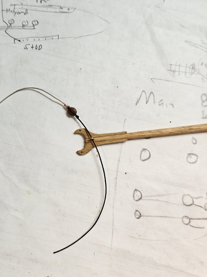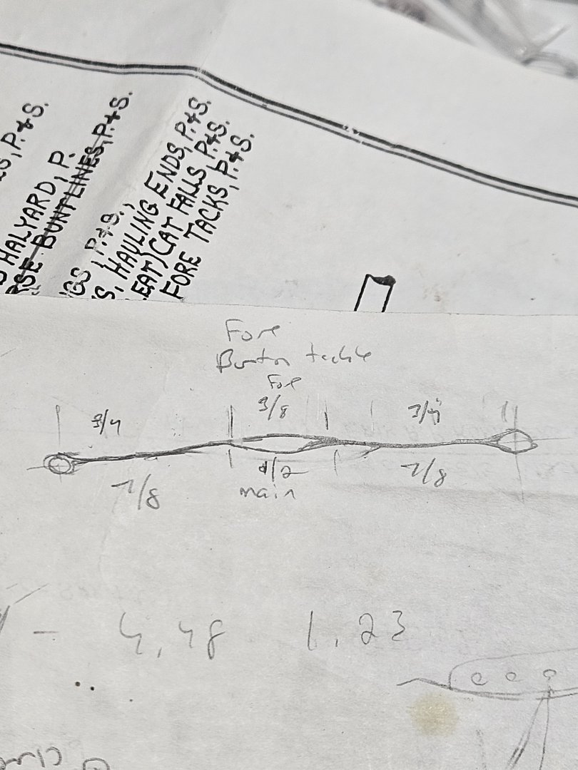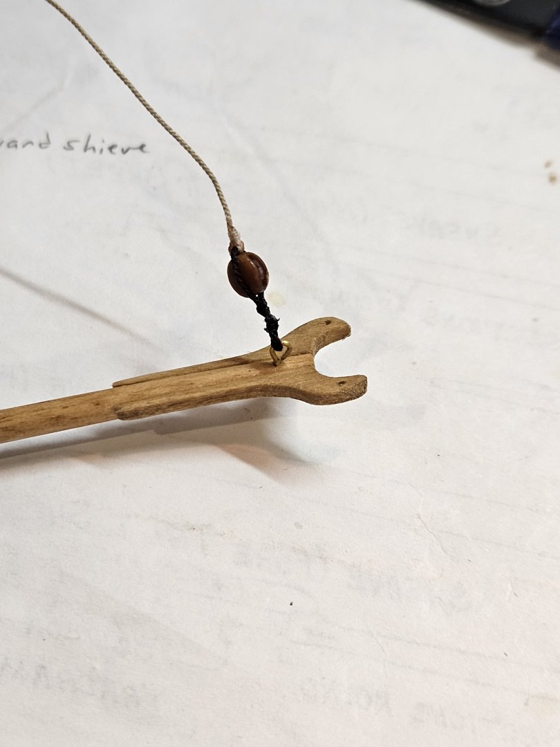 Happy New year all! This is the first progress update of 2025 for the Fair American Model ship. Which makes this the start of year 6 of the build - Seriously hoping to finish by the summer! Anyway, I'm starting on rigging the yards, with the Main Lower Yard. There are 2 buntline cringles on the sail, so I need two blocks each side. these are 3/32" Singles. Looking at the Niagara plans I purchased, these blocks are nearly vertical above the cringles, or at a slight angle, so thats how I arranged them on the mast Of course once I attached them, they're facing the wrong way. They need to have the block holes going vertically, to allow the rope to pass straight up to the top. This was because I only used a single knot at the top of the block when stropping. I didn't think about that. So I removed that block and added another knot, making sure the ropes go parallel to the block holes. Now when I added them to the mast, they're facing the right way. I also had to tie them so they stick forward just a little so the rope can reeve through nicely, while also being aware of the orientation of the foot ropes and cleat side, so it's not backwards. Here is the finished yard with buntline blocks and then a single leechline block on the outermost end of the yard. The sheet blocks were next. I used 5/32"blocks for these. The rigging plan doesn't specify sizes of blocks, but I later found an excel sheet that ''someone'' created that I used for a guide of rope size and blocks, shown later.... Additionally, during my research and learning about model ships, I saved this snippet about general rigging. It shows some basic blocks and locations on the yard. On the Niagara plans, the Clueline block is on the Inside of the yard, and the sheet is outside of that. In other ships, I've seen it the other way, where the sheet block (the bigger block, is the one closest to the center of the block. For mine, I tied it off outside the cleat, where the foot rope ties in. The sheet was 5/32" and the clueline block was 1/8" single block. Tied and glued in place. The braces were next. How I strop the blocks is, again, fairly simple. I'll take the rope starting at the bottom, over hand knot it on the top... Then add some CA glue to secure it. I'd put the trimmed/stropped block into a little jig with .031" drill bit, and hold the two ends with tape. Then pinch and CA glue them close to the block and let it dry. Then I can take small black sewing thread and make a neat little seizing. I have to knot the first loop and glue, make a couple more loops, then knot the last one and glue. After which, I'll trim all the loose ends up. I'm pretty happy with the look. That's one!!! I'll look at the plans for the lengths of the braces and try to make a loop to that size. This is trickier. I had to sort of guess the diameter of the loop before I knotted it, so that it will fit over the end of the yard and not be too tight or loose. But I made it work on my little jig. The reverse action tweezers were handy with adding some small amount of tension before I glued things. 2 braces done.... The first time I added them and glued them to the yard, they were facing the wrong way!!! Luckily I noticed/remembered the orientation of the main yard - according to the rigging plans these ropes are braced on the Foremast, so they need to go forward. Thats it for today....I have more progress with this one yard, but that'll wait for another post in the future. Thank you for reading and following along - Jason -