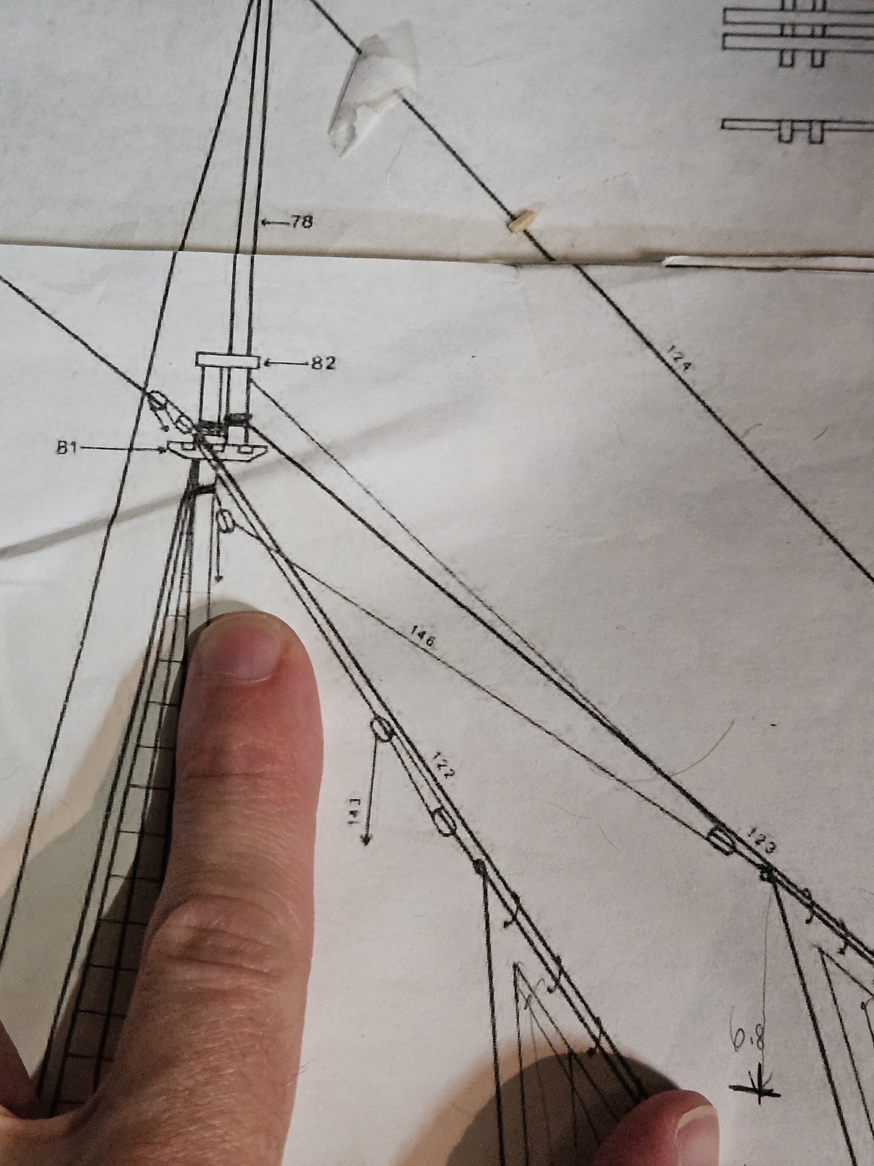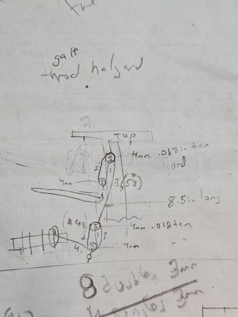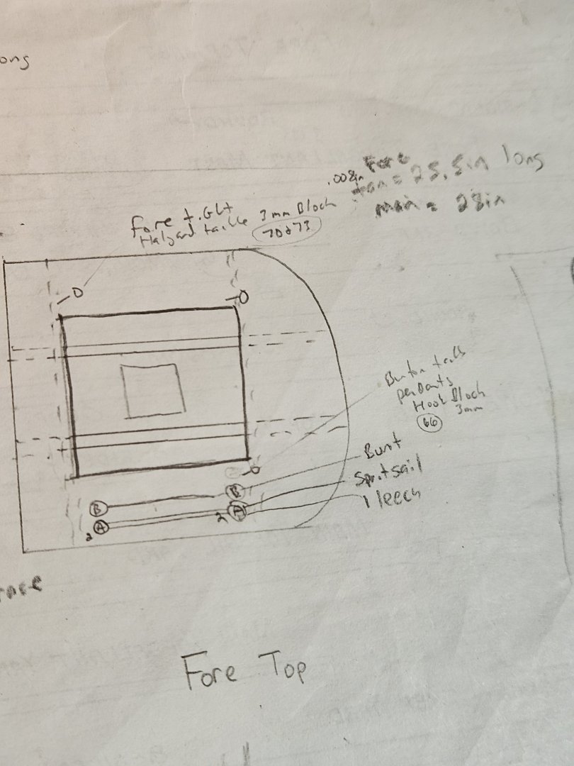 Continuing to pre-rig the Fair American model ship. Before the shrouds are rigged and in the way, I want to get as much on the masts and hull as I can. There will be sails needing additional halyards, so I'm attaching those now. The jib and main stay sails are first on the list.... For the stay sail halyard, I'll need a single block on an eye mounted under the main top....just a small one... I bend these by hand using the ultra fine long needle nose pliers: wrapping annealed wire around the very end of the pliers, then close the eye and then bend the stem straight. Trying to attach a block once the eye is in place will be near impossible to reach, so I'm attaching it to the eye first. Then it gets glued under the top, on one of the cross trees. I moved on to the fore and main burton tackle pendants. Based on the plans and estimating how much length needed to go around the mast head, plus some extra. I wrote the dimensions for Fore on top and Main under. I used the serving machine to make the .030in rope needed. I'm now using the fine black thread for serving, but I still struggle to make satisfactory eyes without them looking bulky, like the right one. After measuring lengths and taping in place, I'll cross over to form a middle eye, add some CA glue and 'tack' to each other. Then follow with seizing with fine thread. The result, again, isn't as neat as I'd ideally like, but it'll have to do. I'm figuring this out as I go, with no clear instructions on how to do this work. When slipping over the top mast, I ran into a problem with the fore burton tackle. the chocks. They were just wide enough to give me trouble sliding the eye down. I REALLY had to work on it, without breaking anything, but I got it down. Used reverse tweezers to hang the ends so they dangle more naturally. They're on there now! Before I do the main lower shrouds, I'm going to need to have access to the gaff and main boom for the spanker sheet now. The throat halyard is in a particularly tight spot. I made a very crude drawing of what I'll need: A block on the gaff jaws, and under the main top, a runner to another single block, with starting tackle for a double block attached to an eyebolt on deck, then belayed to the pin rail. Lots of lengths to get right, so I make sure to add in extra, just in case. You'll remember from several posts back, about how I attach the running and standing rope end (tan and black respectively) to the same block. The reason is the running end has to START on this block and go down; the rope needs to be attached to the block ahead of time. Now I can feed it through the eye made in the gaff jaws for hauling (halyard) up the mast. I'll need to figure out how to do a parrel of some kind later on, because obviously the instructions make no mention of one at all. Seizing the standing rope end over itself with a few turns, then trim close. That's as clean a job as I can manage. And on the after end of the main top, I added a single 4mm block, similar to the stay sail halyard block. This one was tied to the trestle tree and trimmed close. Still working on halyards, and the burton tackle pendants had to attach/hook somewhere on the top. I made a crude schematic for that too. Again, I won't easily be able to access or attach these blocks later on, so I'm making the blocks with running ends, and attaching to eye bolts and attaching the eye bolts to the top now. I won't let the running end of the halyard just hang there, so as with other rigging, I'm coiling it up and labeling with painters tape for later. Here is the finished result. You can see the empty eye bolts for the burton tackle ready to be hooked later. These details are not shown in the spar plan, so I'm discovering these as I go. So it may not look like a ton, but making all the blocks takes time. Plus double checking the measurements and looking at books and the Niagara plans as a guide of how rigging is done takes time. These details can't be rushed. I realize much of what I'm doing is probably not historically accurate, but rather made-to-work-for-me. Do other modelers have this much trouble knowing where everything goes, or is it just experience? As a model ship newbie, I'd love to hear how others have faired. Thanks for reading along. - Jason -