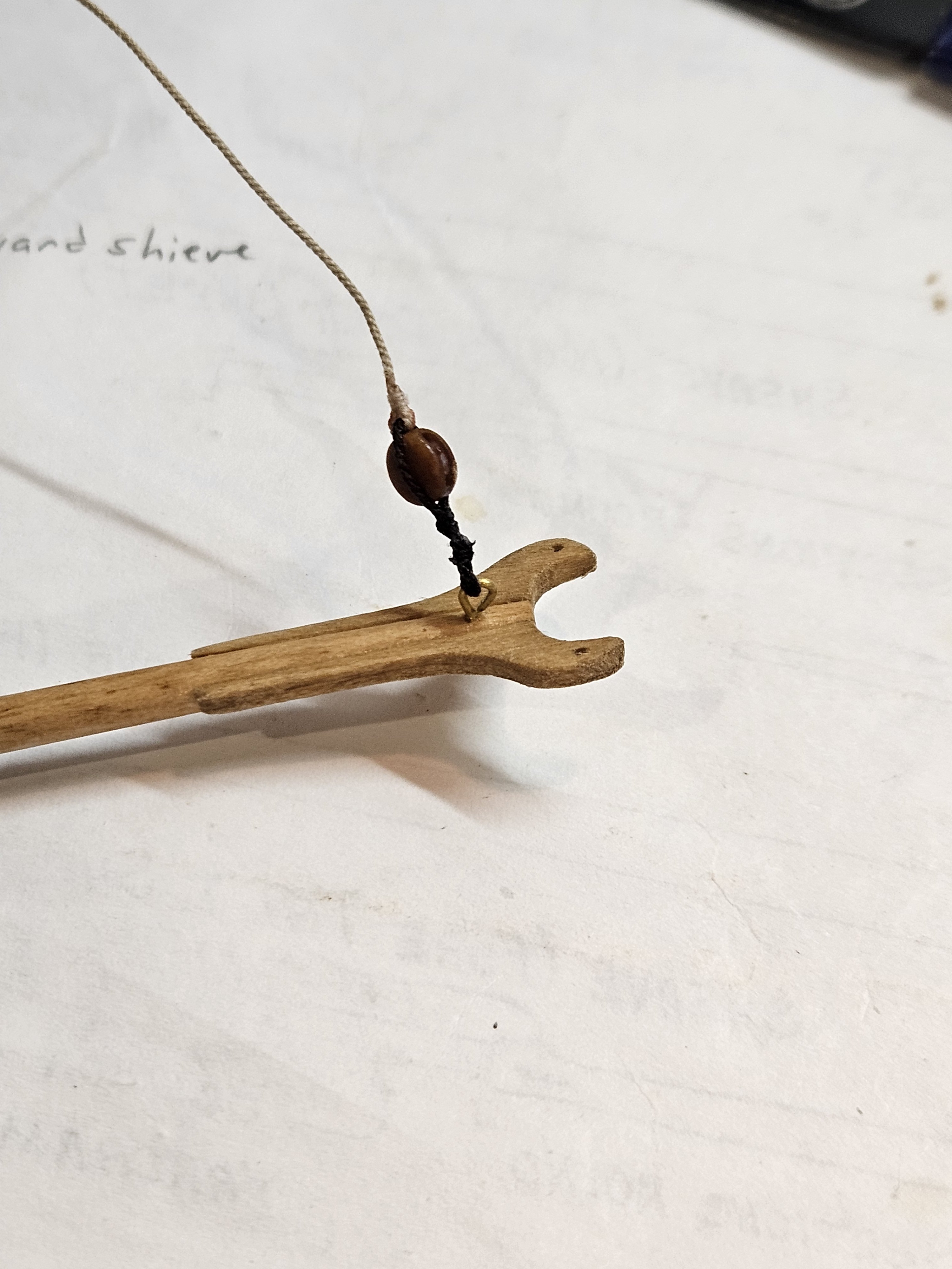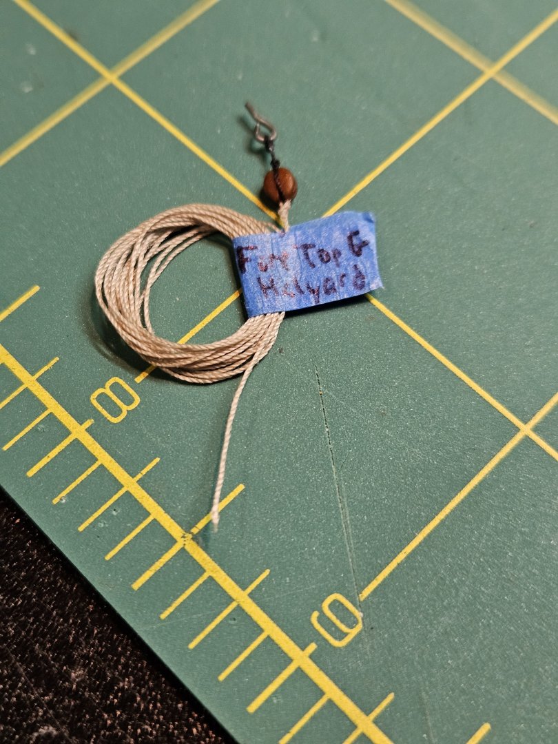 Continuing to make progress on the Fair American: Prepping the fore Topsail with buntline and leechline blocks. It's much harder to clovehitch these underneath the sail, once the sail is on the yard. I could have attached these first, and tucked the sail underneath, but I felt that they'd get in the way. I ended up using a needle to help feed the rope under the boltrope of the sail. Sort of worked, but still difficult to 'grab' the ends and also have them dangle in a way I was happy with. But it's done, and I'm happy with how the blocks hang. The leechline blocks are about halfway along the head of the sail, on the yard. The buntline blocks are not directly above the cringle, but just inward. I also placed it between other existing ropes for clue/sheet blocks, which are aft. In continuing to prep for the sails and all it's components, I am also going to add bowlines. The blocks for these need to be in place on the masts before I really get to the rigging. I'm doing all of this up front - i hope it pays off. We have the Fore Topsail bowlines, which go forward to the bowsprit cap ''somewhere''... The Fore Topgallant bowlines, which go to blocks on the Jibboom And Fore course bowlines reeve through blocks behind the Fore Stay... On the Jibboom, I already had a block for the Topgallant stay, but I am repurposing it as the Jib staysail downhaul, and the existing holes/sheaves will be for the stay itself. There is VERY little room up here, so attaching the block(s) were extremely challenging. The strop-rope kept un-looping. itself. Kind of crammed in there, but I got it done. Two bowline blocks ready for 'service'. Though they don't exist on the original plans for the bowsprit cap, I added two eyebolts to attach the topsail bowlines blocks to. Forced some room in for the remaining Fore Course bowline blocks. I'm looking at the wealth of books and plans I have for the belaying points for bowlines. With the existing pins on the ship now, I may end up doubling up on some pins. More on this later. Moving on to the preventer stay and heart next. Once the lower shrouds are rigged, I won't be able to get access to attach this little guy, so I'm doing it now. I'm not sure what size standing rigging rope to use here, so I'm going with .018in. After serving it with .005in Mara 220 thread that Chuck suggested, that adds .010in in diameter, so it's about .028in I carved the heart to this very specific shape and dimension. It was very easy since the plans and instructions provide absolutely no measurements whatsoever. This is best attempt. I'd wrap around the mast, and add a drop of CA glue and ''tack'' the rope ends together, and let sit overnight. I don't want it coming apart when I add the heart. I added some turns of 220 thread to keep it together. Then I spread the running ends out forming a 'flat' of sorts, and a blot of glue to tack the heart in place. It worked initially but then kept falling out when I went to finish the long ends around. VERY annoying. The serving also started to unravel, so I needed to fix it...somehow. I ended up abandoning this two rope end approach, and cut one off. Instead, I wrapped the long end all the way around the heart past the flat spot. I fashioned a sort of throat seizing there. Getting it tight enough and not-falling-out-enough was very difficult. Tweezers and rope and fingers got in the way everywhere. Finally got something satisfactory, and kept seizing with fine thread. Trimmed the end close....It turned out better than I thought, but what a pain. I also added a small drop of glue to the mast below where it will finally rest, then slid the loop down. I don't want this thing sliding up and down the mast, so it's where it belongs now. I also managed to add the main topgallant brace blocks, for the running ends to the Fore trestle trees. The final thing I went about making was the Lead block for the Main Topmast stay (Letter I.) This needed to be a 3/16in block, so I used .018in rope to secure it to the mast. Because of the square cross section, it was difficult to clove hitch and have the block at center, so having it just to one side, and a slight tail - it will be centered enough. There were no chocks on the mast to support its height, so just a few dabs of CA glue, blotted with my fingers was sufficient. That's all for this week; I plan to post more progress next week, if I can. I've got some momentum going... Thanks for reading/following along - Jason -
