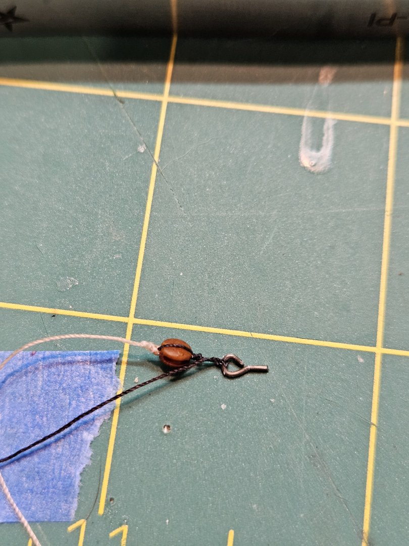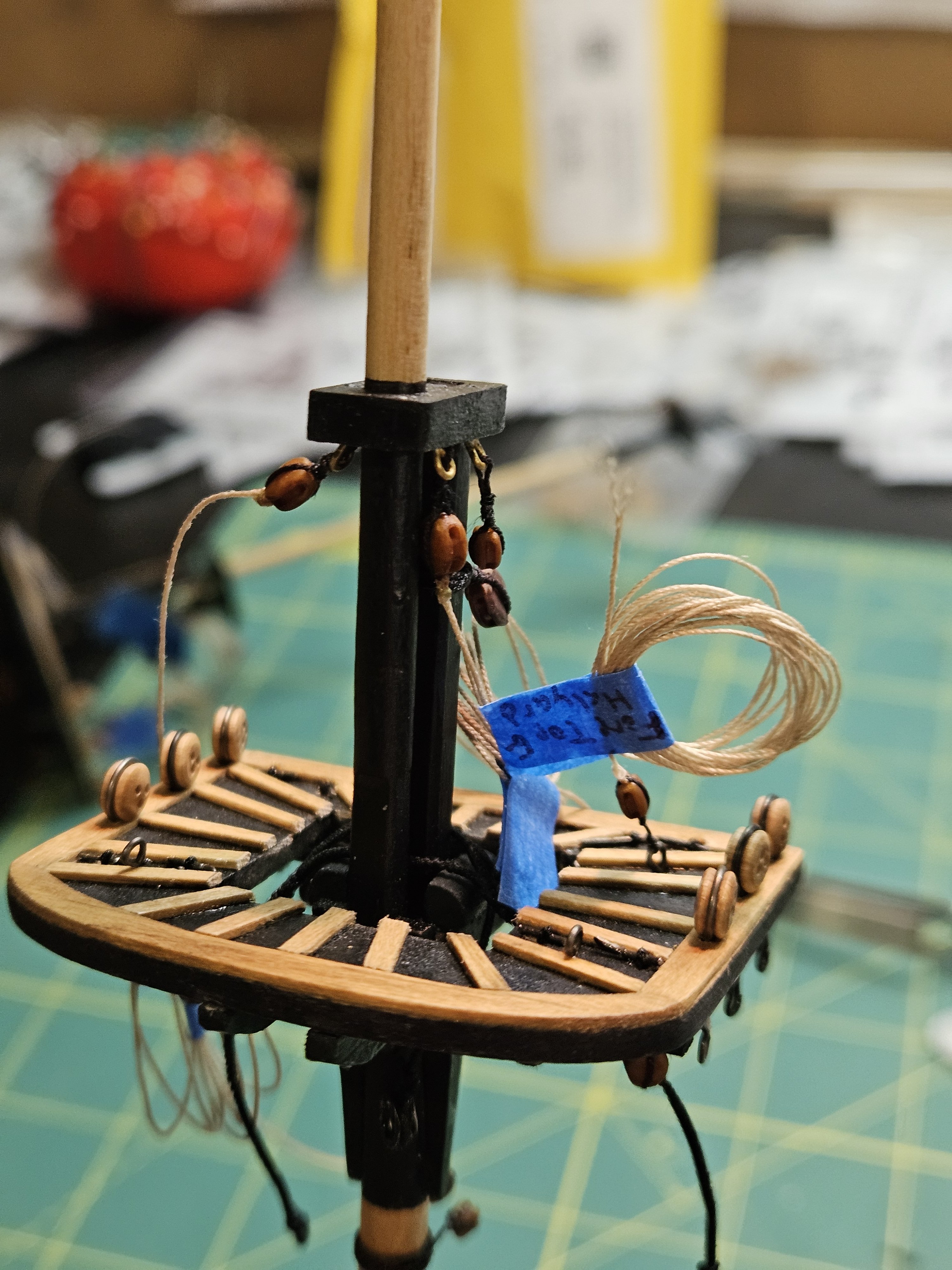 Slow, steady headway on the Fair American Model ship: One thing I've noticed is that I don't have enough blocks, primarily singles for all the sails, sheets, bunts, leeches, etc. I had a bag of 100 of 1/8" and 3/32", but they were doubles. I could order more from Model-Expo, but they've taken a while to deliver in the past, so I'm opting to make my own. My approach was to cut down the sheave hole of a double, with a saw: Pretty crude: Then on one side, I use a small file to create a groove to help grab the rope, when stropping I made a bunch. I'd stick them to the back of some painters tape, and stain them with Golden Oak. From the plans for all the yards and masts, the mast cap showed 4x eye hooks, 2 on each side. On the rigging plans, they aren't used for anything that I can see. From other models I've seen, the lifts are rove through single blocks attached to these eyes. The instructions show them going over the mast cap in a saddle and cross sides, but they'd likely chafe horribly in actual use. I'm going to use single blocks as shown. Again, I'm not sure how they're supposed to be tied to various parts, so for ease and time, I'm just doing square knots. Have to remember to do both sides.... On the starboard side of the main lower yard, is the yard tackle. I needed a nice rope eye to go over the yard end, and be partially served. So I'm using fine black thread to create some laddered loops to make the effect. Each loop is actually another overhand knot to keep it from unraveling. I makes for a relatively neat look. I did the same mini-serving for the double block. I made the length close to that on the plans. I would loop it over the end of the yard, and shoulder it next to the brace line. Just a dab of CA glue to tack it in place. I make sure to add a little label, so I know that the black one is the brace, and the other black one is the tackle. Next up is the lift....which is ......black? Using some fine tan thread, I start making the loop for the Main lower yard lifts. Making subsequent overhand knots as each loop of the mini-serving. The ends look good enough, after the ends are trimmed. I made a pair of them, P&S, since I'd like to be able to lift both sides. Making coils will help when attaching the yard later, instead of letting them dangle. I'm trying to do as much yard work, no pun intended, as I can so I'm not limited on space later. This is tough enough OFF THE MODEL! This is the last thing for the yard ends...more CA glue to tack in place on both sides. I have to remember to have them point UP. And yes, I later realized that the lifts were supposed to be black rope. The rule of thumb I was following was any rope that goes through a pulley, is running rigging, hence tan. But Lifts are standing rigging, and according to the instructions, its 'tarred' so black. I later removed the tan lifts and remade them in black rope, shown later. I know this doesn't seem like much progress, but when you spend 15min tying one rope end, and stropping blocks, and trimming, and measuring lengths, and doing the other side - its tedious. Time slips away so quickly at the end of the day. But I'm making progress. Until next time, Have a nice weekend, all. - Jason-