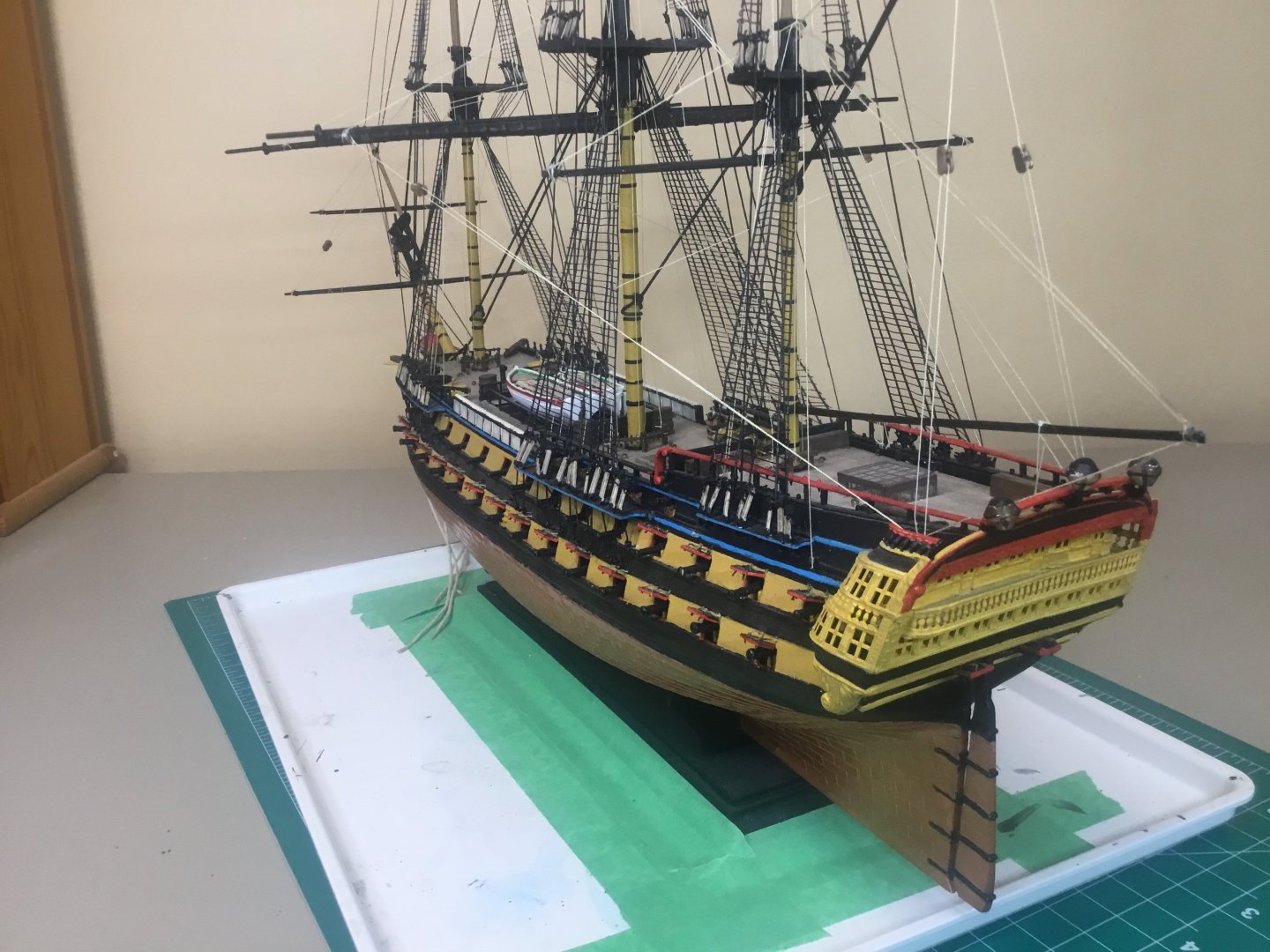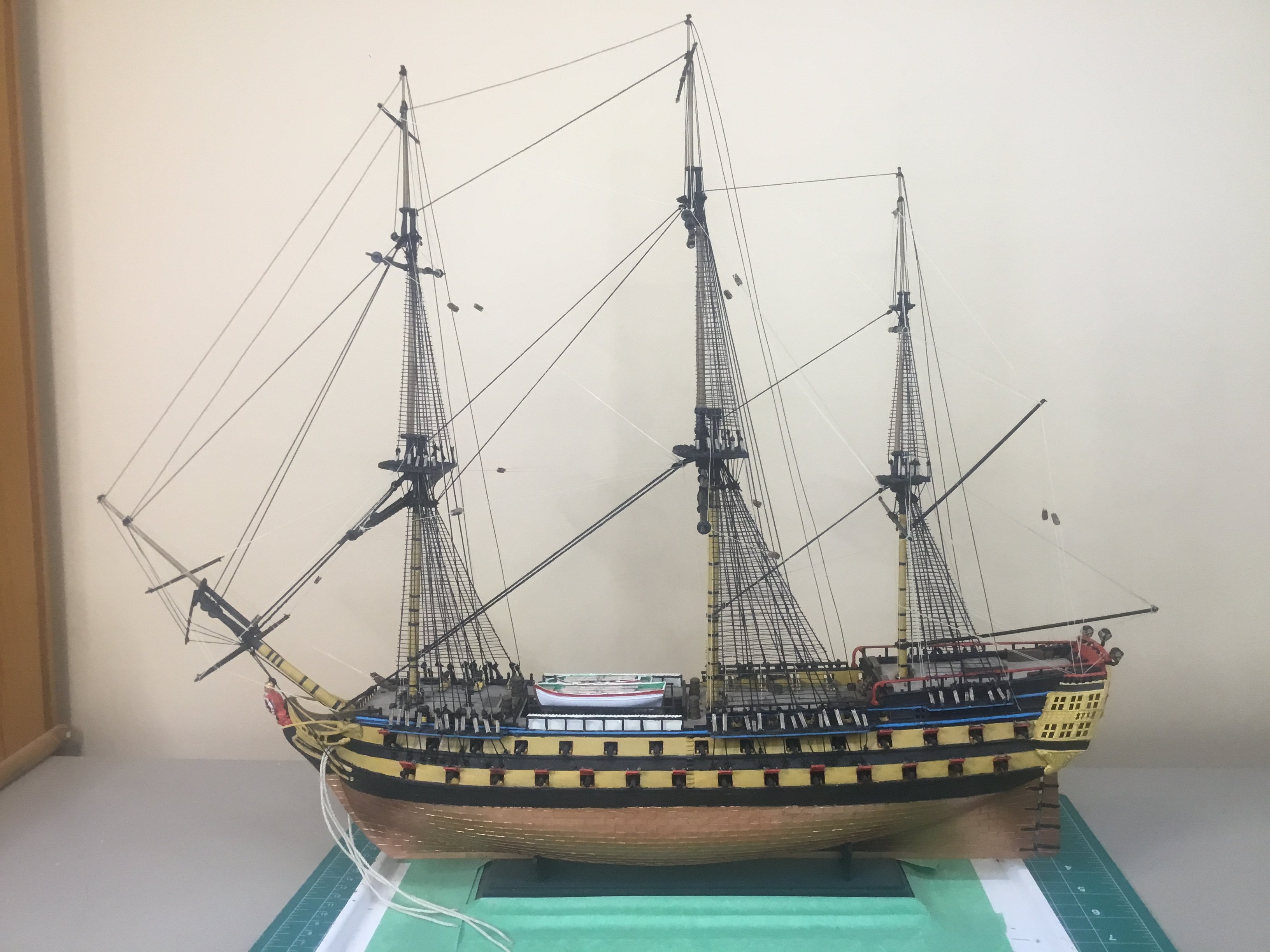 Some progress. Just eight more sets of rat lines to make. The white paper structure is to prevent ratline trimmings from falling into the waist.