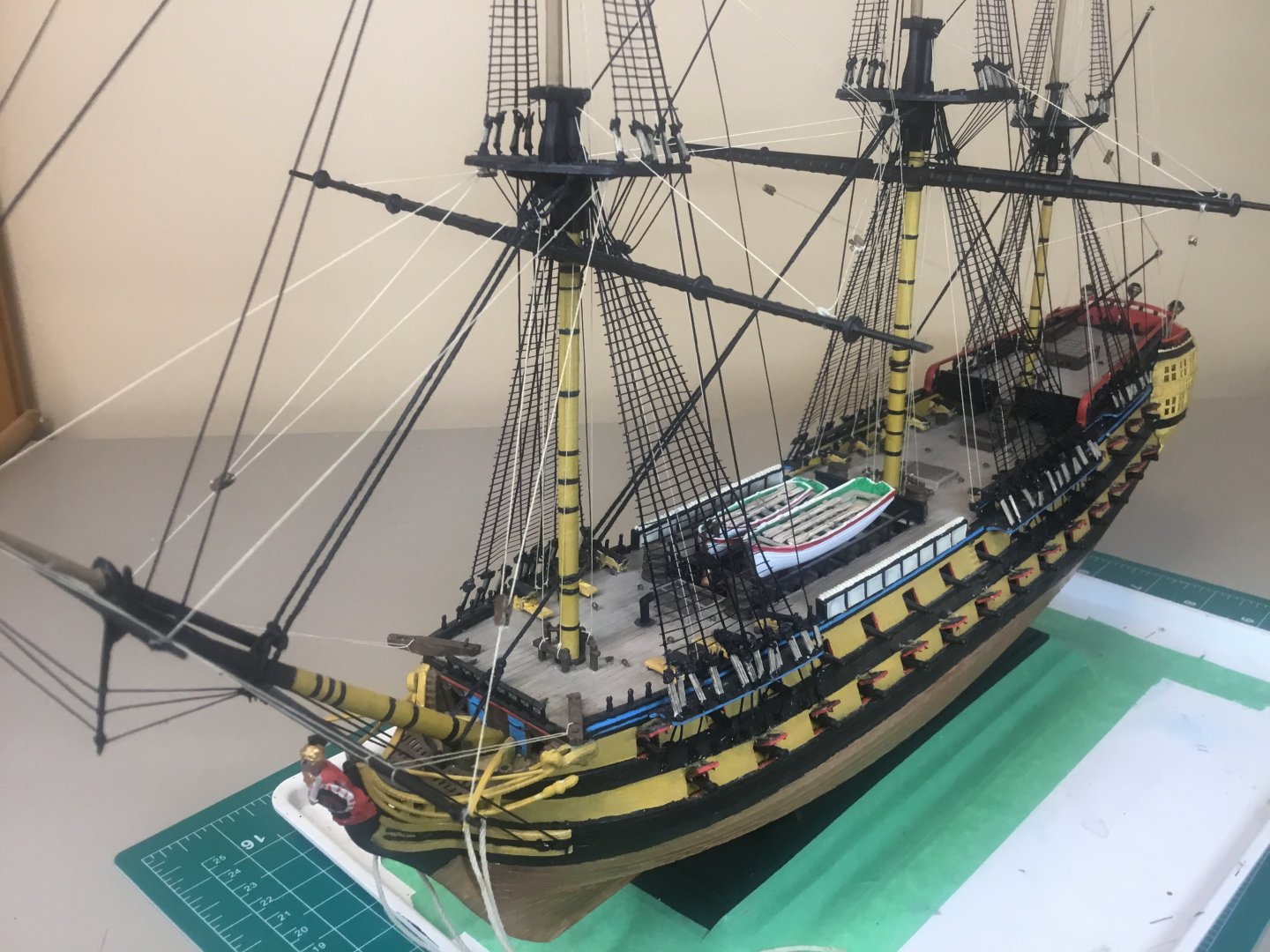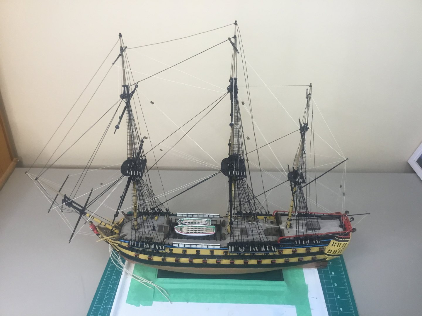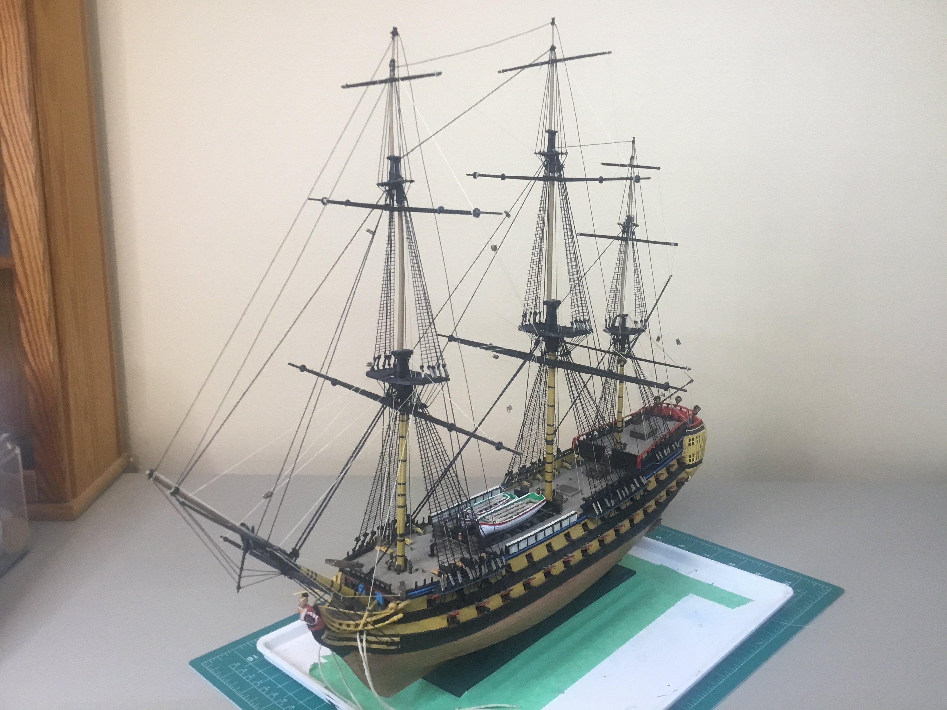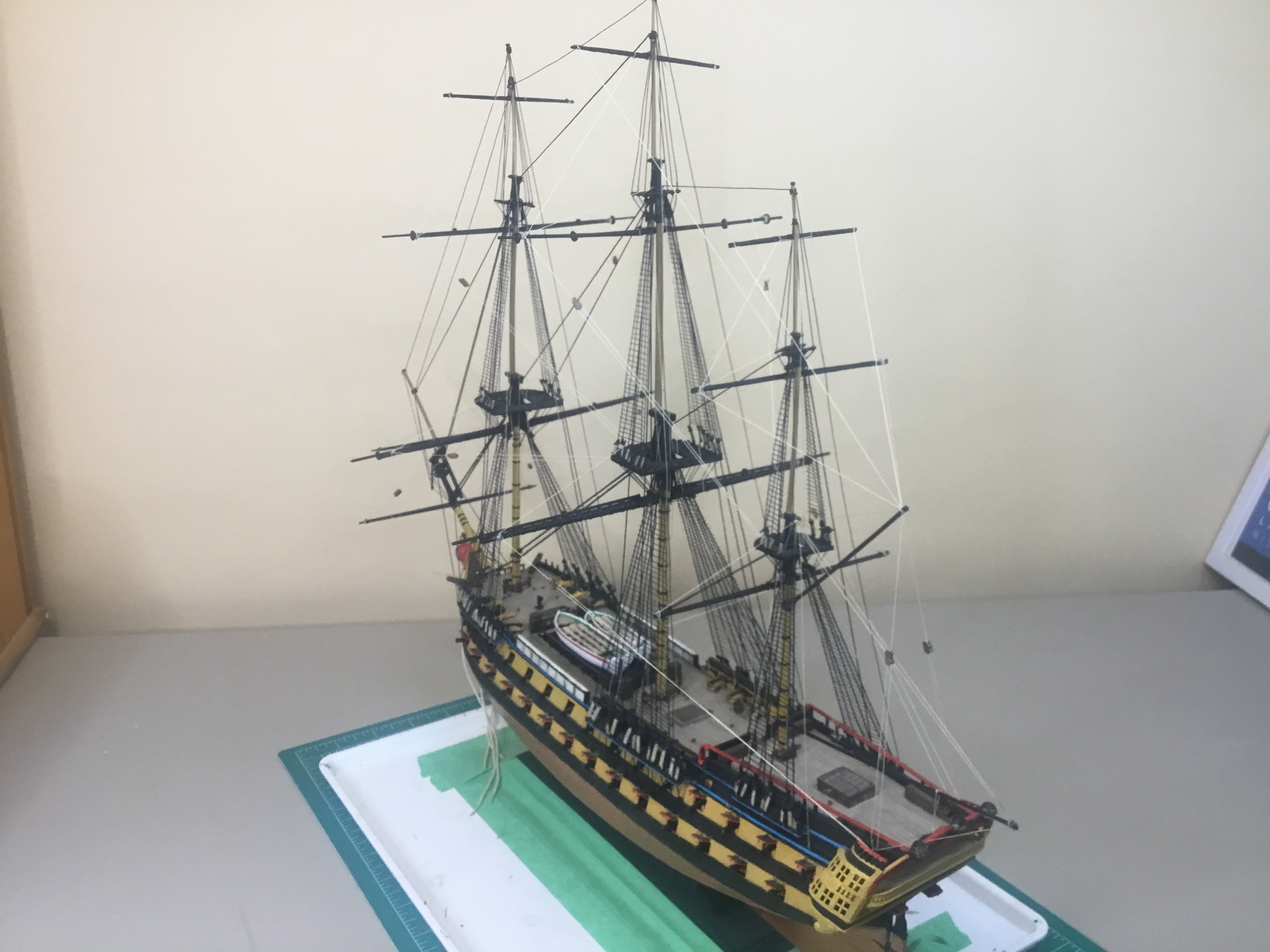 Progress! All braces now complete. Next step are the lines from the yards to the deck. Then it’s touching up the paint, adding the ship’s name on the stern, and then onto painting the crew.