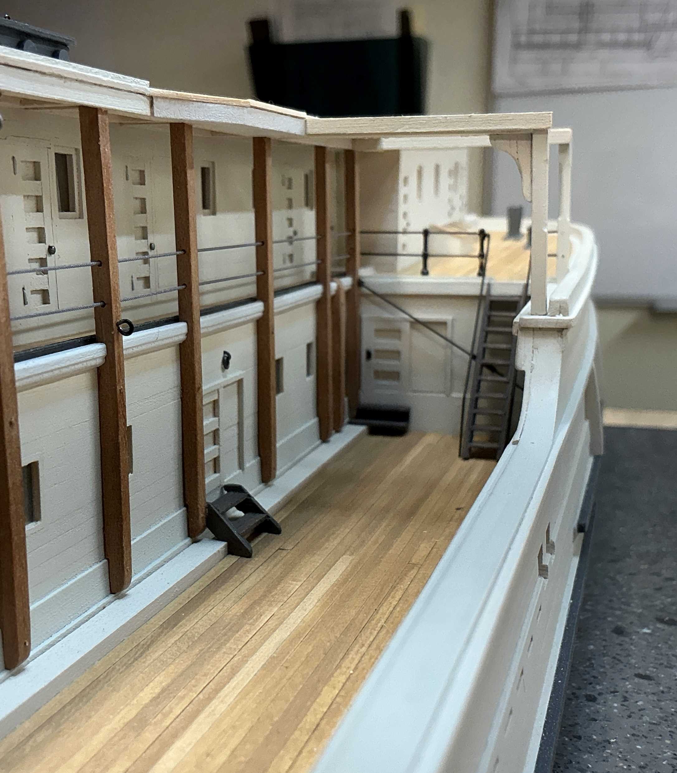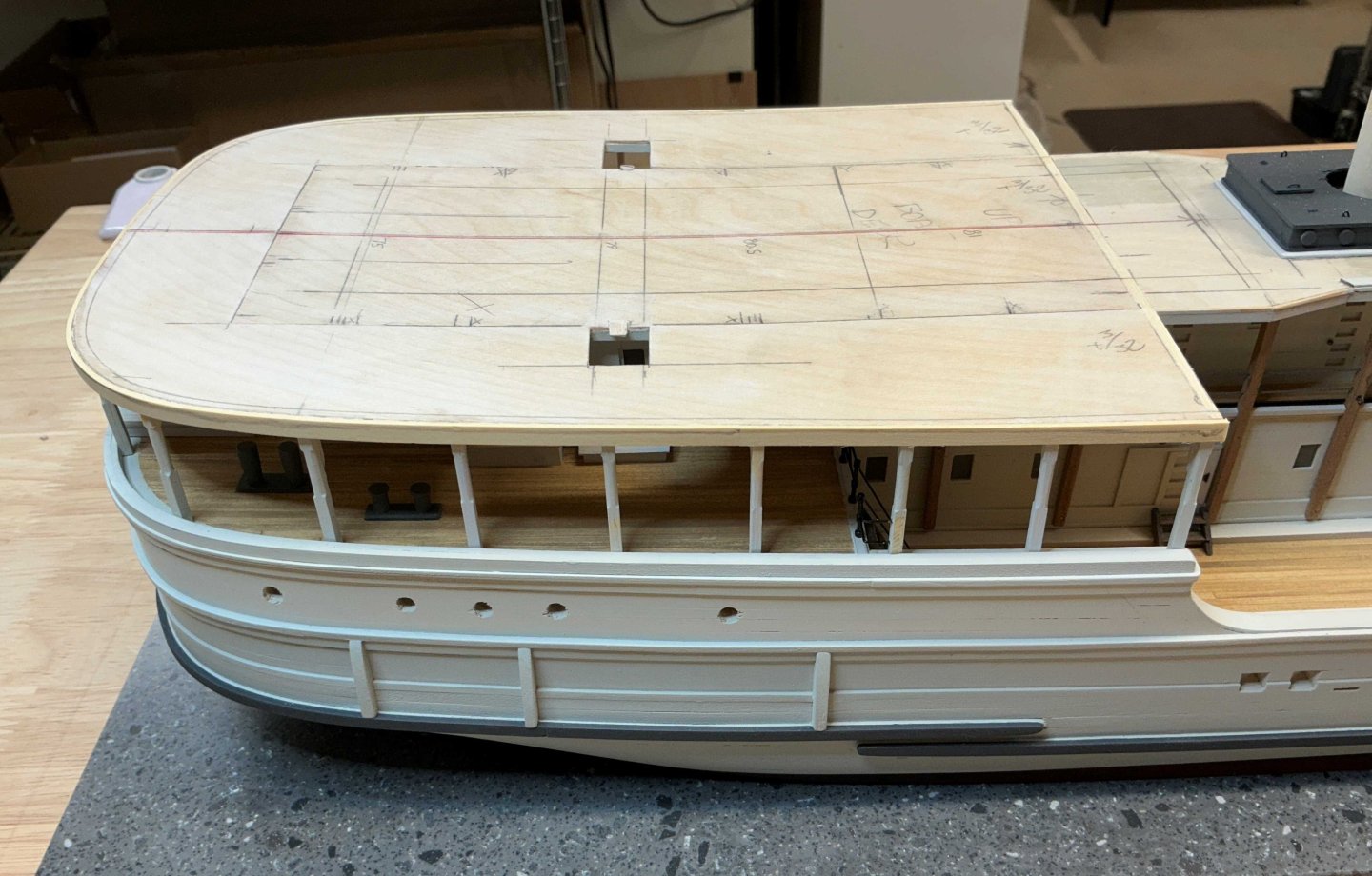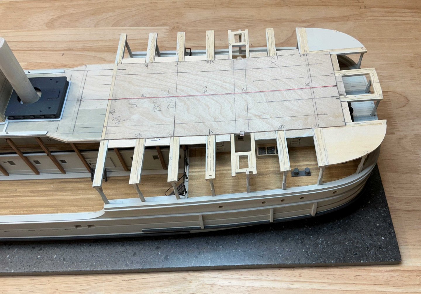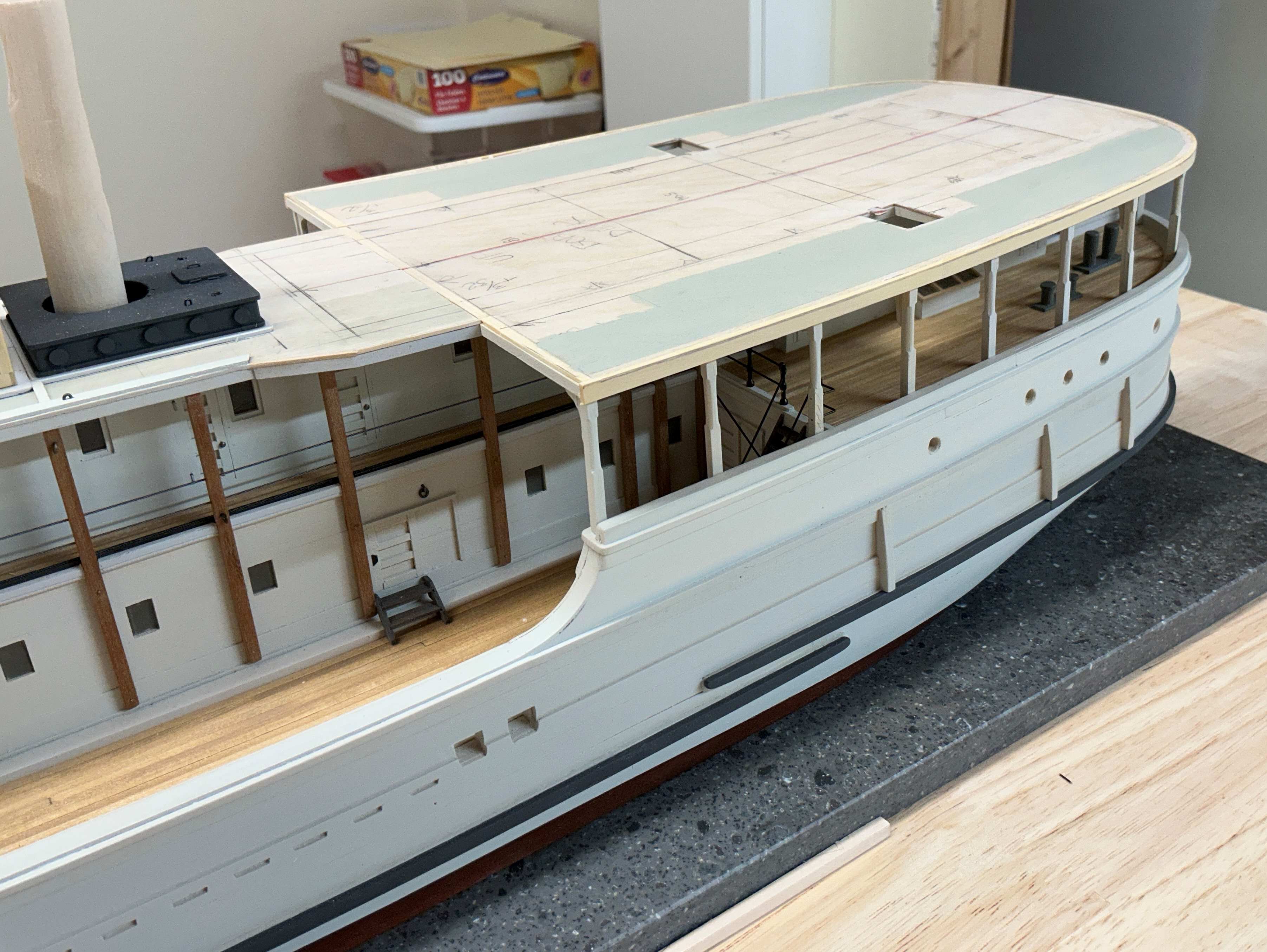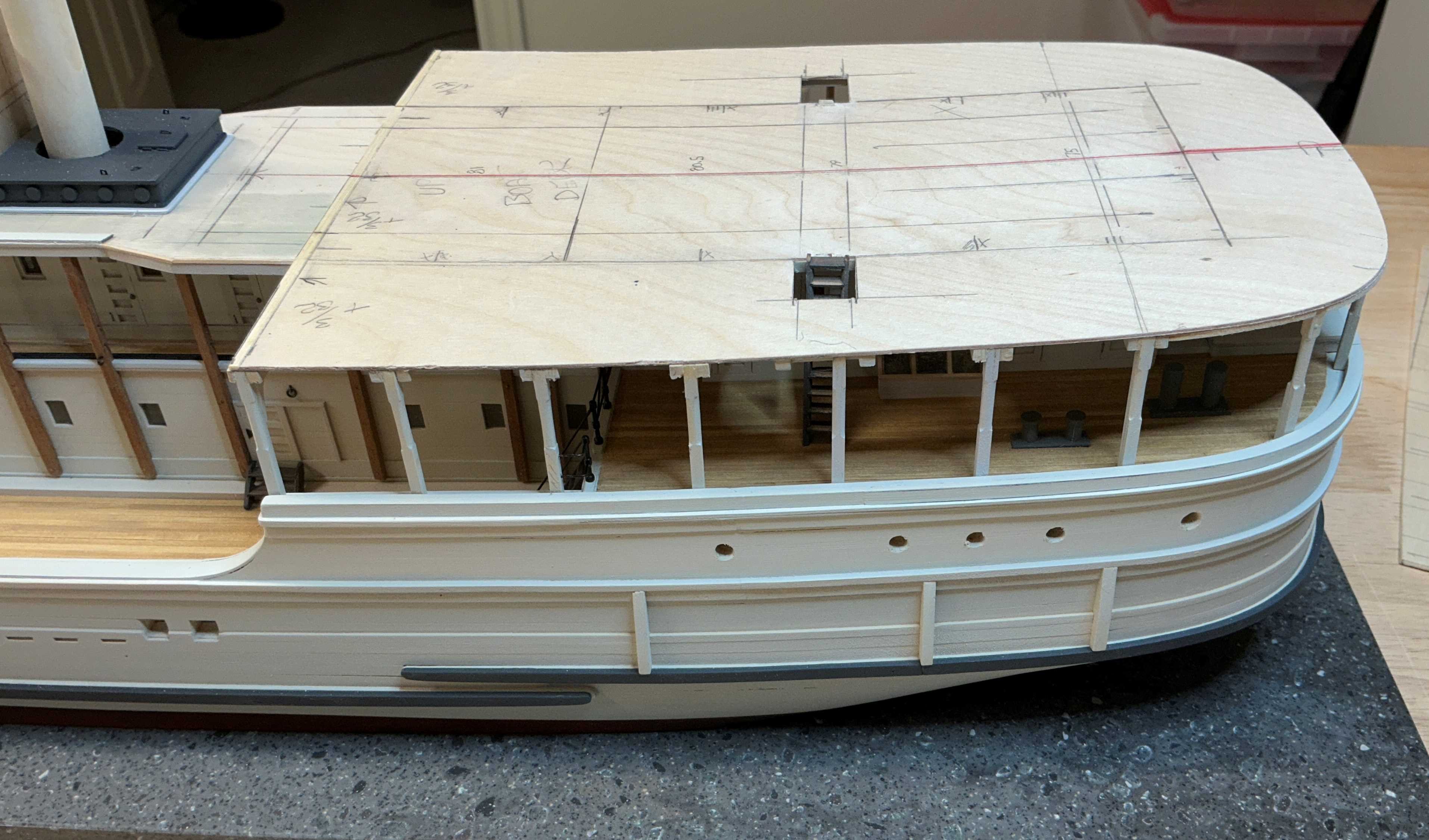 Hi Everyone, I hope your 2026 is going well. Thank you for the Comments, Likes and good wishes. The boat deck has been framed and the subdeck laid. The stanchion positions were laid out and holes were drilled into the waterway inside the coaming. A .020" brass rod was CA'd into the bottom of each stanchion but the pins are not glued into the waterway. The beams are 3/32" x 3/32" and are glued to the underside of the overhang on the cabins. There are three knees Port and Starboard that look to be positioned to add support for the lifeboats. They were made from a strip of wood that measures 1.8mm x 7.2mm. Not sue what type of wood it is but it is from an old Billing Kit. It stayed together well while each one was cut off with the Slicer. To make clamping easier every other stanchion was installed and then I went back and filled in the rest. Pieces Of 1/32" plywood were glued between the beams to add support to the subdeck joints. After some sanding and tweaking the remainder of the subdeck was ready to be glued down. I decided to cut it in half on the center line at the stern. I thought I had a photo of this but I forgot to take one. The fascia board (?) was glued to the perimeter using a combination of PVA and CA. The board is 3/64" x 5/32" AYC that was left over from Cheerful's wales. The area under the lifeboats was canvas over tongue and groove deck planking so it was painted with the Vallejo Deck Tan. The covering boards were cut in one piece from a sheet of 1/32" plywood. I concentrated on getting the inboard edge shaped correctly and then sanded down the outboard edge after it was painted and glued down. The coamings for the davit support brackets were partially painted and glued in place While this was going on I got a bit of work done on the Wheelhouse / Pilot House and the boat deck cabins. The Pilot House bridge wings are a piece of 1/32" plywood that slides through the slot under the doors. And this is what she looks like today. The smoke stack is there just to jazz it up a bit. Now it's back to finishing the siding. Hope to see you soon!