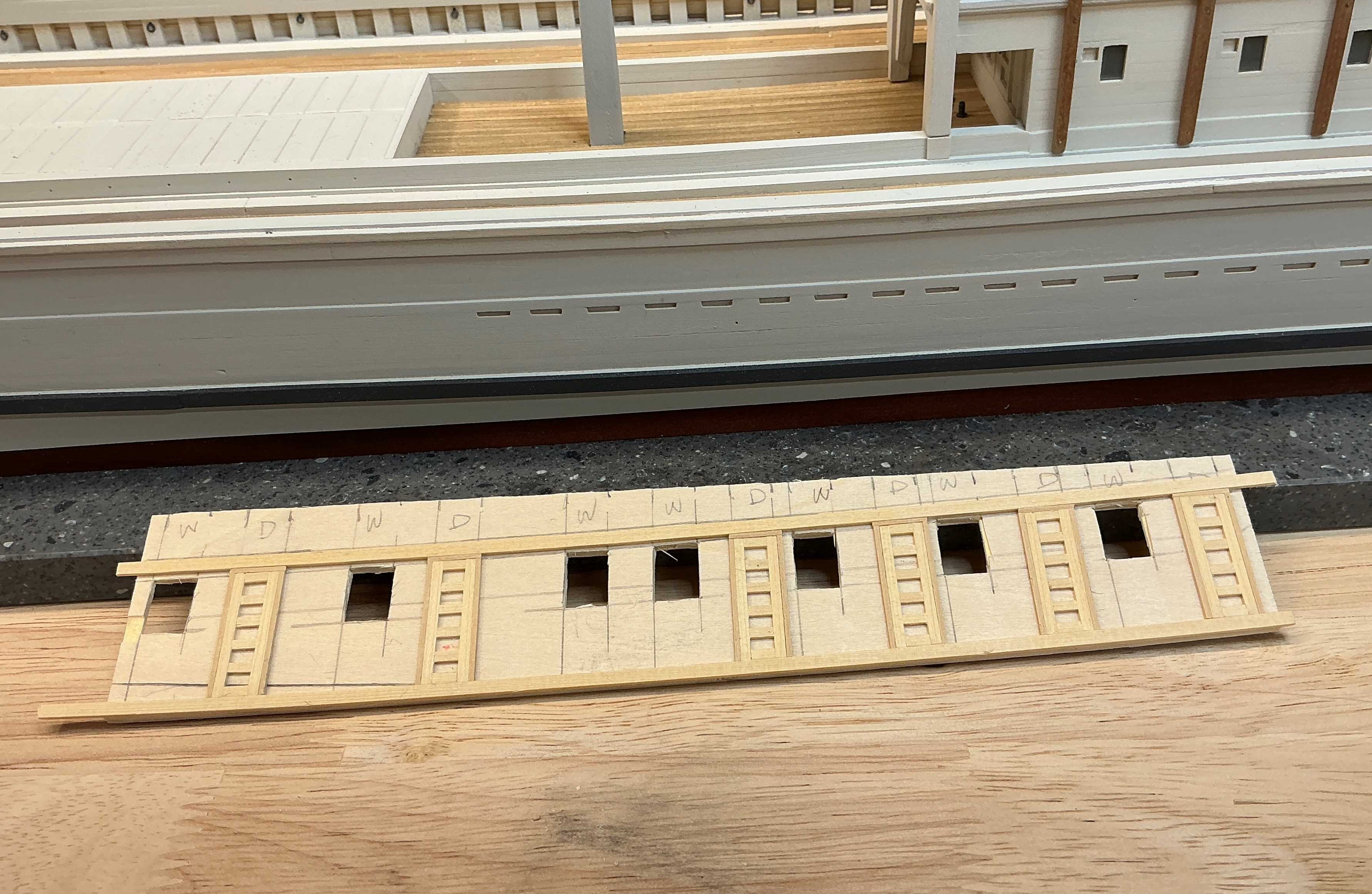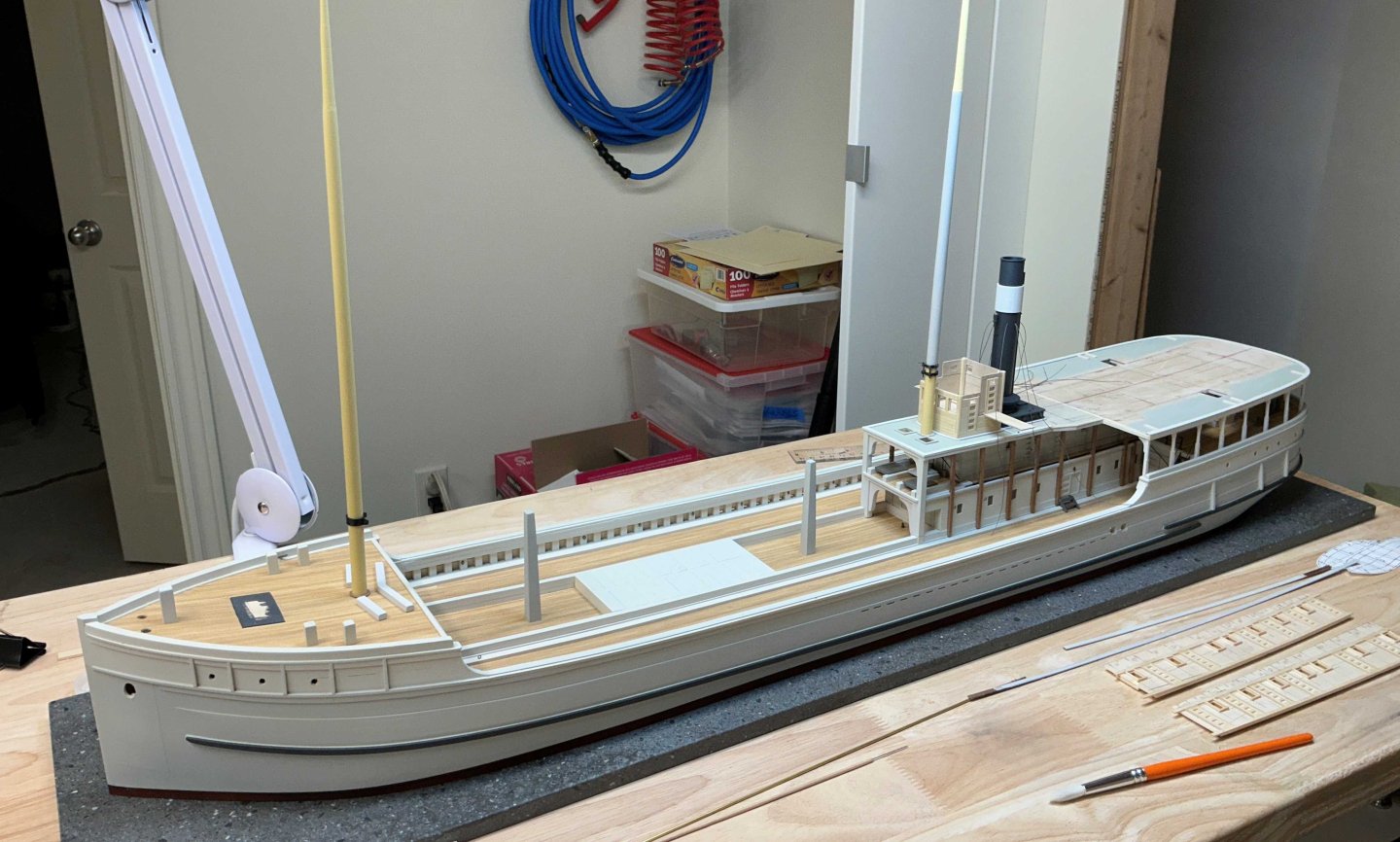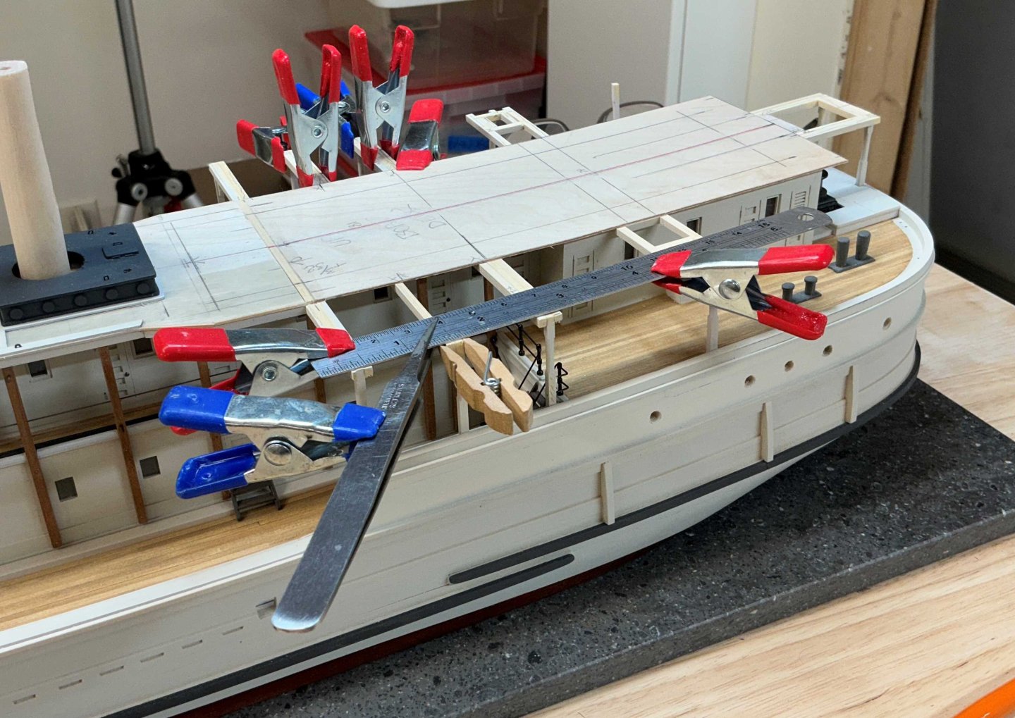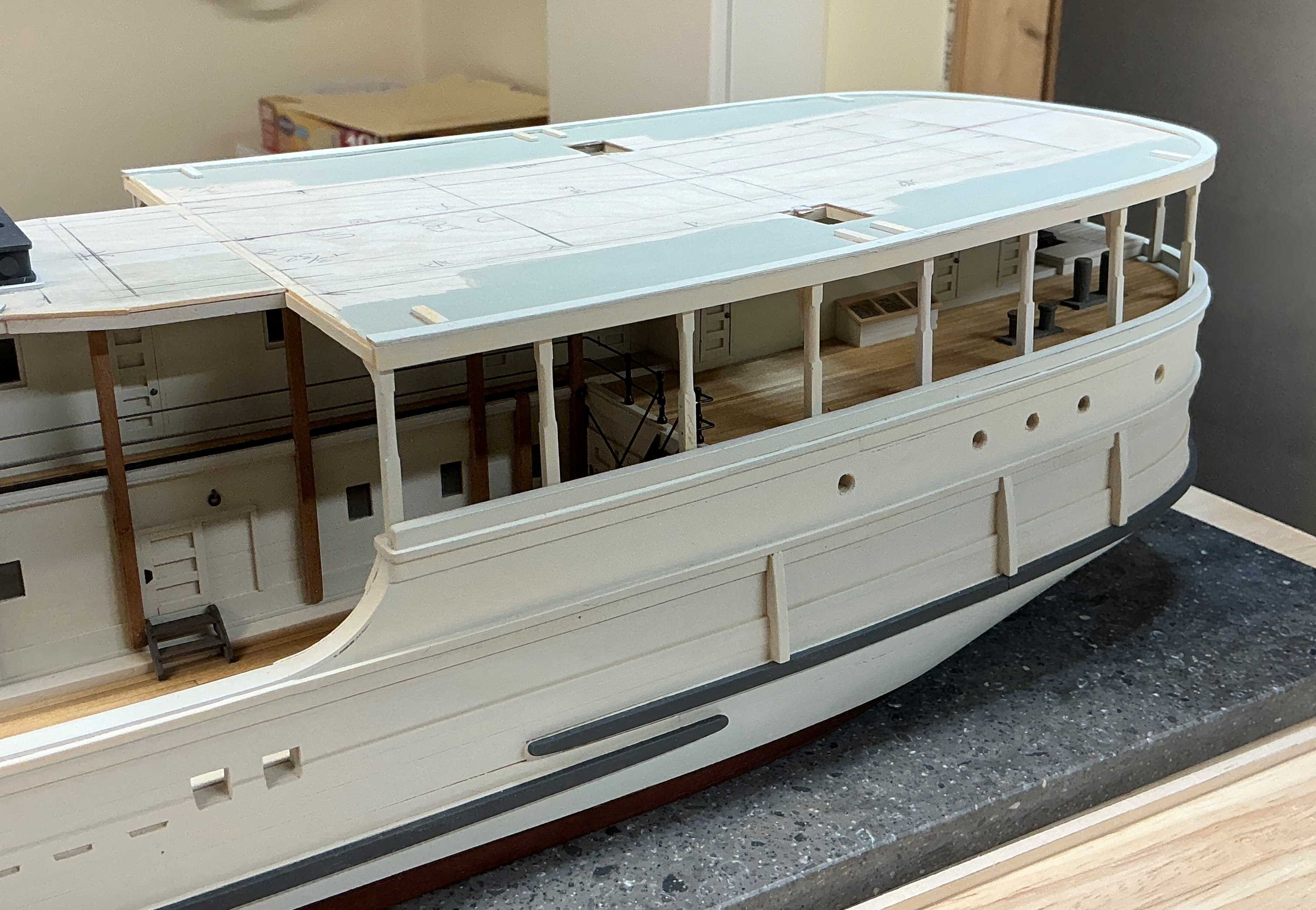 Hi Everyone, I hope your 2026 is going well. Thank you for the Comments, Likes and good wishes. The boat deck has been framed and the subdeck laid. The stanchion positions were laid out and holes were drilled into the waterway inside the coaming. A .020" brass rod was CA'd into the bottom of each stanchion but the pins are not glued into the waterway. The beams are 3/32" x 3/32" and are glued to the underside of the overhang on the cabins. There are three knees Port and Starboard that look to be positioned to add support for the lifeboats. They were made from a strip of wood that measures 1.8mm x 7.2mm. Not sue what type of wood it is but it is from an old Billing Kit. It stayed together well while each one was cut off with the Slicer. To make clamping easier every other stanchion was installed and then I went back and filled in the rest. Pieces Of 1/32" plywood were glued between the beams to add support to the subdeck joints. After some sanding and tweaking the remainder of the subdeck was ready to be glued down. I decided to cut it in half on the center line at the stern. I thought I had a photo of this but I forgot to take one. The fascia board (?) was glued to the perimeter using a combination of PVA and CA. The board is 3/64" x 5/32" AYC that was left over from Cheerful's wales. The area under the lifeboats was canvas over tongue and groove deck planking so it was painted with the Vallejo Deck Tan. The covering boards were cut in one piece from a sheet of 1/32" plywood. I concentrated on getting the inboard edge shaped correctly and then sanded down the outboard edge after it was painted and glued down. The coamings for the davit support brackets were partially painted and glued in place While this was going on I got a bit of work done on the Wheelhouse / Pilot House and the boat deck cabins. The Pilot House bridge wings are a piece of 1/32" plywood that slides through the slot under the doors. And this is what she looks like today. The smoke stack is there just to jazz it up a bit. Now it's back to finishing the siding. Hope to see you soon!