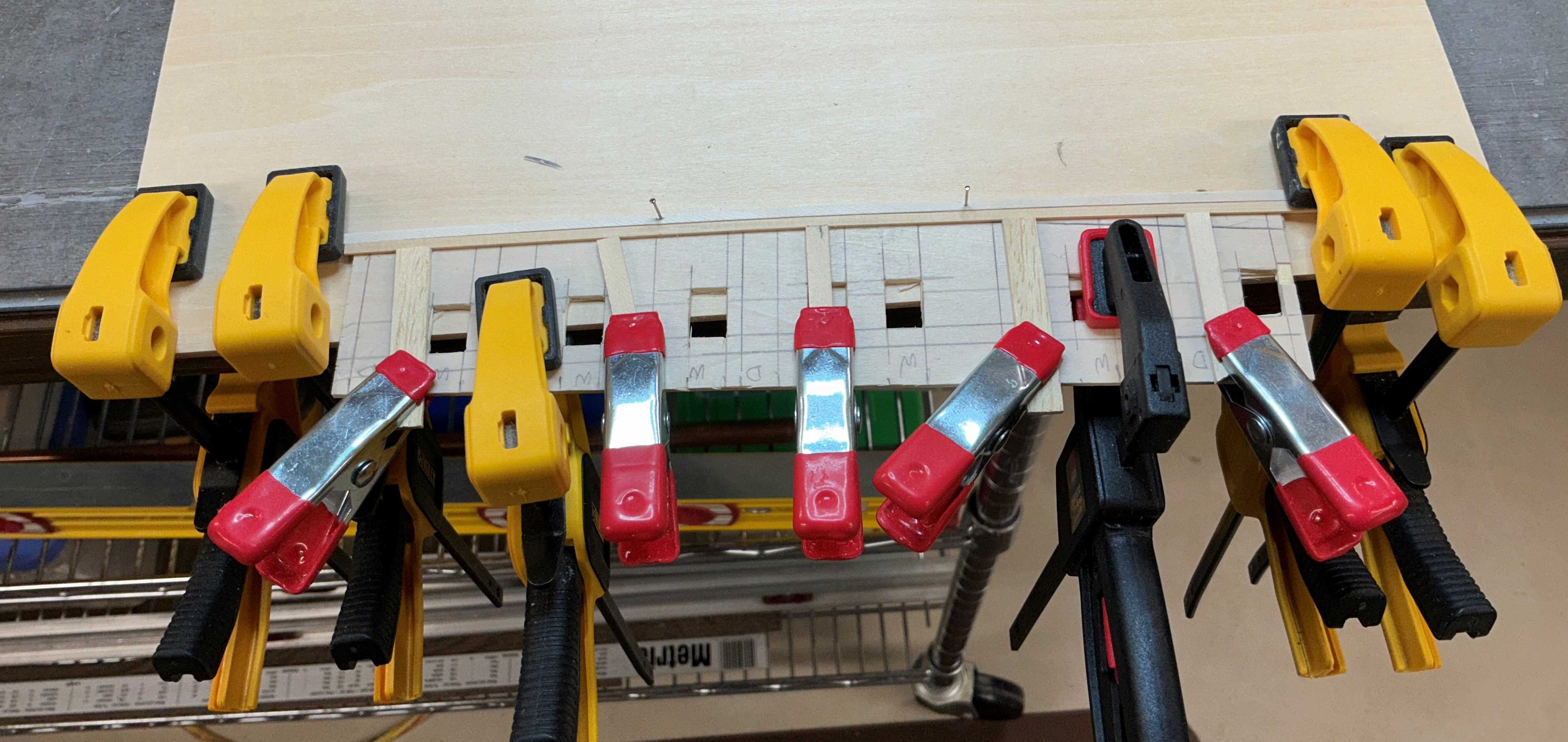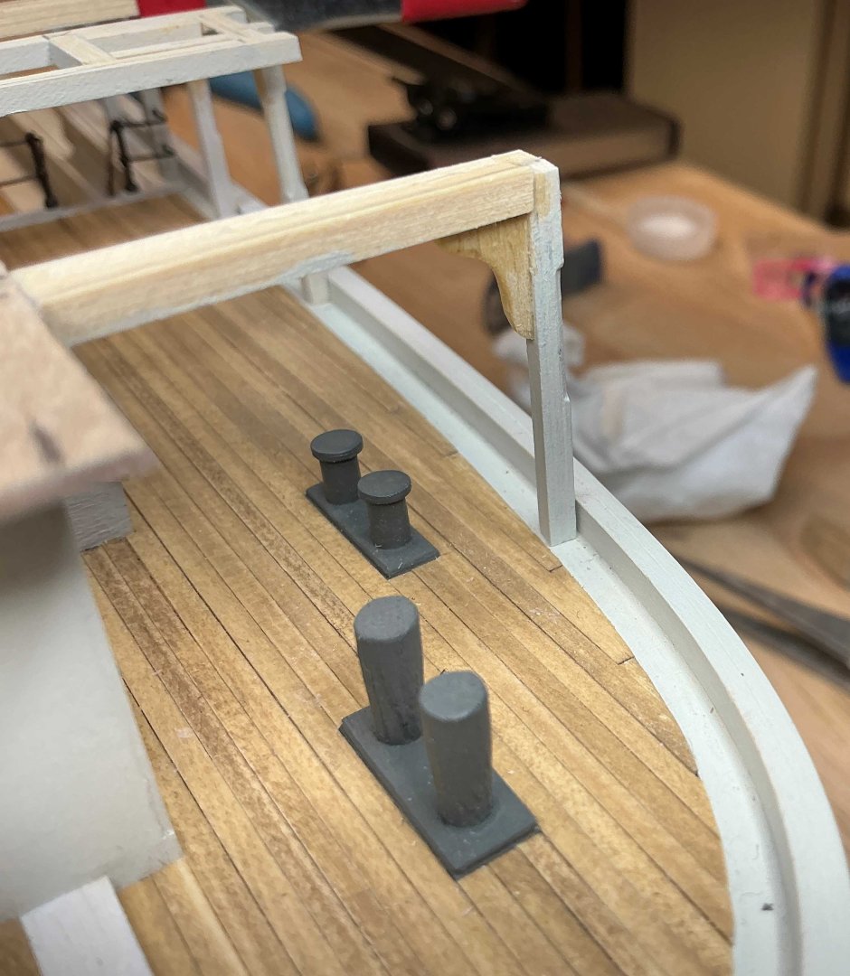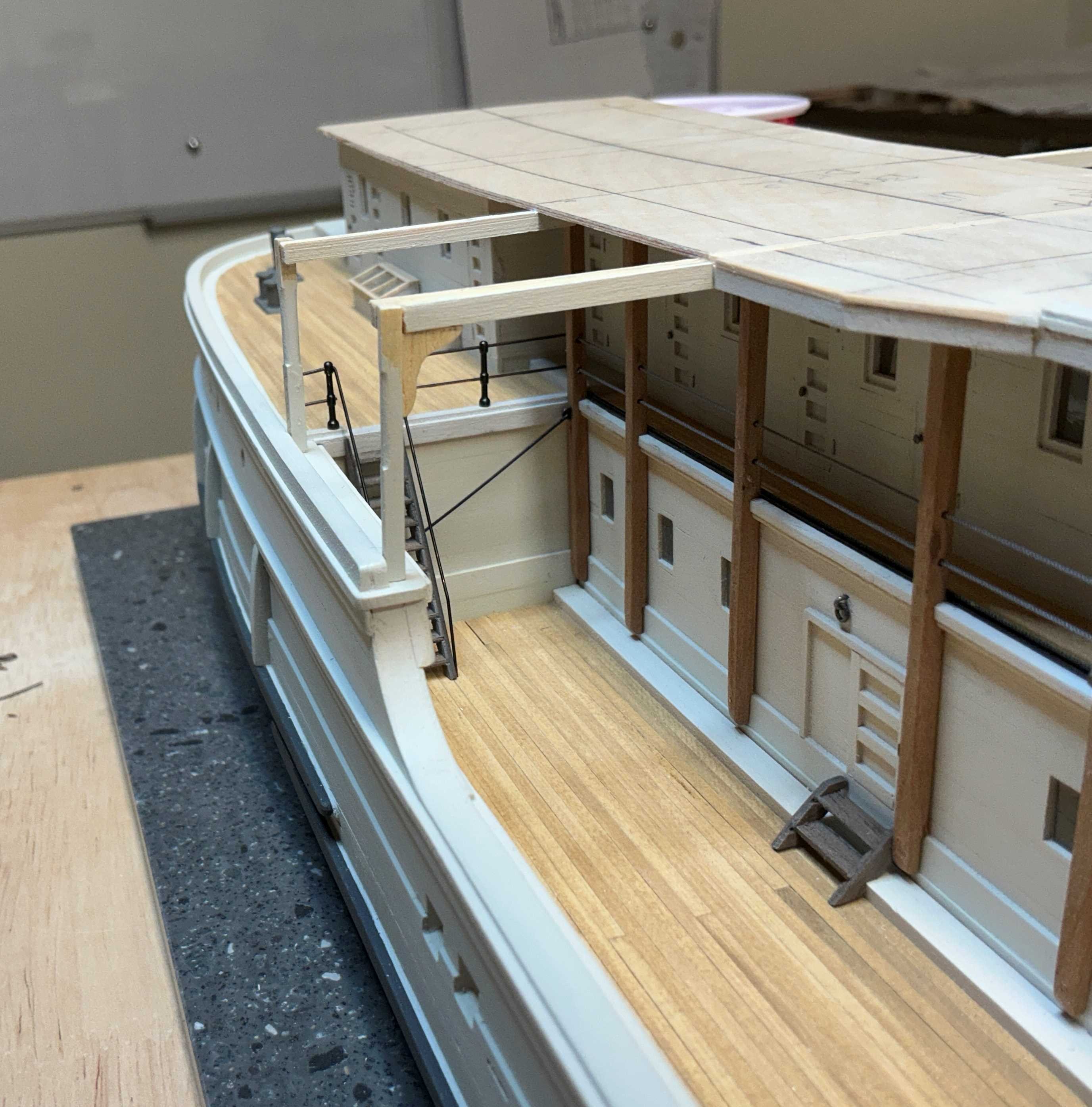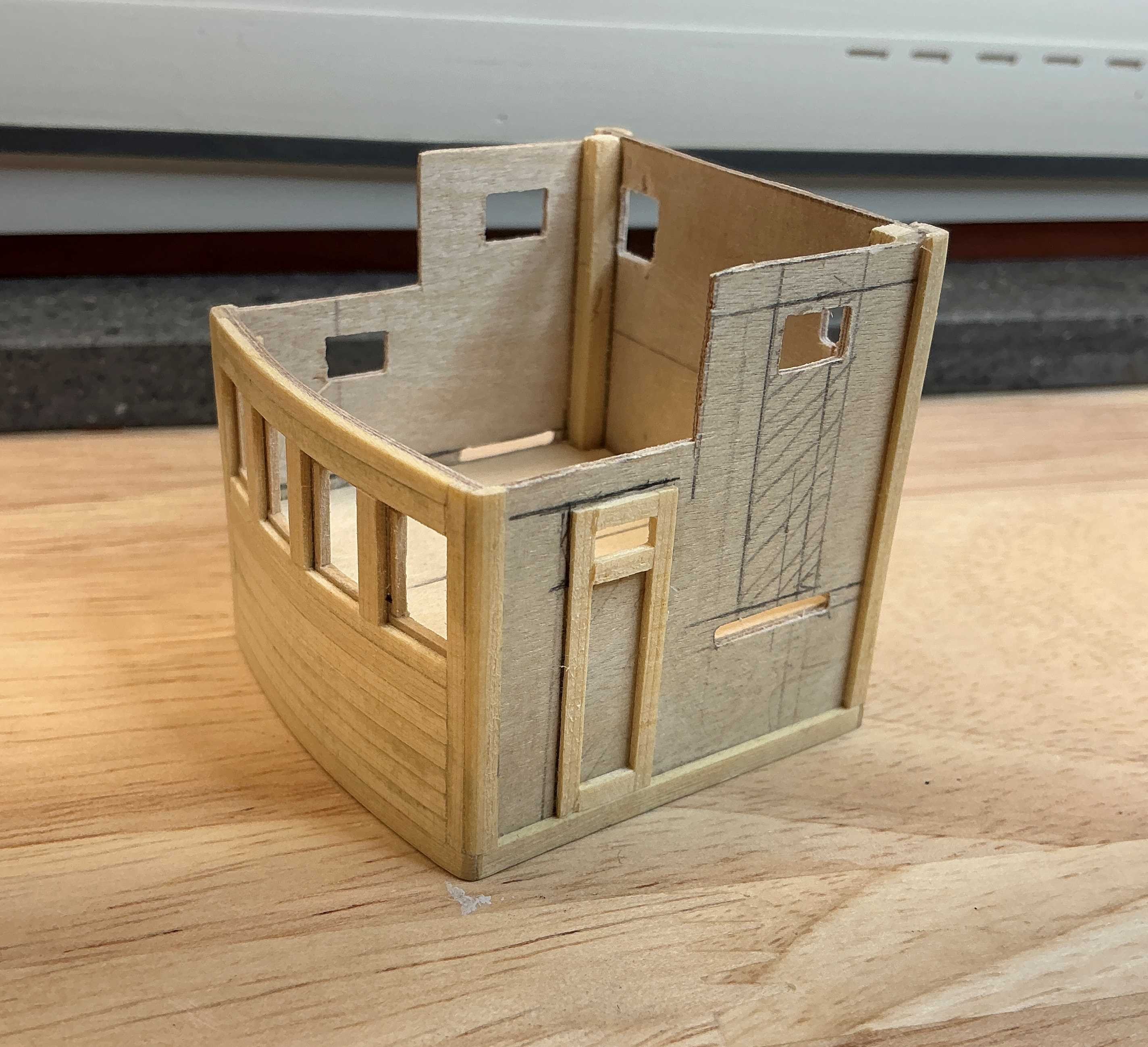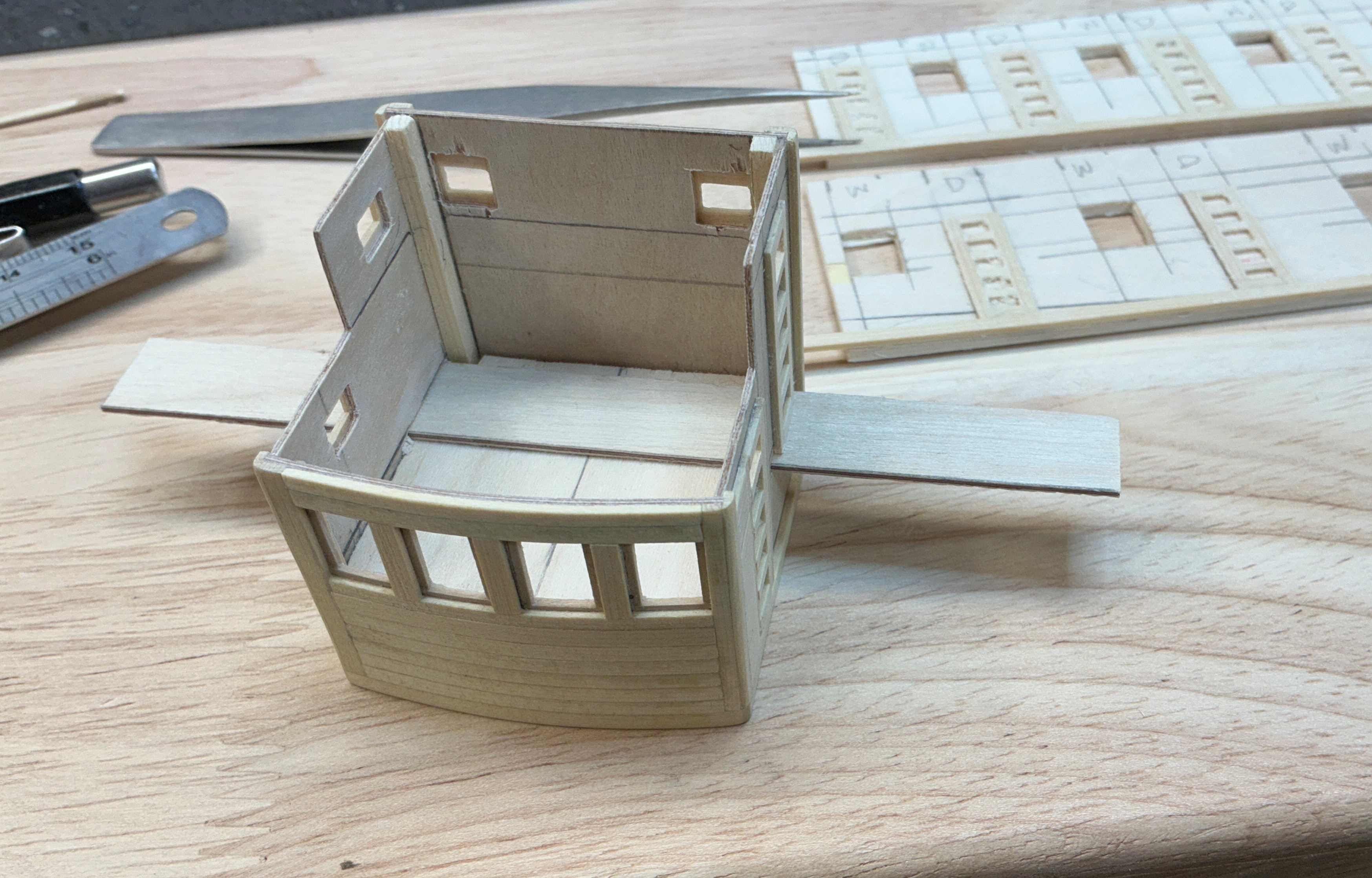 Hi Everyone, I hope your 2026 is going well. Thank you for the Comments, Likes and good wishes. The boat deck has been framed and the subdeck laid. The stanchion positions were laid out and holes were drilled into the waterway inside the coaming. A .020" brass rod was CA'd into the bottom of each stanchion but the pins are not glued into the waterway. The beams are 3/32" x 3/32" and are glued to the underside of the overhang on the cabins. There are three knees Port and Starboard that look to be positioned to add support for the lifeboats. They were made from a strip of wood that measures 1.8mm x 7.2mm. Not sue what type of wood it is but it is from an old Billing Kit. It stayed together well while each one was cut off with the Slicer. To make clamping easier every other stanchion was installed and then I went back and filled in the rest. Pieces Of 1/32" plywood were glued between the beams to add support to the subdeck joints. After some sanding and tweaking the remainder of the subdeck was ready to be glued down. I decided to cut it in half on the center line at the stern. I thought I had a photo of this but I forgot to take one. The fascia board (?) was glued to the perimeter using a combination of PVA and CA. The board is 3/64" x 5/32" AYC that was left over from Cheerful's wales. The area under the lifeboats was canvas over tongue and groove deck planking so it was painted with the Vallejo Deck Tan. The covering boards were cut in one piece from a sheet of 1/32" plywood. I concentrated on getting the inboard edge shaped correctly and then sanded down the outboard edge after it was painted and glued down. The coamings for the davit support brackets were partially painted and glued in place While this was going on I got a bit of work done on the Wheelhouse / Pilot House and the boat deck cabins. The Pilot House bridge wings are a piece of 1/32" plywood that slides through the slot under the doors. And this is what she looks like today. The smoke stack is there just to jazz it up a bit. Now it's back to finishing the siding. Hope to see you soon!