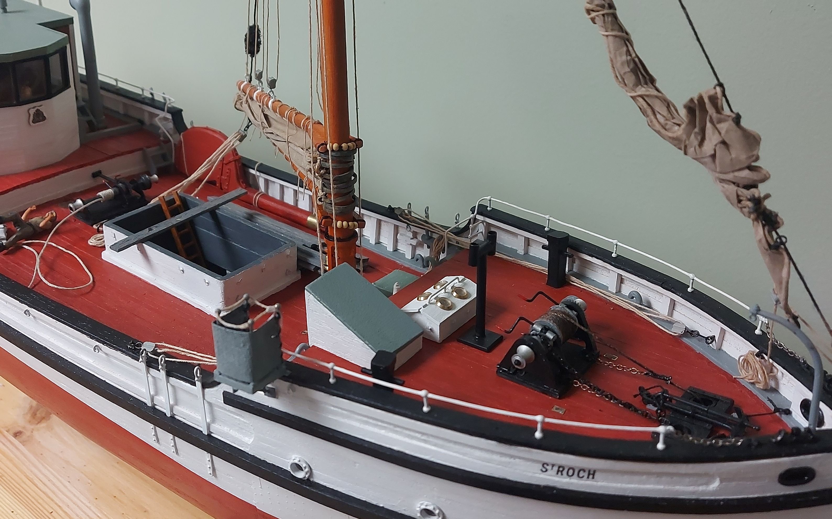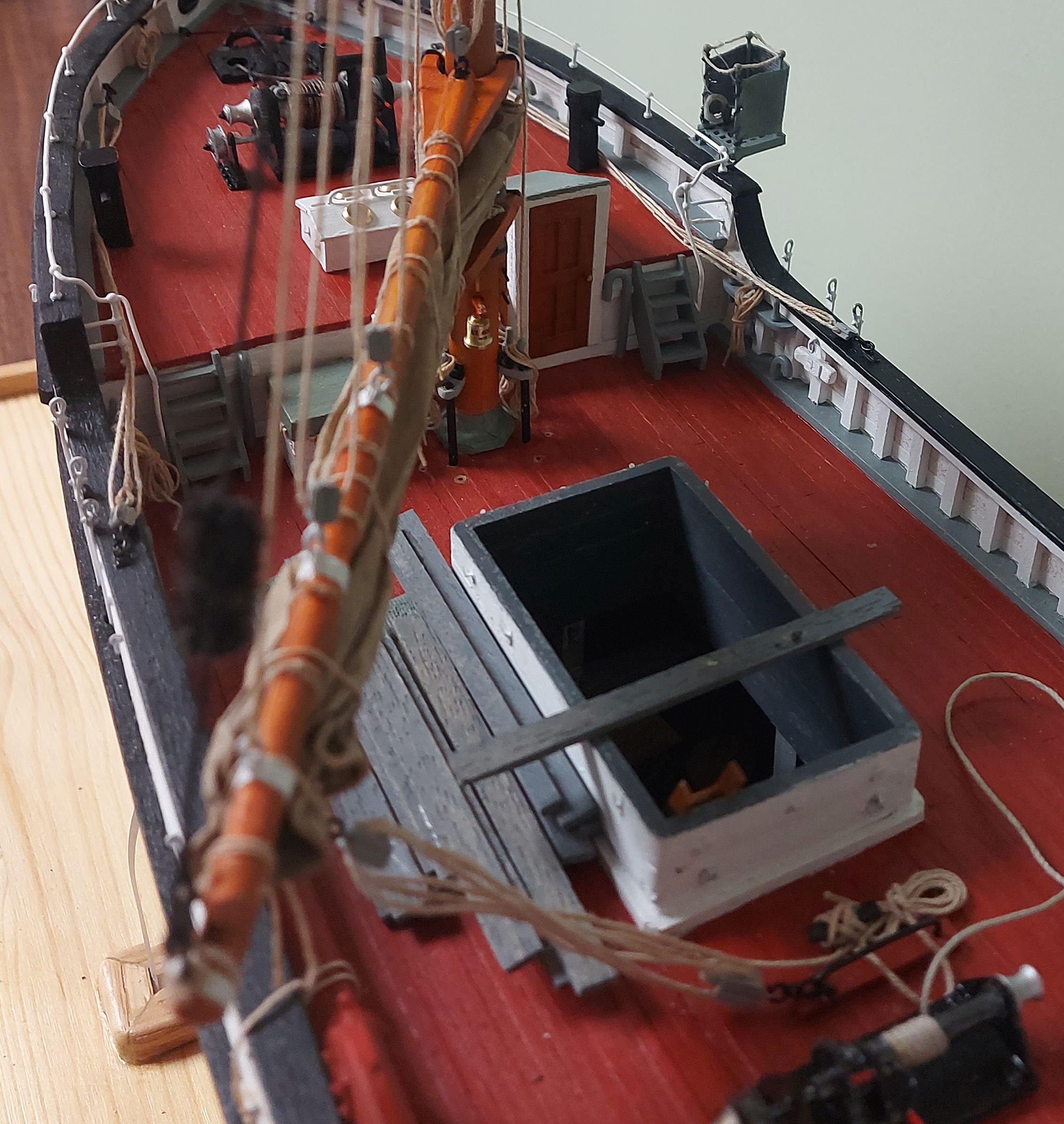 Furling the jib onto the model is now complete! The jib stay went on without an issue, I passed the cable strands through the jib stay to create the eye at the mast, leaving enough slack line to pull the stay taught. Of course the jib was already attached to the stay, so once the glue had set up I only needed to belay the halliard and downhaul, shown in the first picture... Observers who have been following along may very well ask why is the halliard shackled to the clew instead of the head of the jib, and where are the sheets? One of my contacts on the Board of the Vancouver Maritime Museum is also a sailor who lived on board his ship "North Star of Herschel Island", the last of the fully rigged fur trading sailing ships, and a contemporary of St. Roch. He has been a valuable source of details about period rigging. St. Roch was a poor sailor and rarely used her sails, especially to move through the channels in the pack ice. Her jib needed to be triced up in order not to lay across the machinery on her fo'c's'le. I do have one picture showing the jib furled with the halliard at the head and the sheets on the clew, but the sheets do get in the way of the fo'c's'le deck access, and all other pictures show the sail furled without the sheets. He and I agreed, based on the photographic evidence, that the halliard was removed from the head of the jib and shackled to the clew in order to furl it out of the way. This next picture shows St Roch in 1928 with the sail furled in this manner, all other later photos show the jib hauled further up the stay as I have modelled it, but this is the clearest picture of the rig. This method does allow the sail to be set quickly if needed, and the next picture shows the downhaul, which is shackled to the head of the jib, as I have belayed it to a ring on the bulwark. The rigging plan shows the downhaul, but not where it belays. If it was taken to the foremast like the rest of the rigging it would foul the windlass and other fixtures on the fo'c's'le. Since the downhaul was rarely used and only under tension when pulling down the jib, my consultant and I agreed that coiling it onto a bulwark ring would be correct, keeping the line handy while out of the way. So what of the sheets? I showed a previous picture where today they are coiled on top of the companionway roof, but this is obviously incorrect for St. Roch during her working life, and if they were shackled to the jib's furled clew they would be in the way of the fo'c's'le deck... More discussions with the Museum, and the answer we came up with shall be revealed shortly! Stay tuned, Bruce