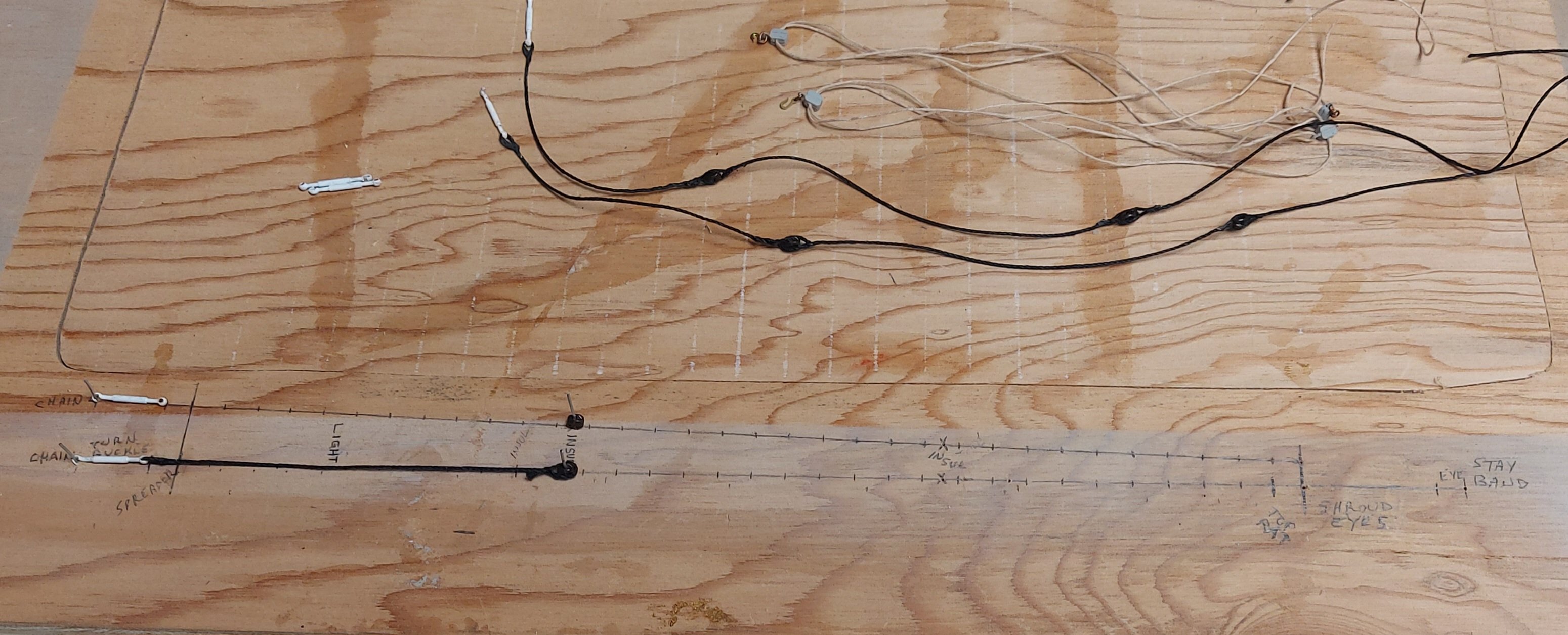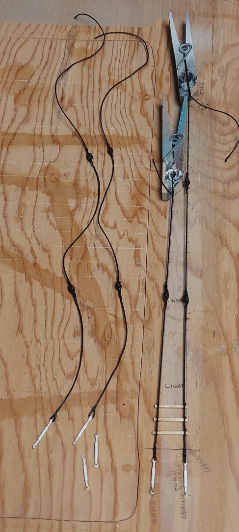 While waiting for paint to dry and to take a break from fussing with baggywrinkles... I made and installed the mast head light. It is a modified New Cap Maquettes product, I added the chimney (it is a kerosene lamp), the base, and the mounting brackets. The two unrigged blocks are for the foresail boom lift and the jib halliard... I also started making stays off the ship. These are fswr, simulated with black Amati rigging line of a scale 2" diameter per the plans. I made a template along the bottom of my silkspan frame, scaling dimensions from the rigging plan and indirectly from photos. Pins anchor each of the components so each stay will be identical. Each stay starts with the bottle screw, and runs to the first electrical insulator, this is what I have so far in the picture. Each item of standing rigging is broken with two insulators, and will be fitted with an eye at the top. The lower eyes are presumable served, but covered with a leather wrap, which I will simulate with more silkspan scraps. I will make a pair of each item then install them onto the ship... I do appreciate the check-ins and comments! Bruce