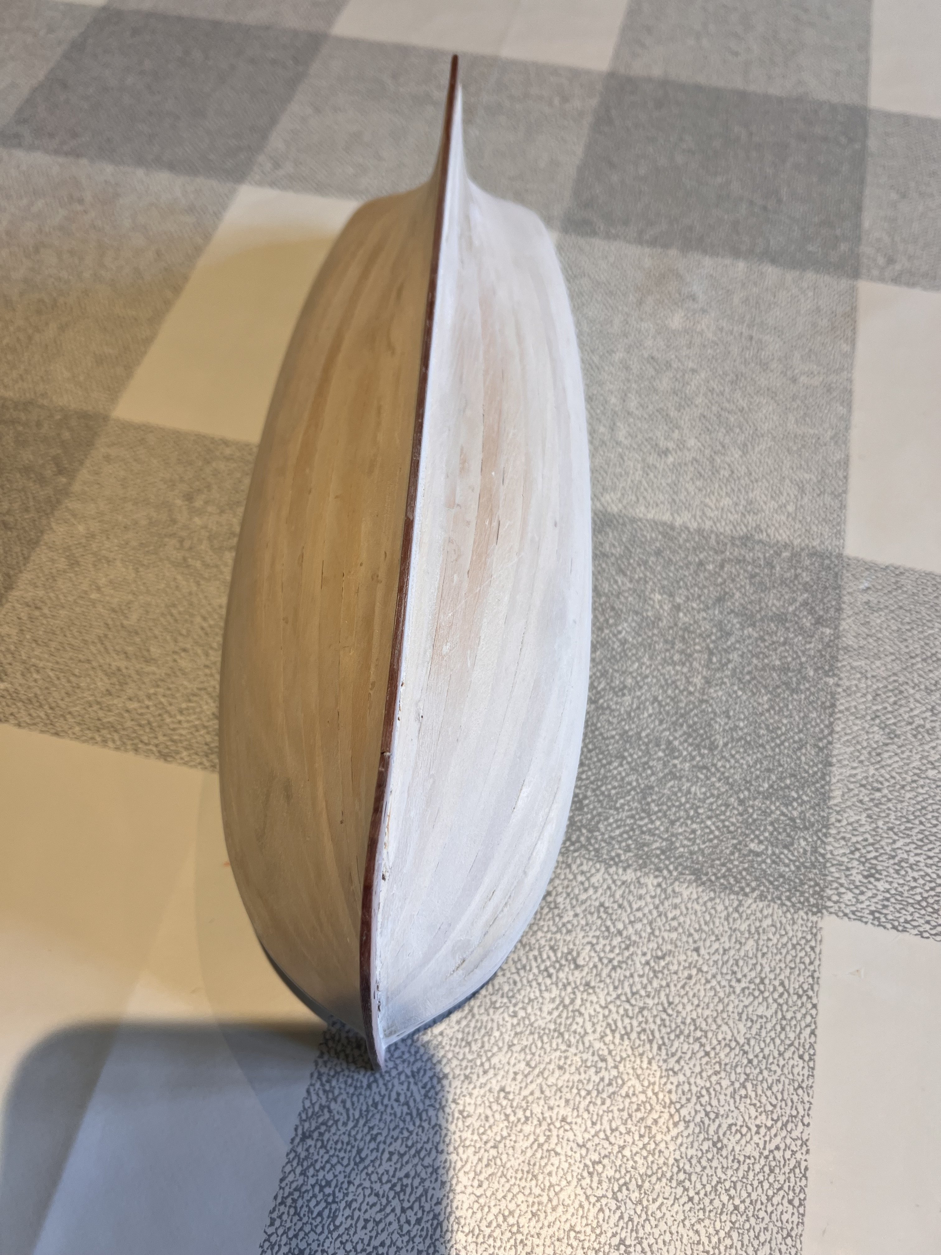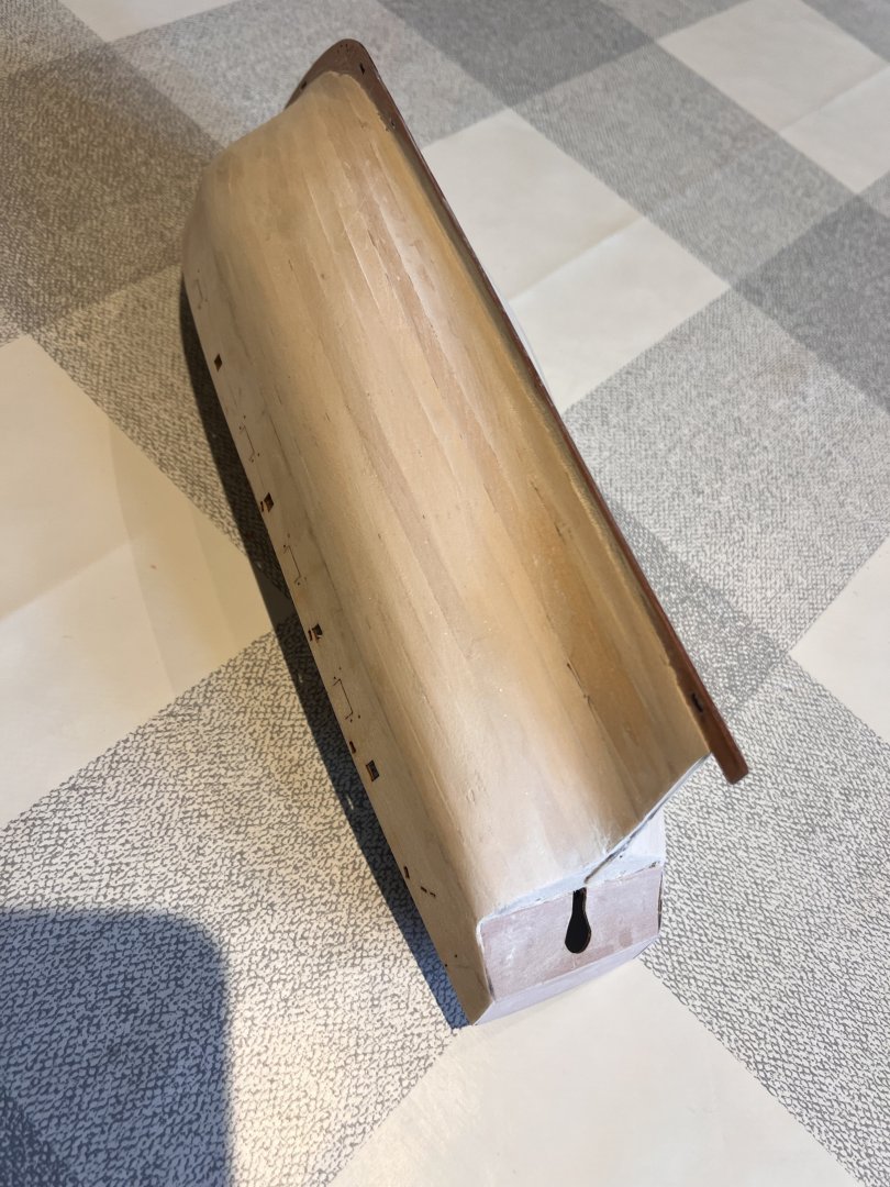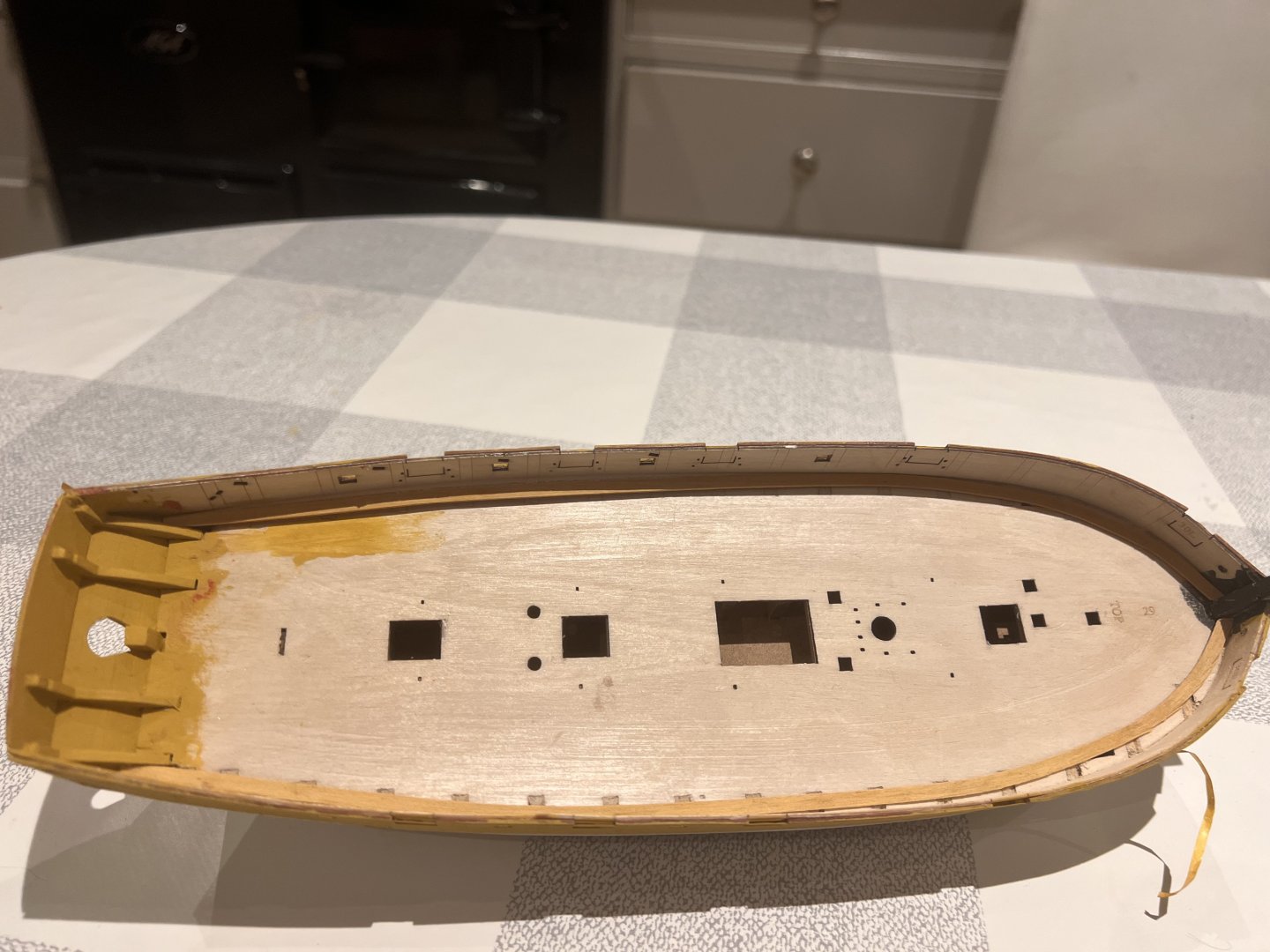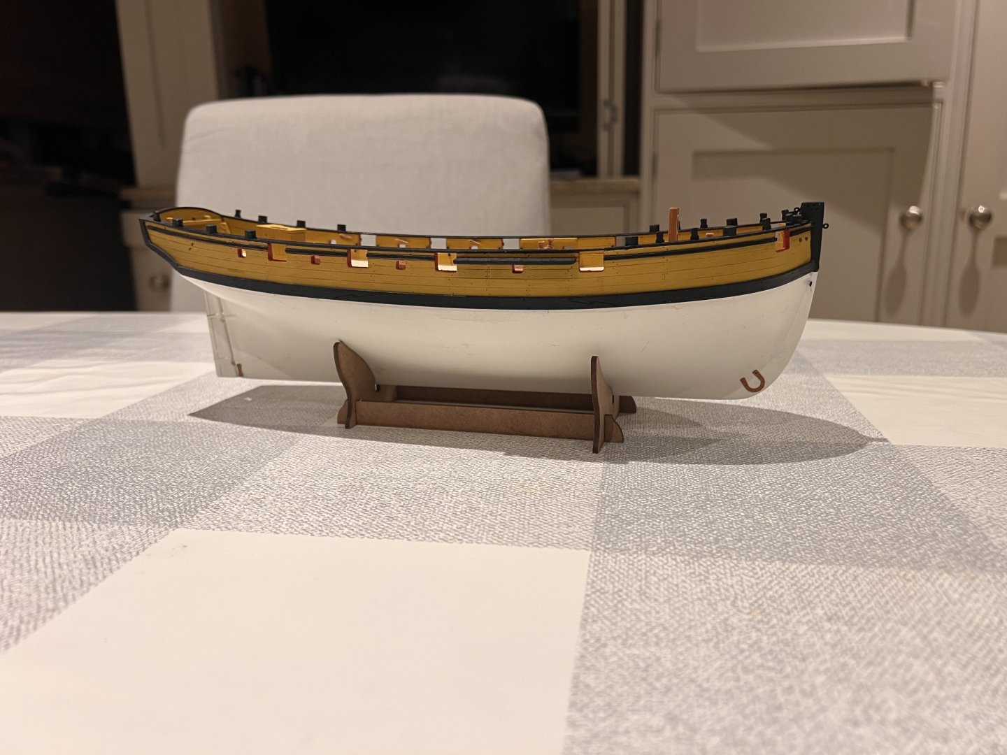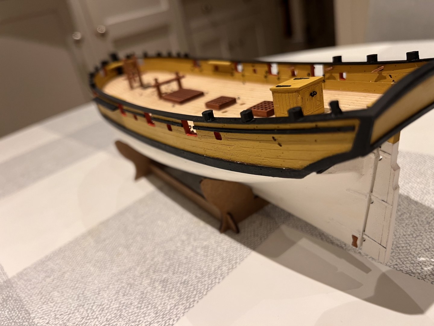 I’ve not had much time for shipbuilding recently, but I’ve managed to progress on Sherbourne slowly but not keep a full build log. My intent with this build was to work on three areas: 1. Learn to plank the deck. This goal failed. I ordered some expensive boxwood from a cabinet maker online. The strips that came were a deep yellow colour (apparently Boxwood can be). The real problem was that they splintered when I tried to soak them, bend them, cut them, etc. I started out using tracing / baking paper to trace the outlines of the margin plank from Chris’s engraved deck then glued this to a 1cm wide boxwood strip. Then tried to cut the shapes out but they splintered into pieces. I then tried soaking a strip and bending it to shape. I could just about get the shape, but the wood splintered in doing so. Clearly the wrong wood for the job. I got fed up so I reverted to the engraved deck rather than order a different wood to try. I really like the Vanguard engraved decks. I’m less keen when they’re cut away to show the interior as they are on Sphinx and Surprise. The cutaway deck works really well on Harpy as it makes the model much more interesting, but in my opinion detracts from the small frigates. It’s entirely a personal preference but I’d prefer they weren’t cut away as standard. I’d like to have had the option to fully deck Surprise myself so I can choose whether to have the cutaway engraved deck or not. I may have another go with deck planking on my next build (Speedy). 2. Paint the hull yellow ochre and see how it turns out. My planking can be messy so it’s nice to have the option of a fully painted hull. Sherbourne was one of my worst yet planking jobs, not that it mattered as everything that is planked is below the wales and painted white. I’ve been short of time and may have rushed the fairing so the planks didn’t lie as well as they should. Entirely my mistake. Some photos of the first planking below. It was worse than it looks here! I also snapped the inner plywood bulwark and am eternally grateful for Chris’s superb customer service at Vanguard. He very kindly sent me a replacement. 3. Mix and use wipe-on poly. You can’t easily buy wipe-on poly in the UK. I used the Blackfriars oil based polyeurethane varnish clear satin that BE recommended and mixed it with white spirit 50:50. Seems to work well. The effect on bare pear wood is almost identical to the finish I’ve achieved on other boats with Danish oil. Being a varnish I guess it seals and protects the wood better. The latter two have been a success - some progress photos below: There’s still work to be done to the hull before starting the rigging. I’m not going to put any ropes on the cannons on this build. I forgot to do so before fitting the ring bolts to the bulwarks and they’re so small on this build that I’m not going to try and add them later.