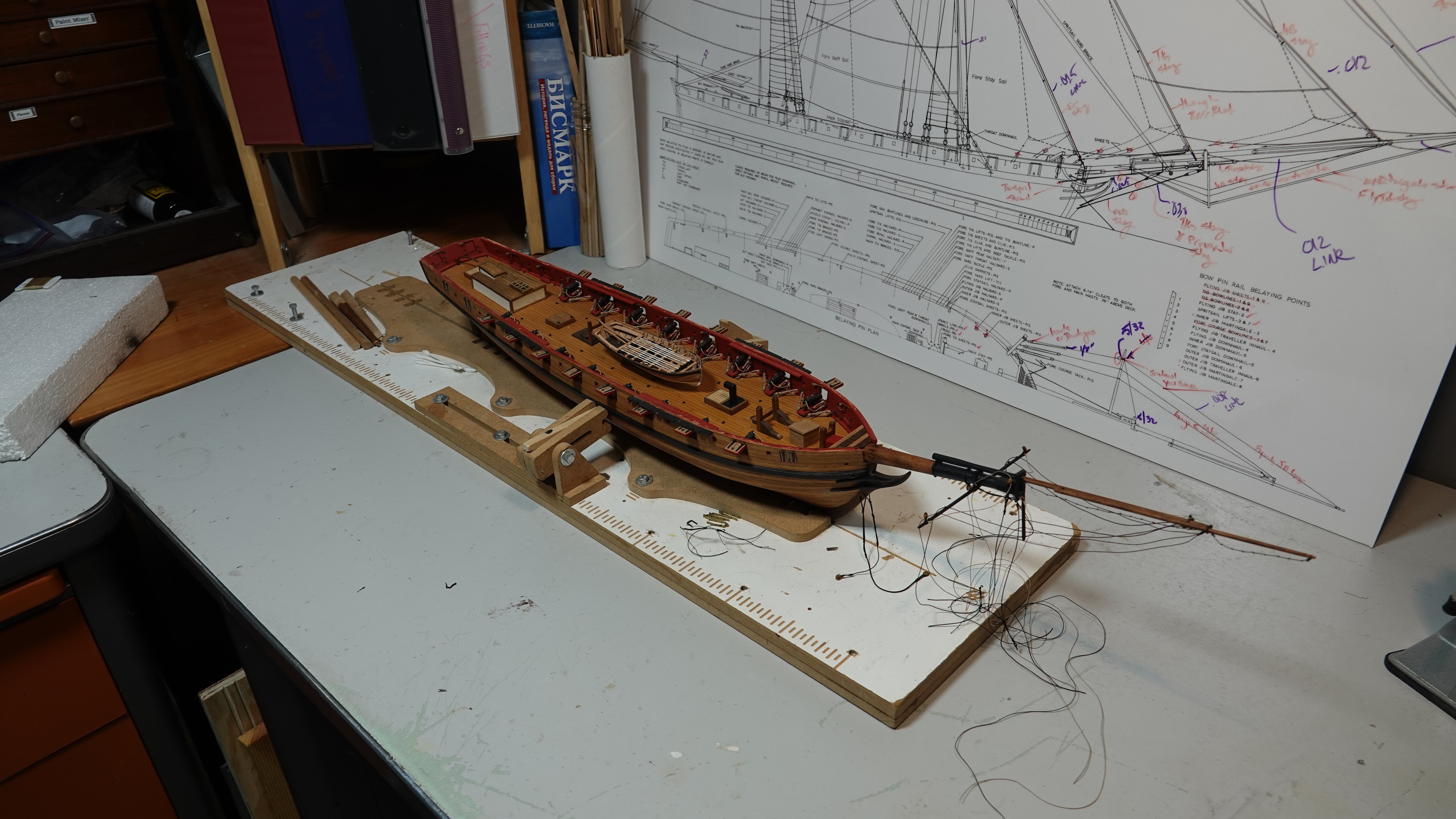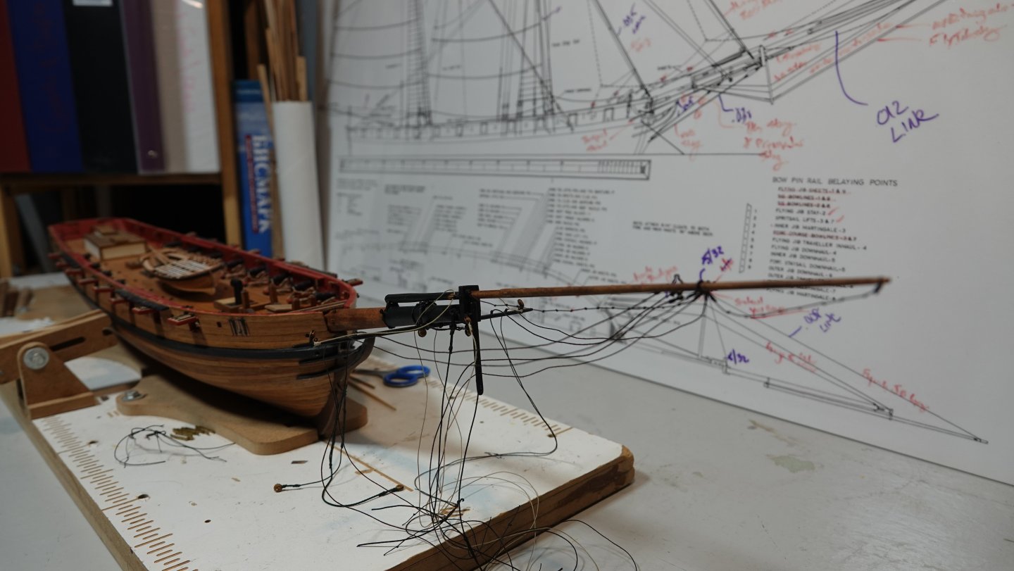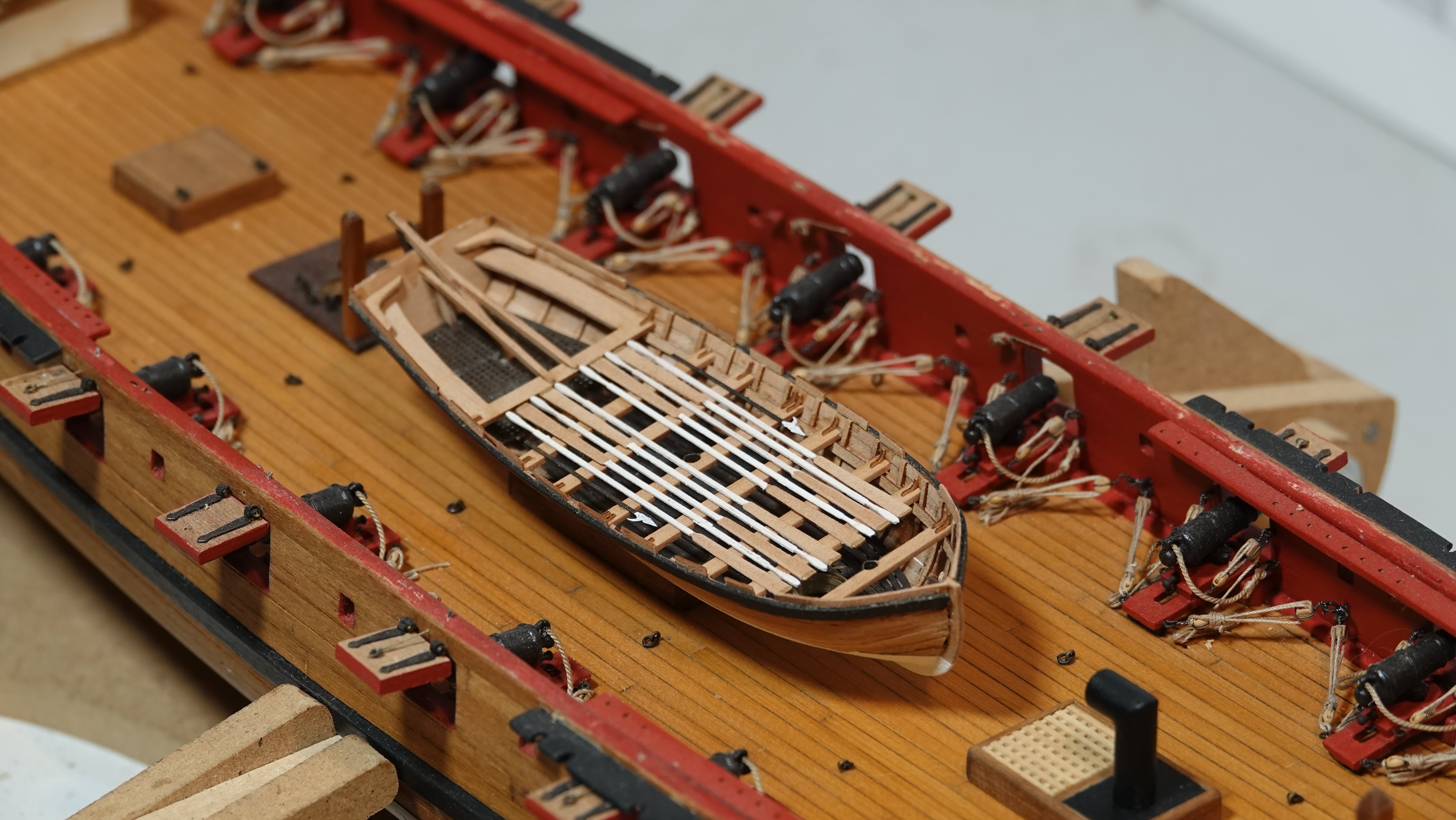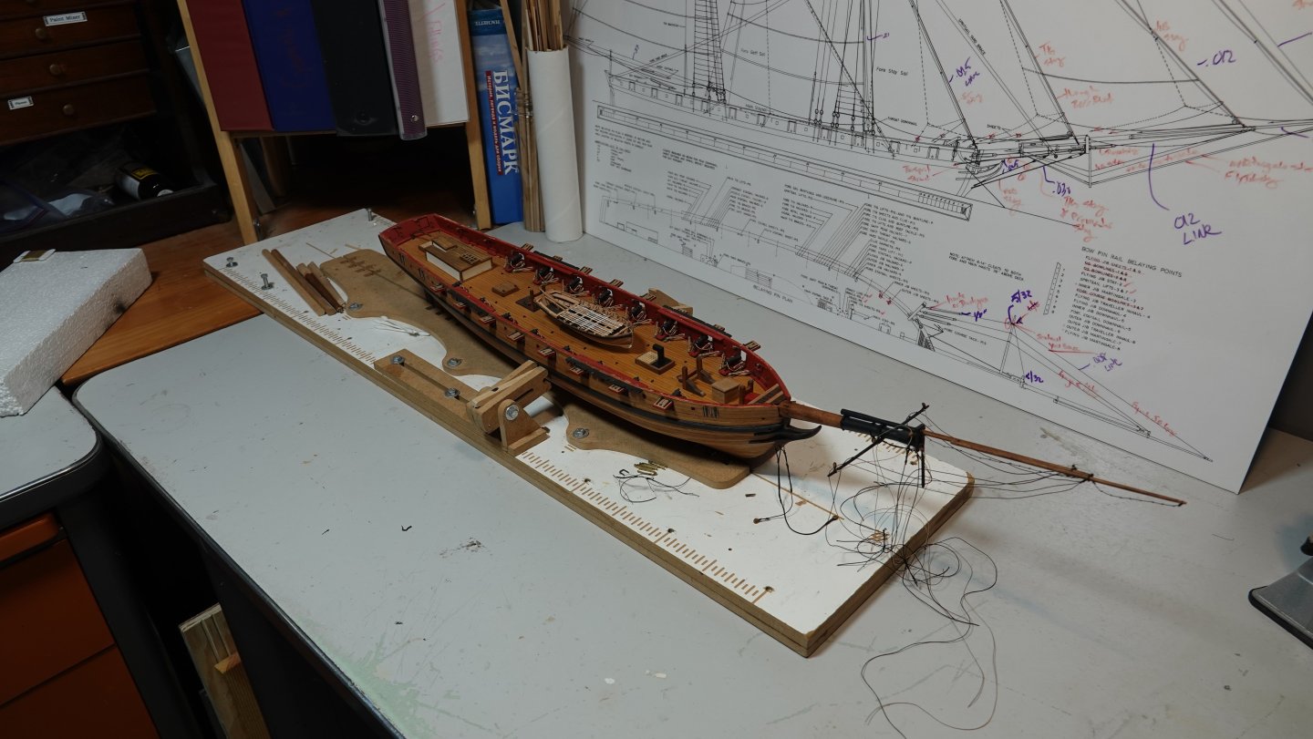 I don't know that I would call this a build log I have a number of other pictures in between where I left off my general build log and this. I've been working the bowsprit for a while now, all fabricated from milled boxwood. I'm following Chappelle's plans that I had obtained from the Smithsonian, then had laminated onto foam board so I can take notes with dry erase markers. Finishing the bowsprit will allow me to finally install the cap rails which would give the hull a much more finished look. The ship's boat is a kit from Vanguard. Enjoy.