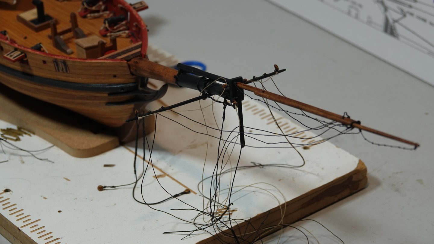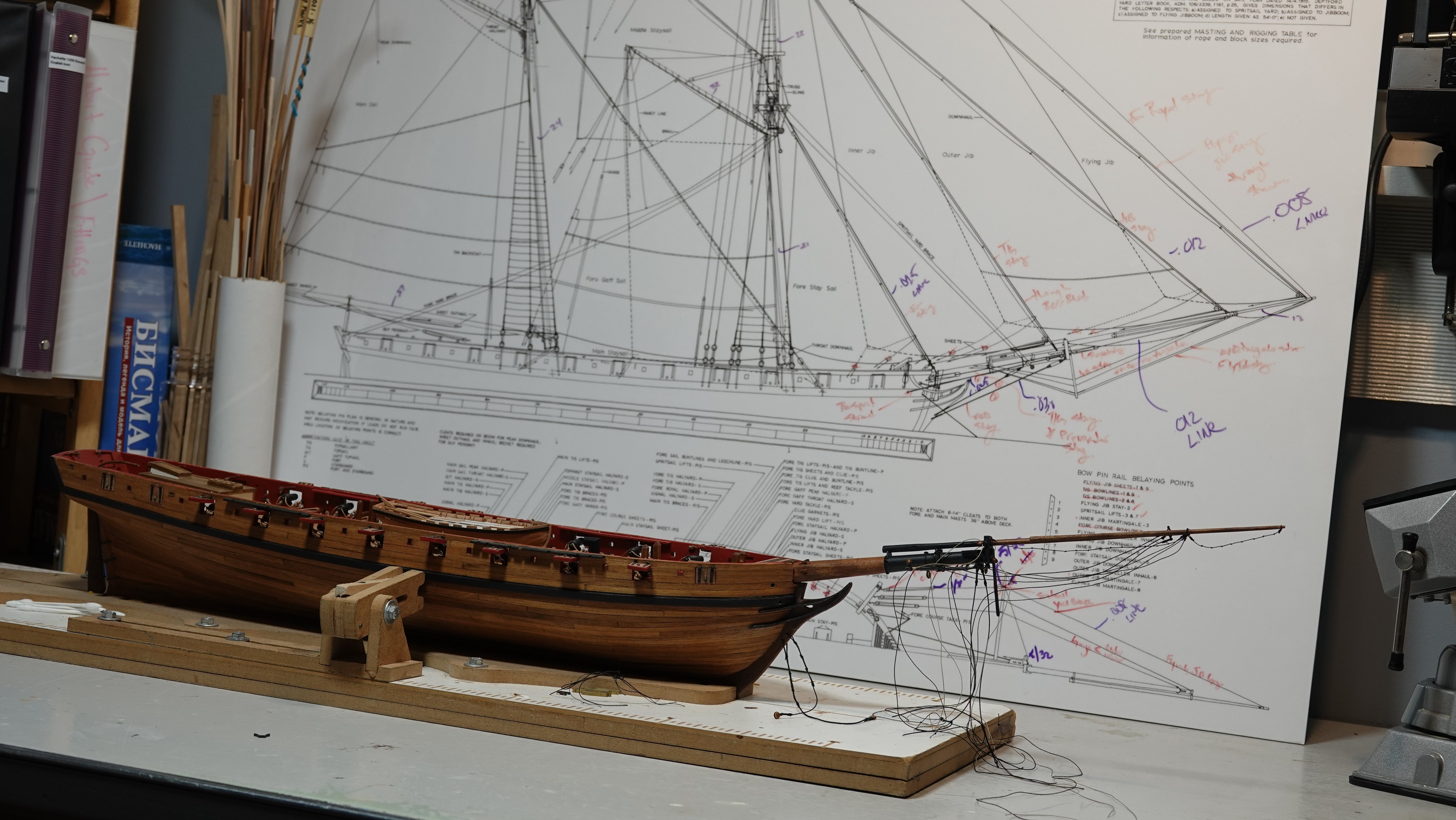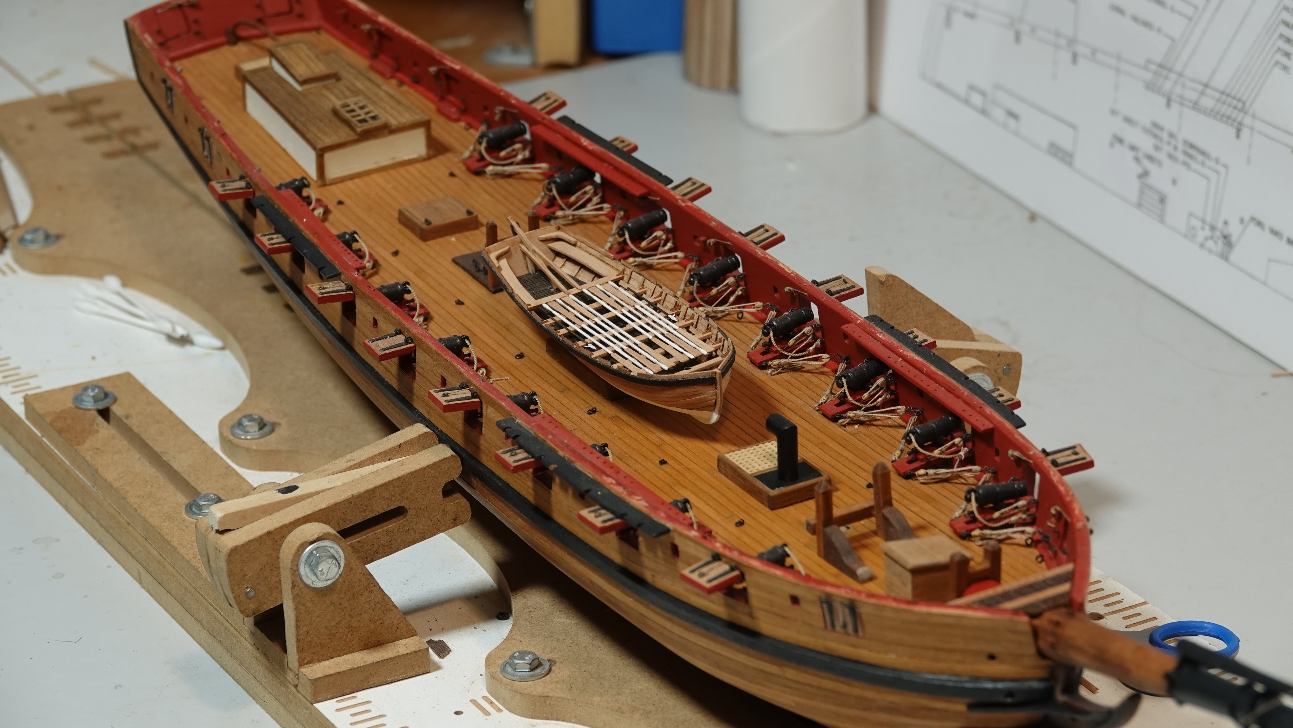 I don't know that I would call this a build log I have a number of other pictures in between where I left off my general build log and this. I've been working the bowsprit for a while now, all fabricated from milled boxwood. I'm following Chappelle's plans that I had obtained from the Smithsonian, then had laminated onto foam board so I can take notes with dry erase markers. Finishing the bowsprit will allow me to finally install the cap rails which would give the hull a much more finished look. The ship's boat is a kit from Vanguard. Enjoy.