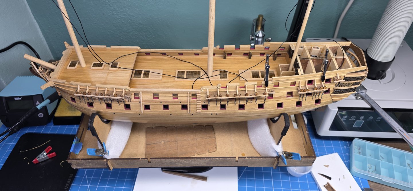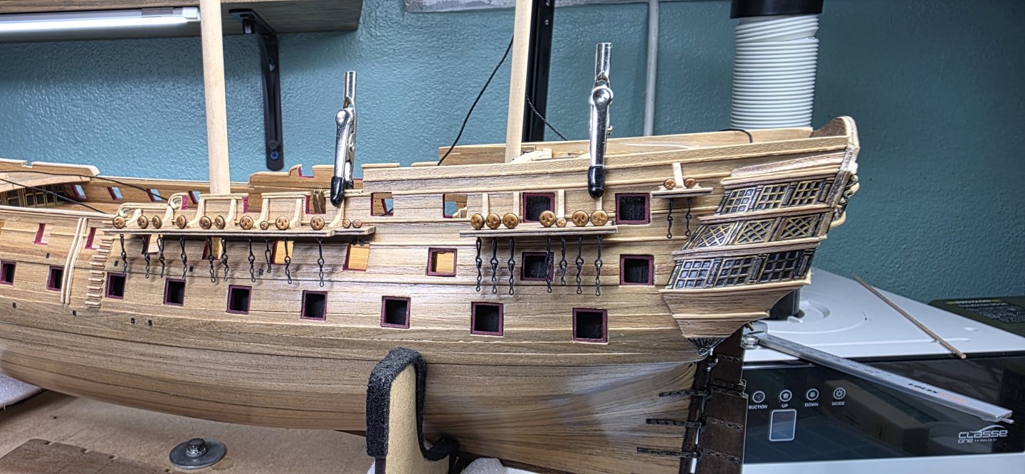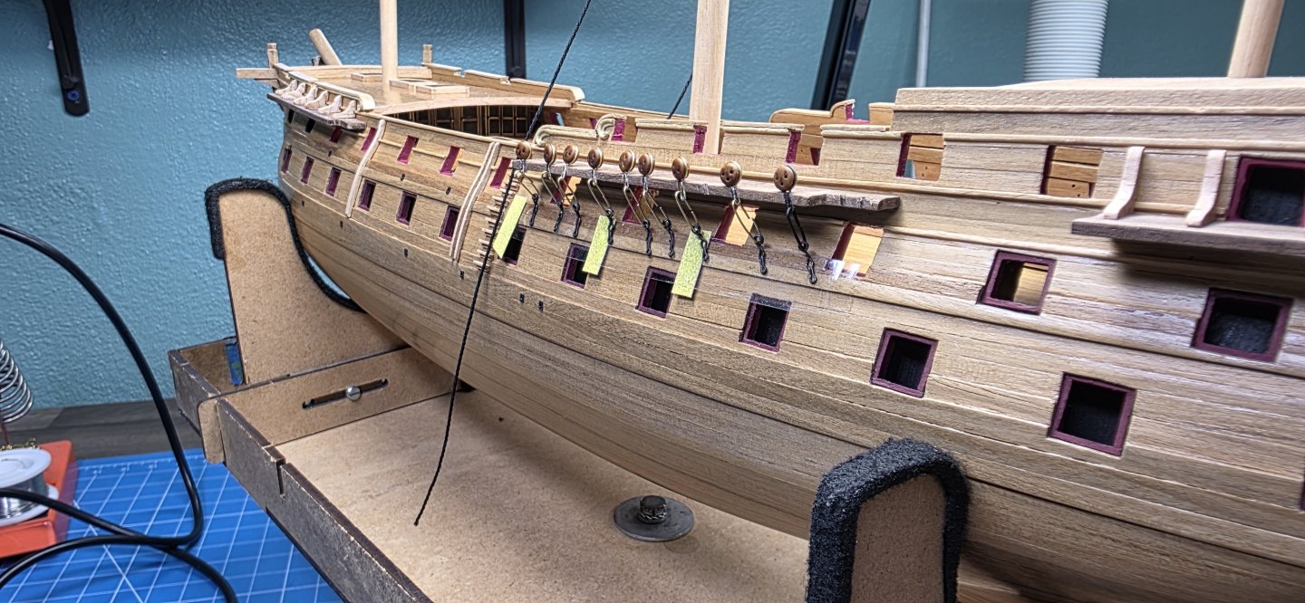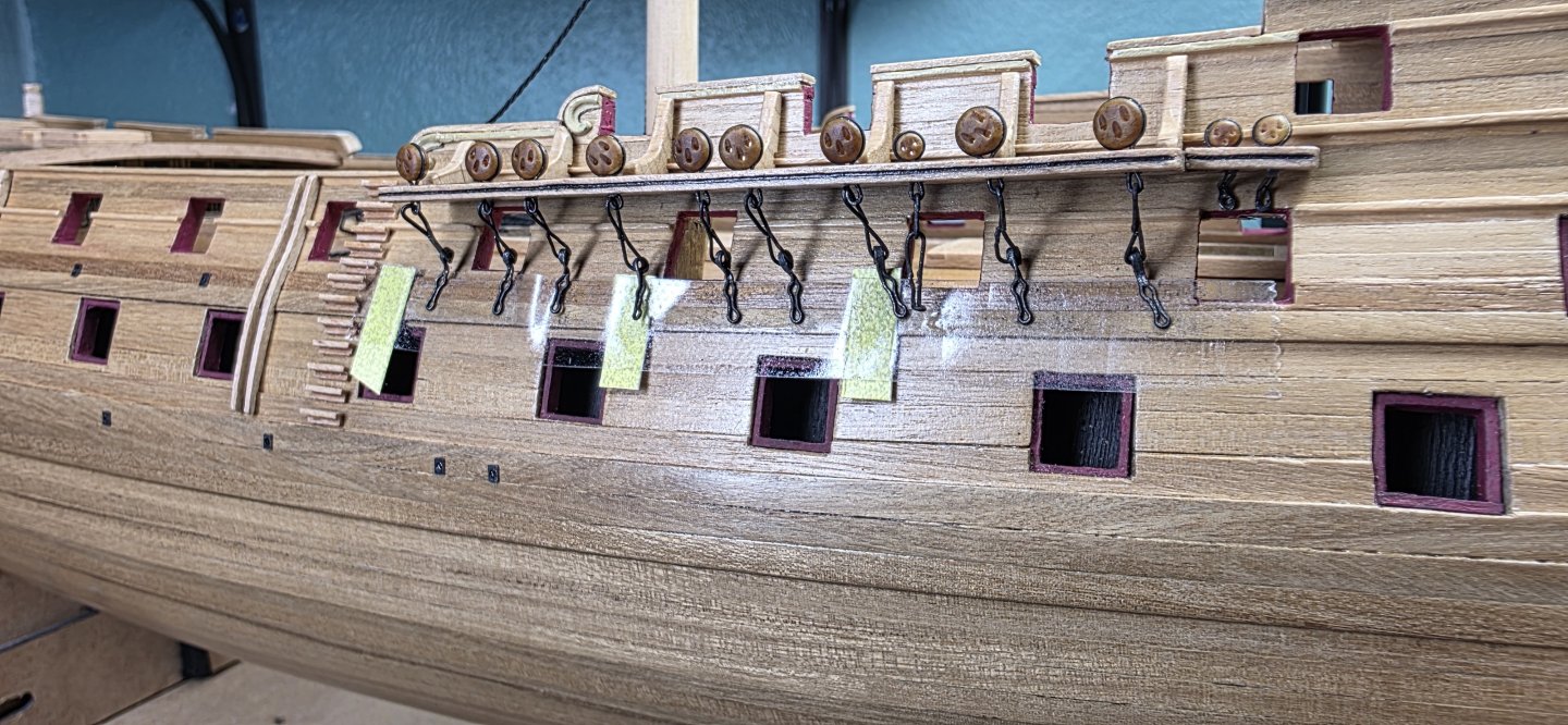 Hello All, I have a small update on Bellona. I completed the 20 cannons that will eventually be placed on the upper gun deck. It was quite satisfying to see them all placed on the deck and I am very satisfied with the way they turned out. I will keep them in storage for now until the time comes to permanently install them, which will probably be some time from now. After I completed the cannons, I moved on to the installation of the channels. The plywood channels that came with the kit were replaced using solid walnut that I fabricated sometime ago. The knee braces that came with the kit needed a notch carved in them to fit between the raised molding on the hull. I used a third hand to help with getting the rough positions of the channels and applied two-sided tape to the channels to help with holding the knee braces in place. I made a couple of templates of the knee braces to get their final shape as the kit only came with the exact quantity needed and I didn’t want to mess up any of them and have to make new ones from scratch. I drilled holes in each of the channels and installed pins to attach them to the hull. Pretty straight forward technic. I shaped a groove in the center of a piece of 2mm x 2mm beechwood that will be installed as the channel rail securing the chainplates in place. I highlighted the rail channel molding using a black pigment pen which will match the molding on the head rails. I think having this detail on all the channels is going to add a nice flow to the natural colors I am using. After I completed the channels and knee braces, which I have not permanently installed yet, I started working on the chain plates and deadeyes. Well, I must say that the deadeyes and chain plates that came with the kit are awful. There are two sizes of deadeyes that are called out for in the plans. 5mm and 3mm. The 5mm deadeyes are more like 5.4mm and the 3mm ones are 3.9mm. I replaced them with ones that I purchased from Syren, and I must say not only are they much more authentic looking in comparison, but they are much more accurate in their sizes. There isn’t much room on the channels to begin with, so using the kit supplied parts would probably cause me some spacing problems. Well, I have begun the daunting process of making the chainplates from scratch and will provide and update on them once I have made some progress. That’s all I have for now and as always, your comments and guidance are always welcome. Cheers Nearshore