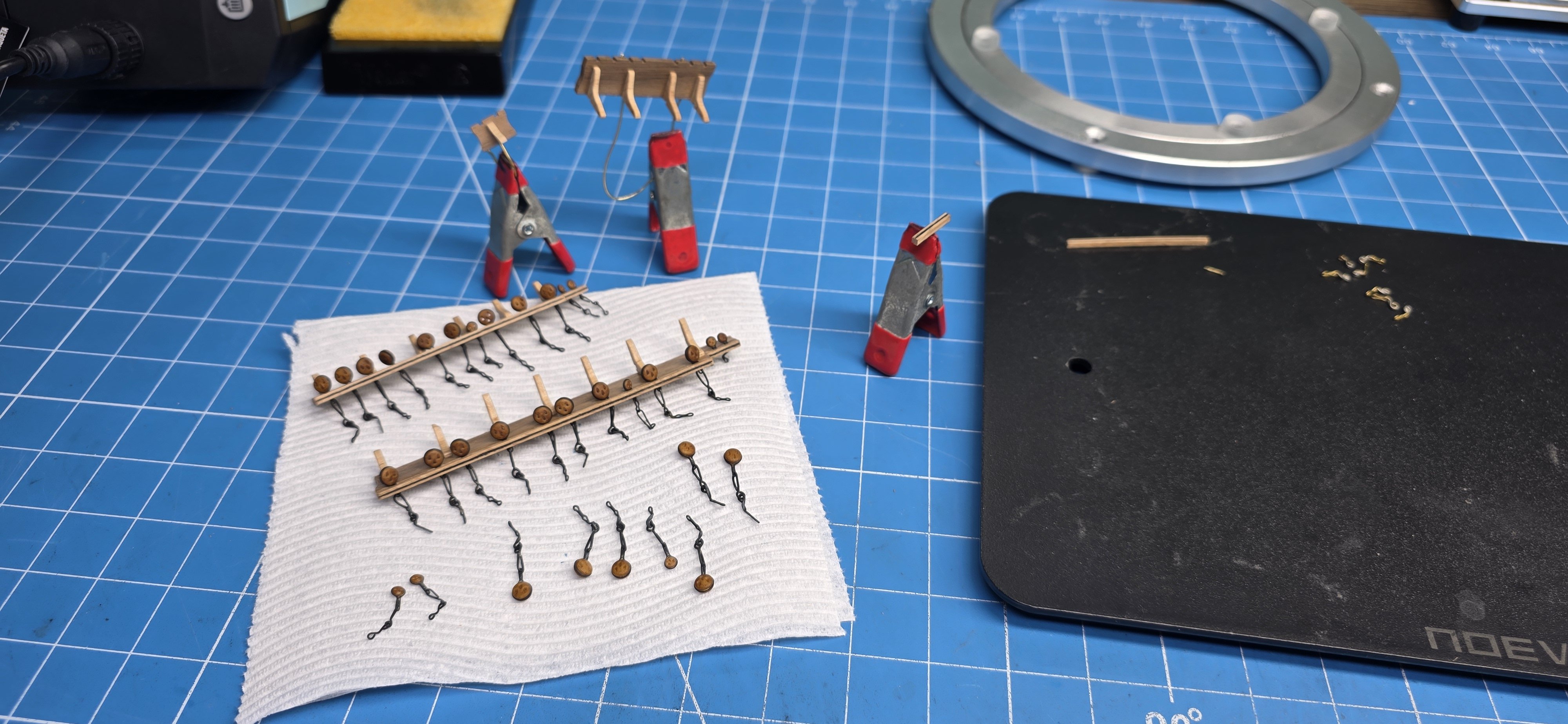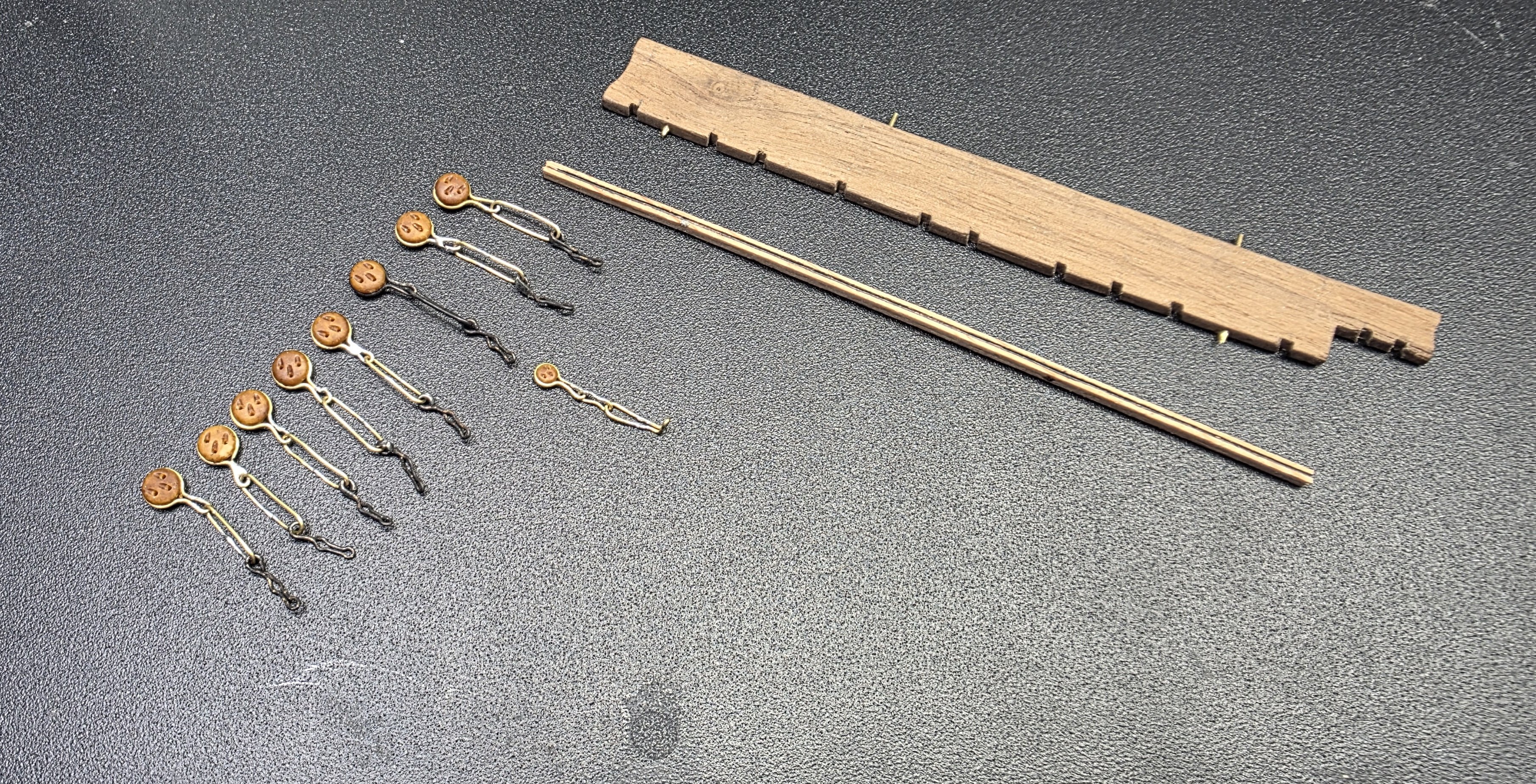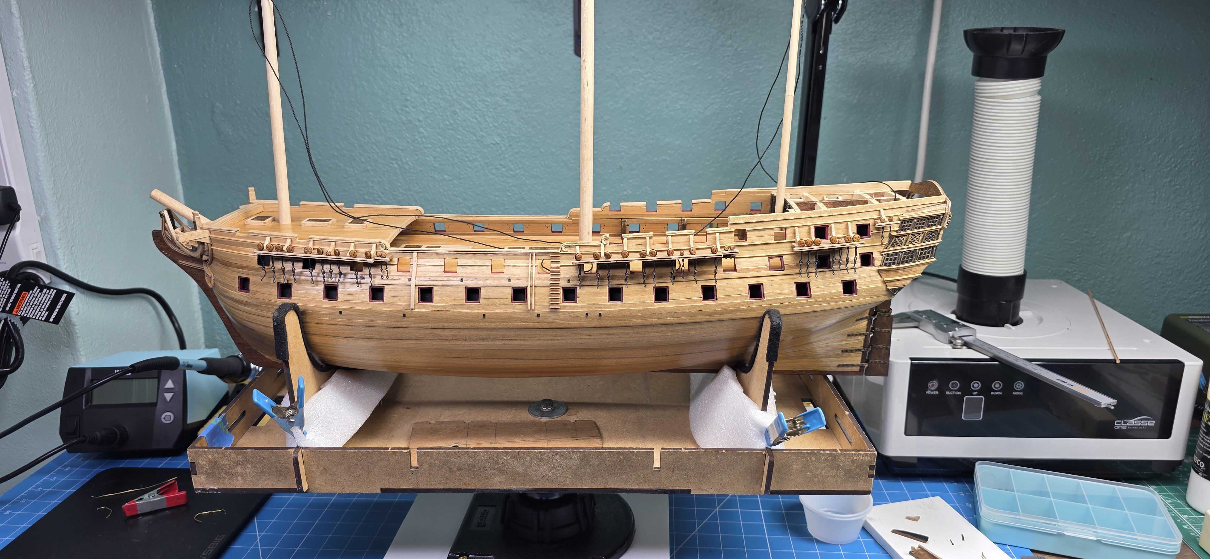 Hello All, I have a small update on Bellona. I completed the 20 cannons that will eventually be placed on the upper gun deck. It was quite satisfying to see them all placed on the deck and I am very satisfied with the way they turned out. I will keep them in storage for now until the time comes to permanently install them, which will probably be some time from now. After I completed the cannons, I moved on to the installation of the channels. The plywood channels that came with the kit were replaced using solid walnut that I fabricated sometime ago. The knee braces that came with the kit needed a notch carved in them to fit between the raised molding on the hull. I used a third hand to help with getting the rough positions of the channels and applied two-sided tape to the channels to help with holding the knee braces in place. I made a couple of templates of the knee braces to get their final shape as the kit only came with the exact quantity needed and I didn’t want to mess up any of them and have to make new ones from scratch. I drilled holes in each of the channels and installed pins to attach them to the hull. Pretty straight forward technic. I shaped a groove in the center of a piece of 2mm x 2mm beechwood that will be installed as the channel rail securing the chainplates in place. I highlighted the rail channel molding using a black pigment pen which will match the molding on the head rails. I think having this detail on all the channels is going to add a nice flow to the natural colors I am using. After I completed the channels and knee braces, which I have not permanently installed yet, I started working on the chain plates and deadeyes. Well, I must say that the deadeyes and chain plates that came with the kit are awful. There are two sizes of deadeyes that are called out for in the plans. 5mm and 3mm. The 5mm deadeyes are more like 5.4mm and the 3mm ones are 3.9mm. I replaced them with ones that I purchased from Syren, and I must say not only are they much more authentic looking in comparison, but they are much more accurate in their sizes. There isn’t much room on the channels to begin with, so using the kit supplied parts would probably cause me some spacing problems. Well, I have begun the daunting process of making the chainplates from scratch and will provide and update on them once I have made some progress. That’s all I have for now and as always, your comments and guidance are always welcome. Cheers Nearshore