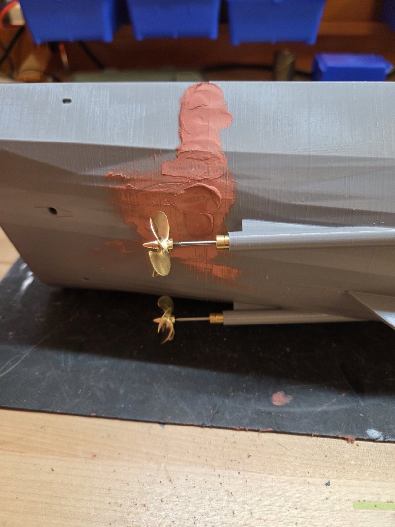 Got busy with other things this week....some hiccups getting the new printer sorted out too. VERY happy with the Bambu H2S so far. That said, some parts and bits have shown up in the mail this week - VLS rocket pack quick connectors, prop shafts, and my Keith Bender 5 bladed modern props. 2mm thread, 28mm outside diameter. VERY pleased with them. The hull should be finished printing tomorrow afternoon. Of note, the Bambu is about 2-3 times faster than the Prusa. Plus a heated chamber. Amazing.
