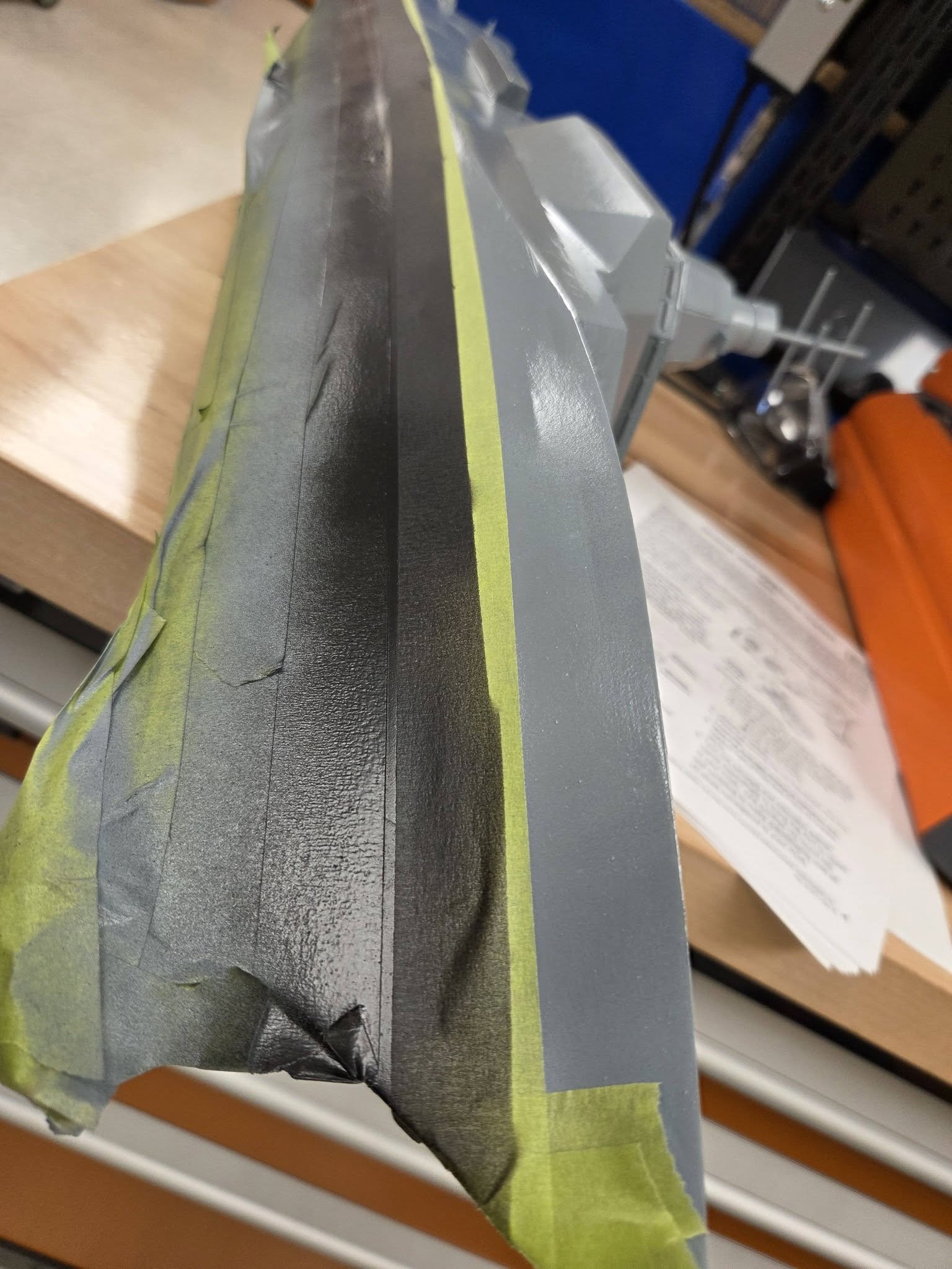 Another layer of bondo, and a bit more primer, and today's sanding saw me penetrate the plastic in one or two small spots. I rescued those with some superglue, but there is a limit to how much sanding that can be done....so....I'll do a light bit of touch-up next week (off to the field with the Army this weekend to play with drones and Carl Gustavs) and then I'll roll into masking and painting.