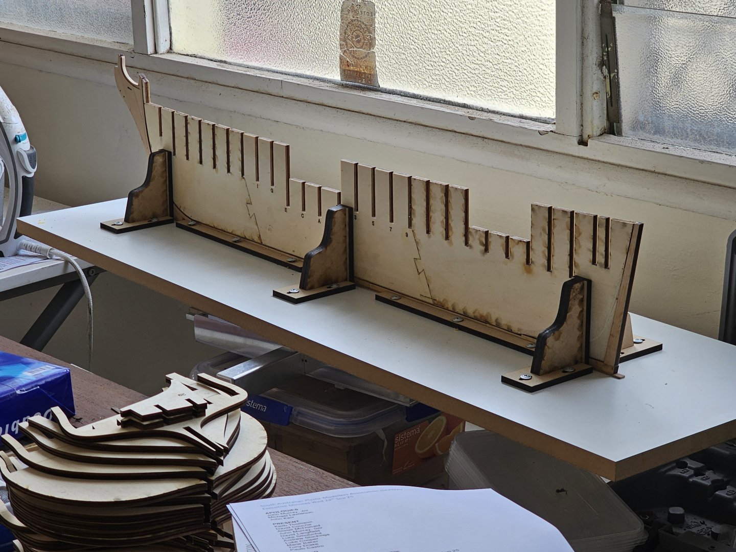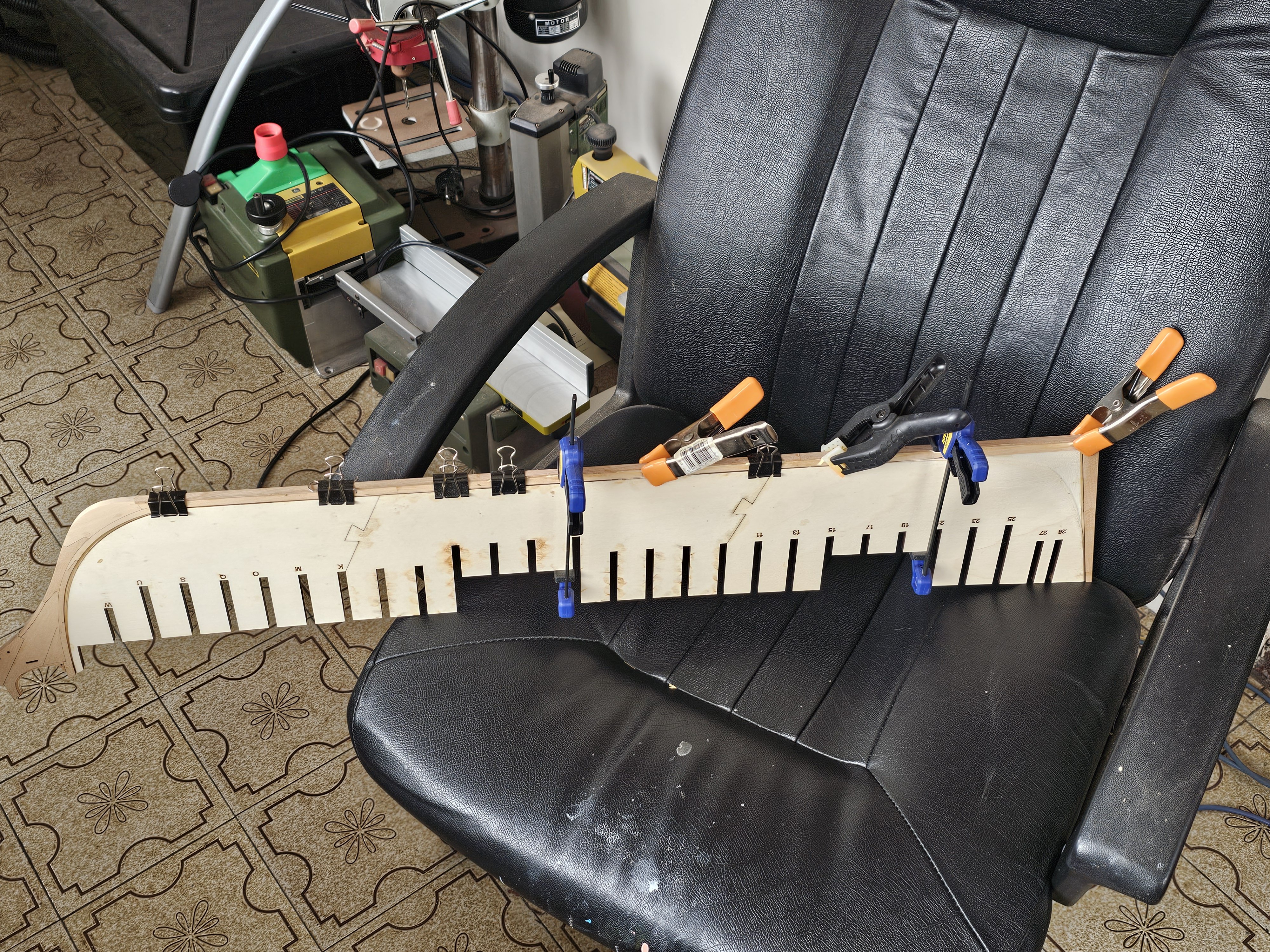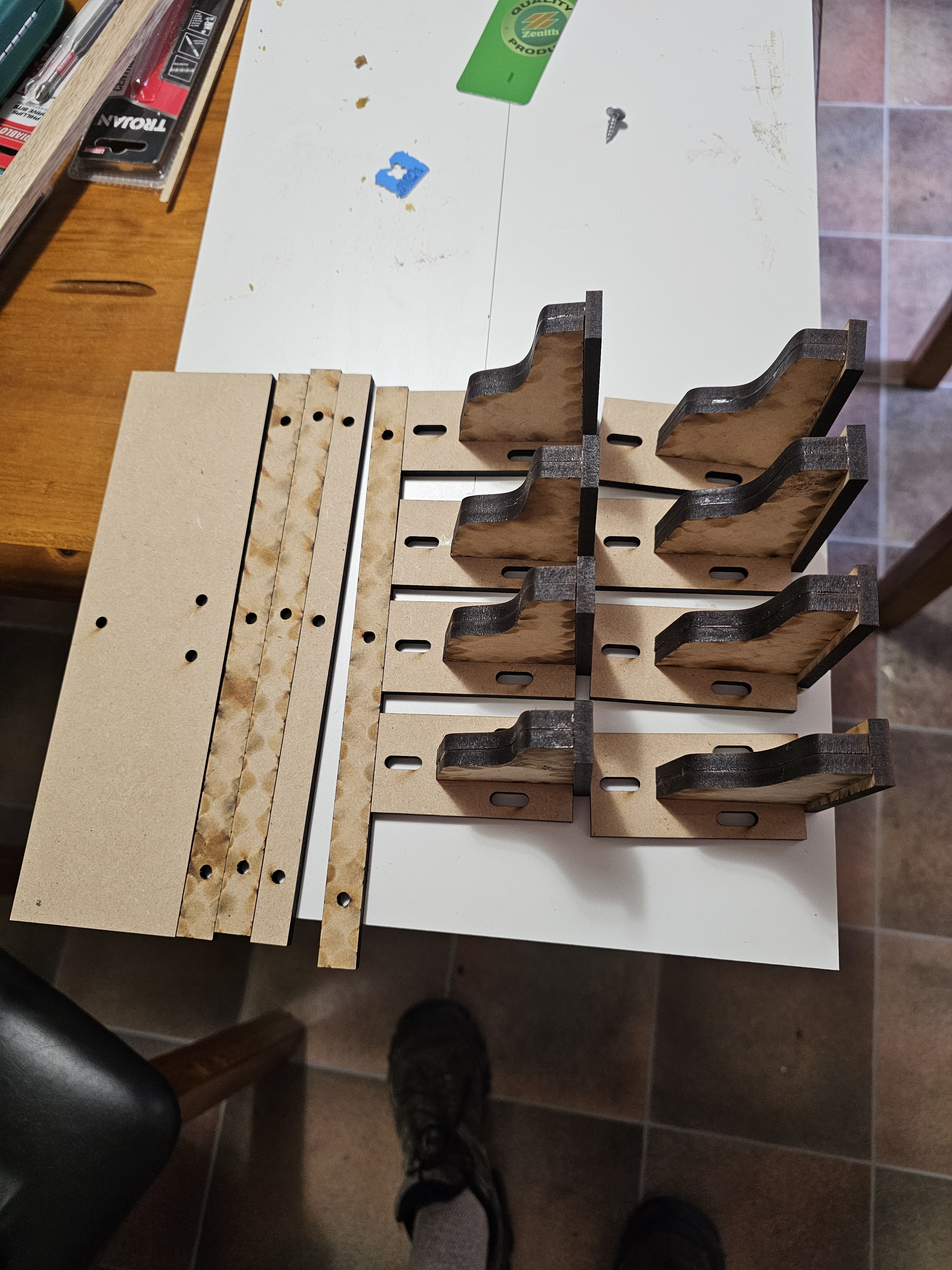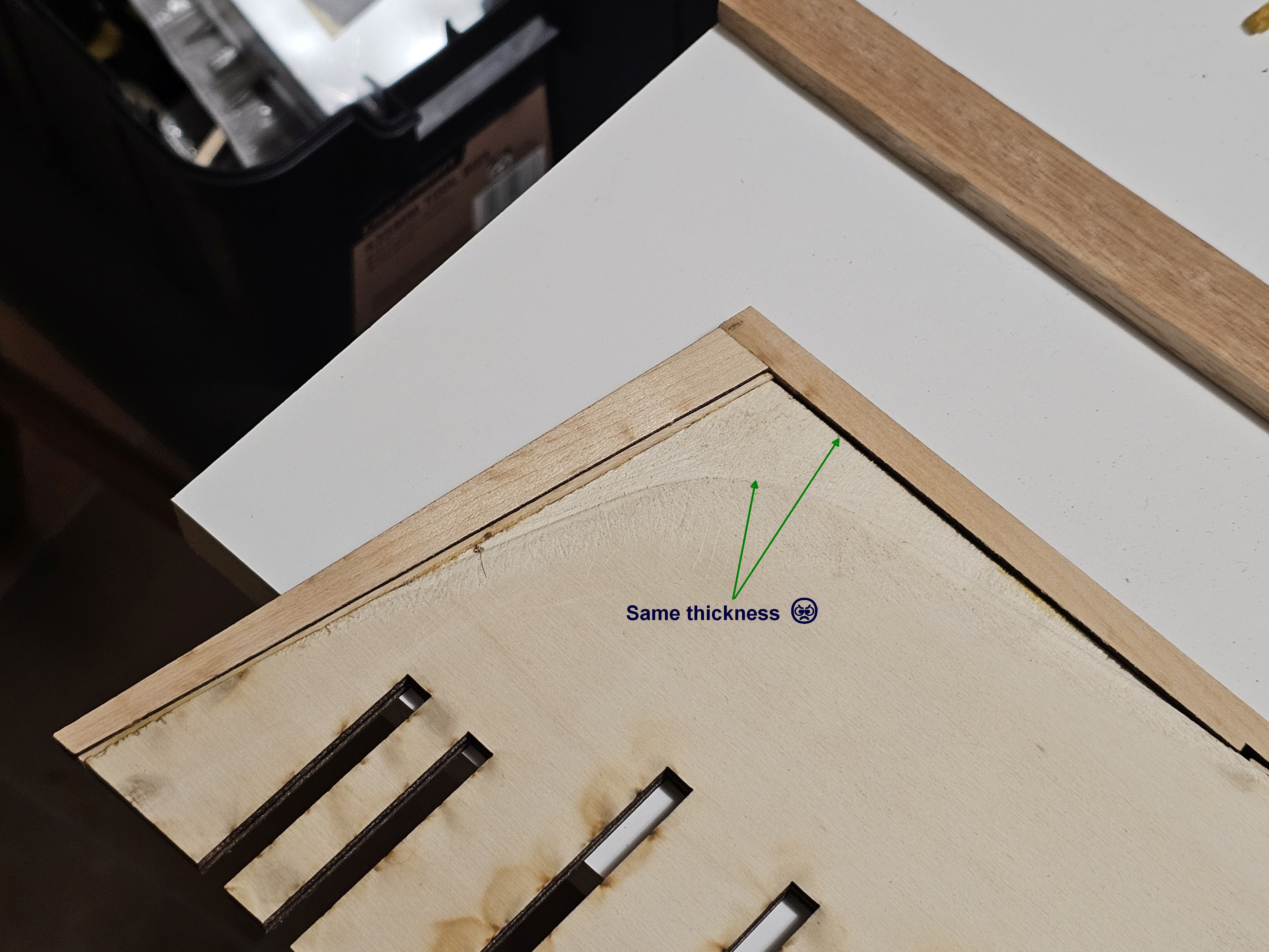 13. I spent some time gluing up the parts. One thing I noticed whilst I was watching the laser cut was that around 2 thirds of the lines would cut with a single pass of the laser. These resulted in nice clean cuts. However, the remaining lines each had up to 10 or more passes which resulted in scorching and small holes from I assume reflections of the aluminium grid it was resting on as the beam repeatedly passed over the same path. As can be seen in the two images, some of the joints are spot on. However, there were other joints where the wood had been scorched away from repeated passes of the laser. This resulted in gaps in some of the joints. I have highlighted problem areas in the two images. The scorch mark are obvious in the images I posted above. That is the top side view of the board. The underside was much worse. I suspect the person operating the laser (I wasn't inducted) did not know how to correctly setup for the cherry. I did not notice a setting in the software for wood except MDF or Plywood. I shall be modifying my approach to this piece. I used 1 1/4" cherry and after cleaning the scorch marks and correcting a very slight bow I induced from the glueup, To glue up I will be using pins and a board to hold the pieces flat whilst drying. This attempt though I did not. (I used my Proxxon Planer then Thicknesser to flatten and clean up both sides.) I ended up with a flat stem at 210 thou instead of 250 thou. It shall be remade and I am considering changing from Cherry to another wood that I can source in Australia. Poplar or Huon Pine. I have also attached an image of two other laser cuts I made on the same wood panel. This show the underside though with the scorching. Unfortunately I did not get an image of the stem panel underside.