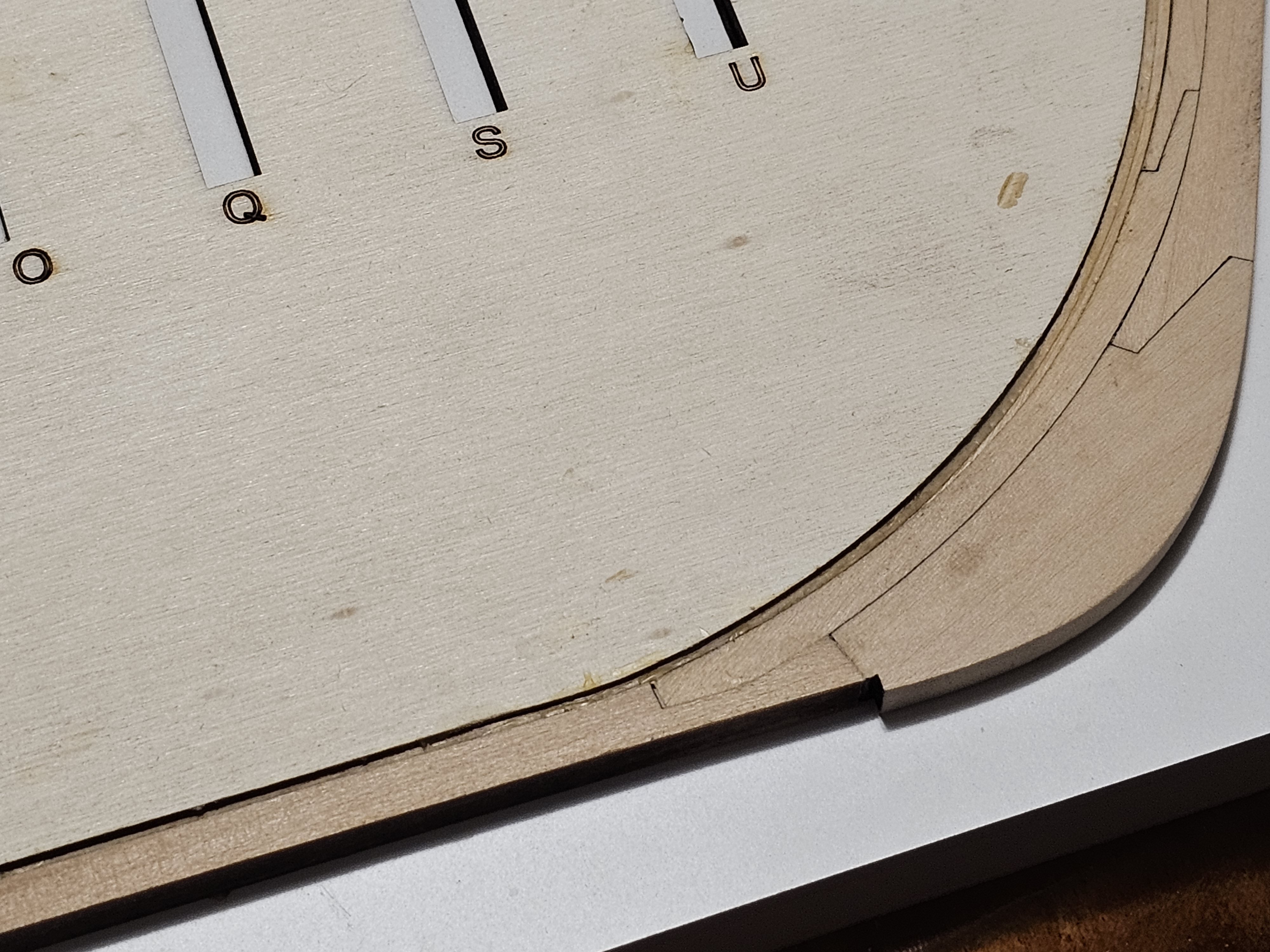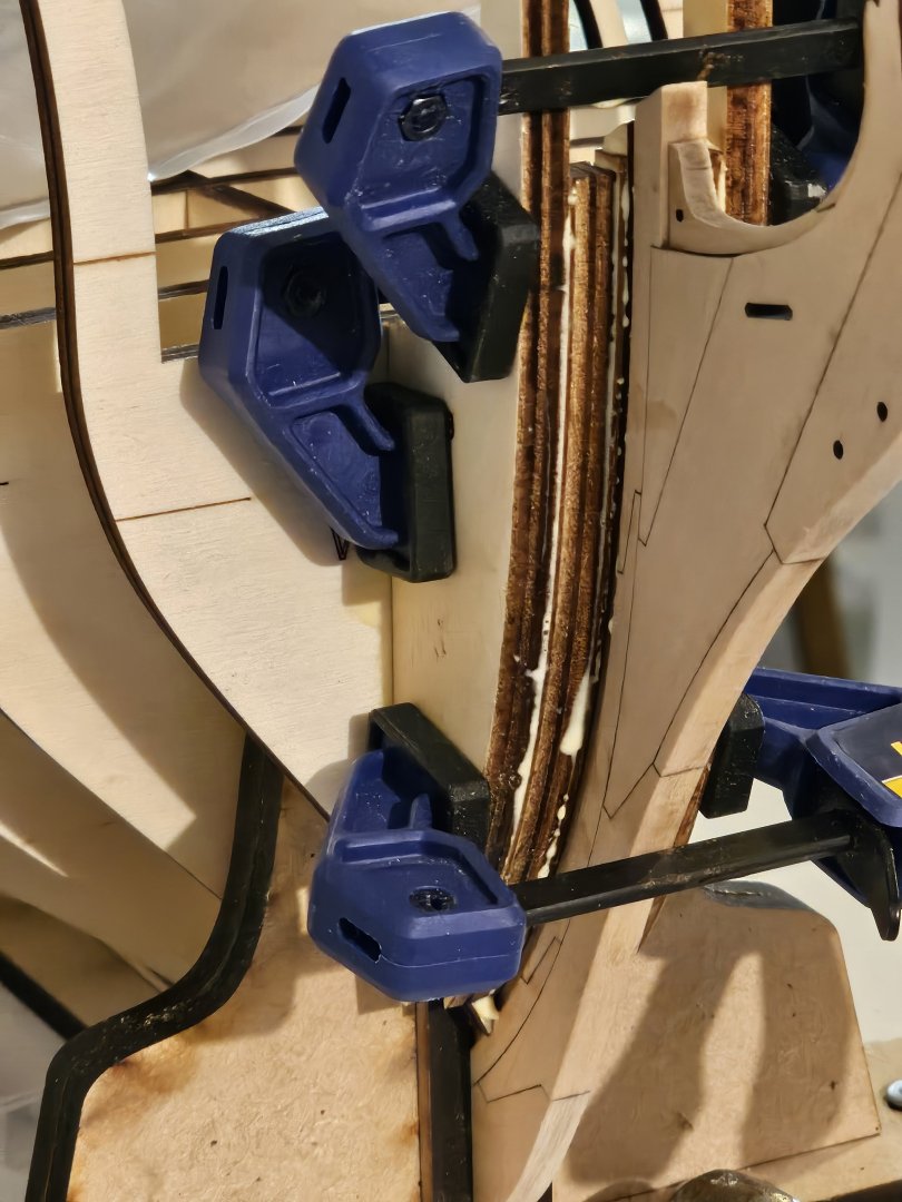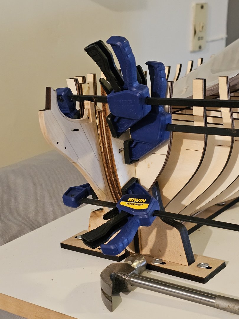 1. I visited a local specialist timber supplier who had various veneers of different thicknesses. I got 3 pieces of 750mm x 190mm x 0.5mm thick Rock Maple. I cut two of them into 4 pieces just over 300mm long. I then used Titebond II to glue two together giving me 2 final pieces at 300mm x 190mm x 1mm thick. The glue layer will add a touch of thickness I hope. I have them both under a weight of books to keep them flat until fully cured overnight. Checking them this morning I found the veneers had corrugated due to uneven glue thickness when applying it. Bugger. I know why though so that issue won't crop up in future. So, today I went into the makerspace and used the laser to cut 6 of the spacers (I only need 4) from the 0.5mm veneer I had. I glued two of the spacers together which gave me 1.15mm thickness which is close enough. I clamped the two of them between two planks of flat wood for two hrs. Releasing them, I found the laminations were flat, not corrugated. These two final pieces are BF-1. There are two pieces BF-2, and a further two pieces BF-3. 2 stacks comprising in order, BF-1, BF-2, and BF-3 were glued together and placed into the bow of the ship and glued into place. Now they are cured, It is time to start fairing the hull. I anticipate a few days to do this as I am house sitting a dog in their house for the next 10 days. After that, I start assembling the gun ports.