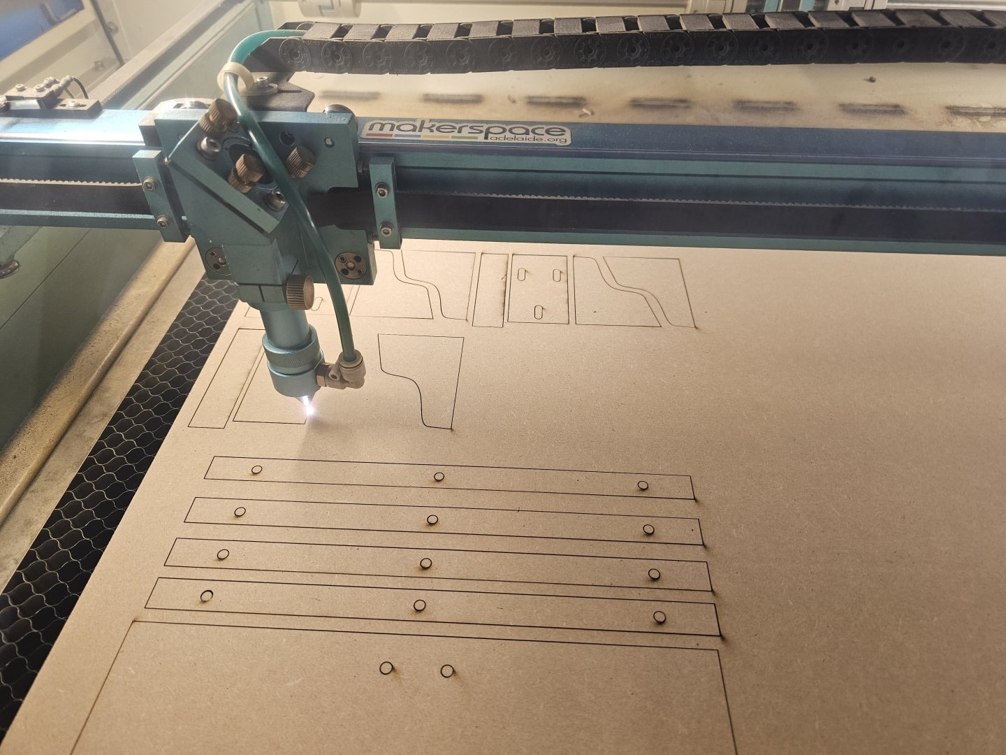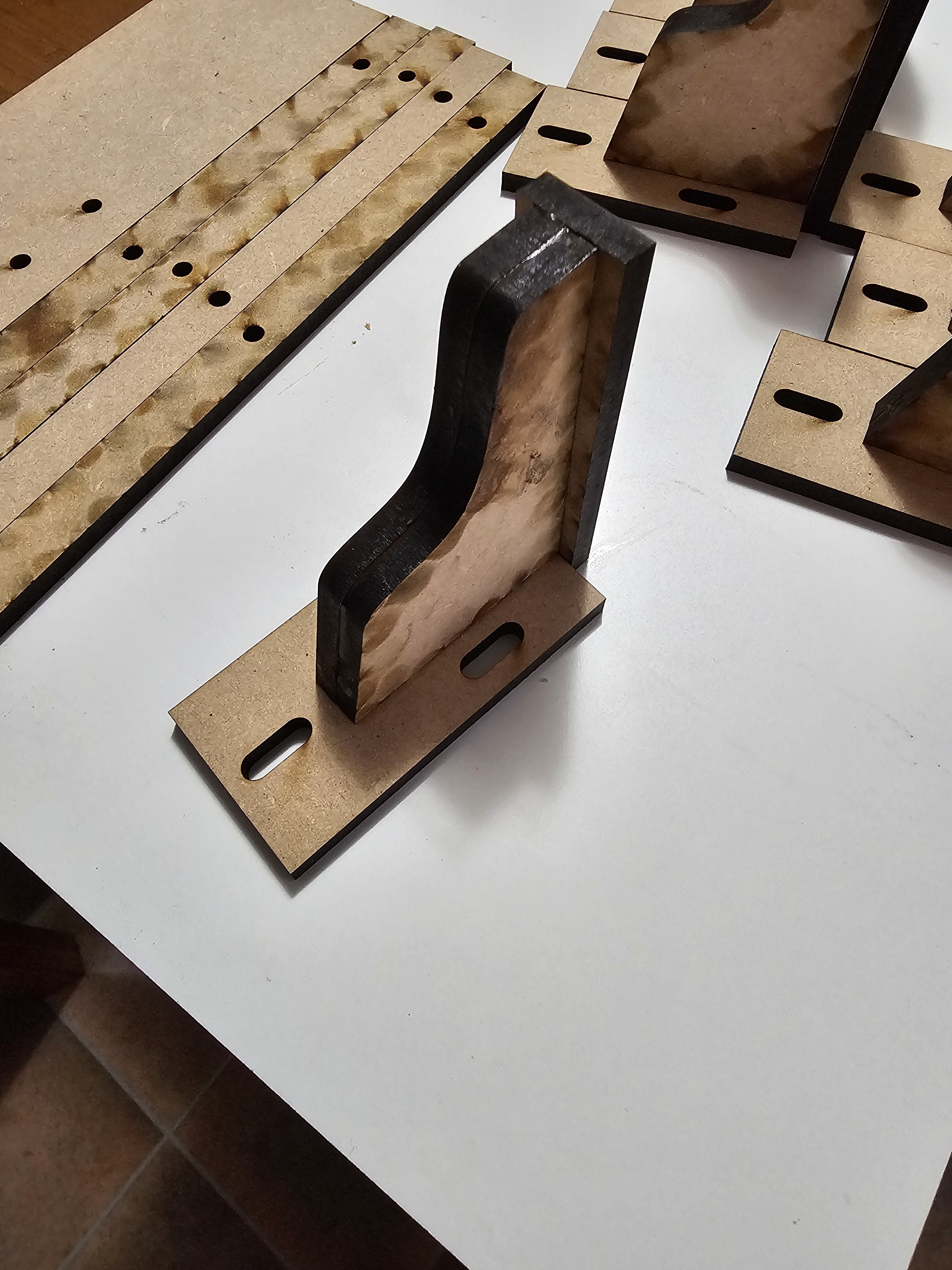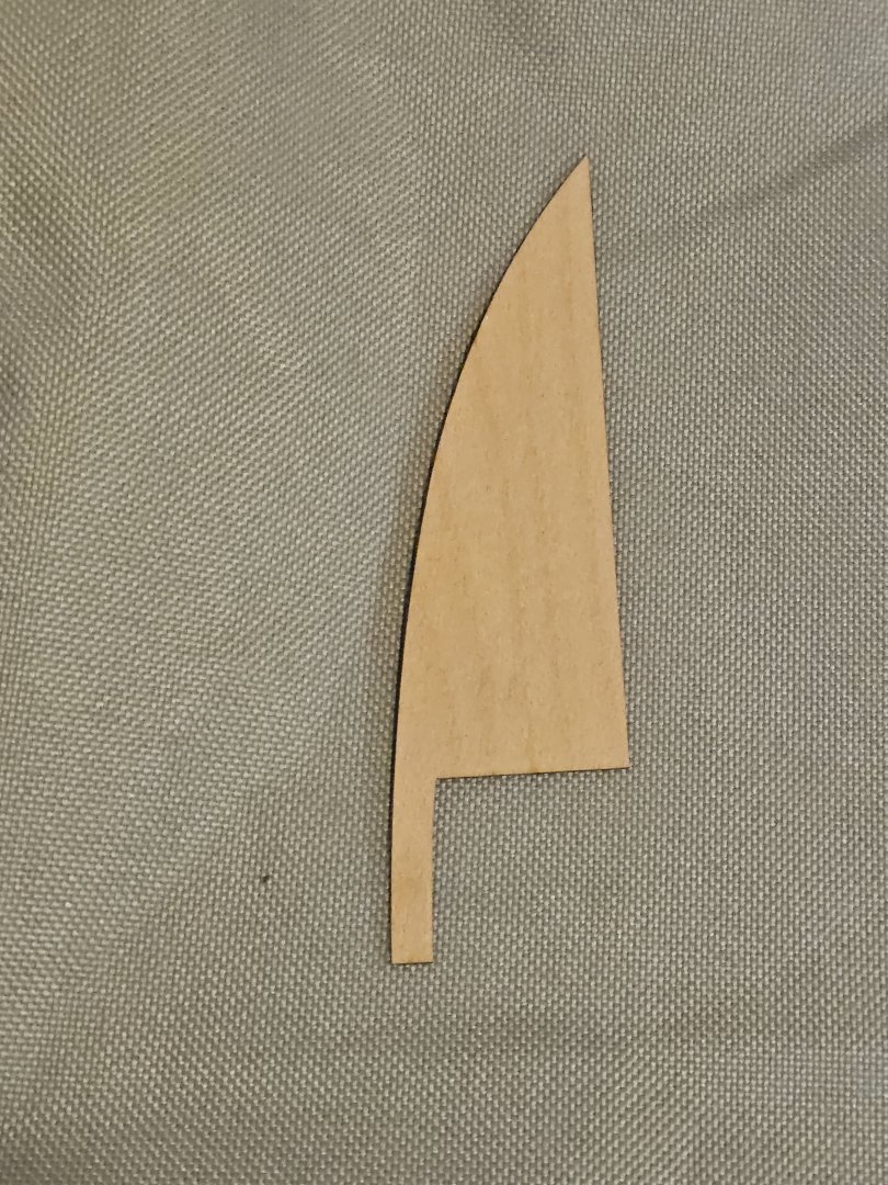 11. I have assembled my 3rd version of the stem after having issues with the laser using too much power.. I used some Sassafras that I had and thicknessed 3 300mm x 80mm x 6.35mm planks with my Proxxon DH40 thicknesser. I used one plank to calibrate the lasers power to the material and then cut the pieces out on the 2 remaining planks. I had taken the original files and used acrobat and illustrator to make new cut files that would fit the plank sizes I had. I may use this as the final version of the stem.