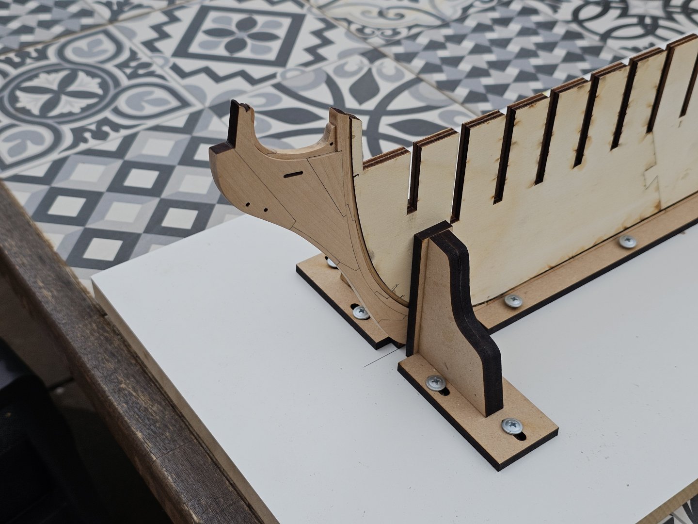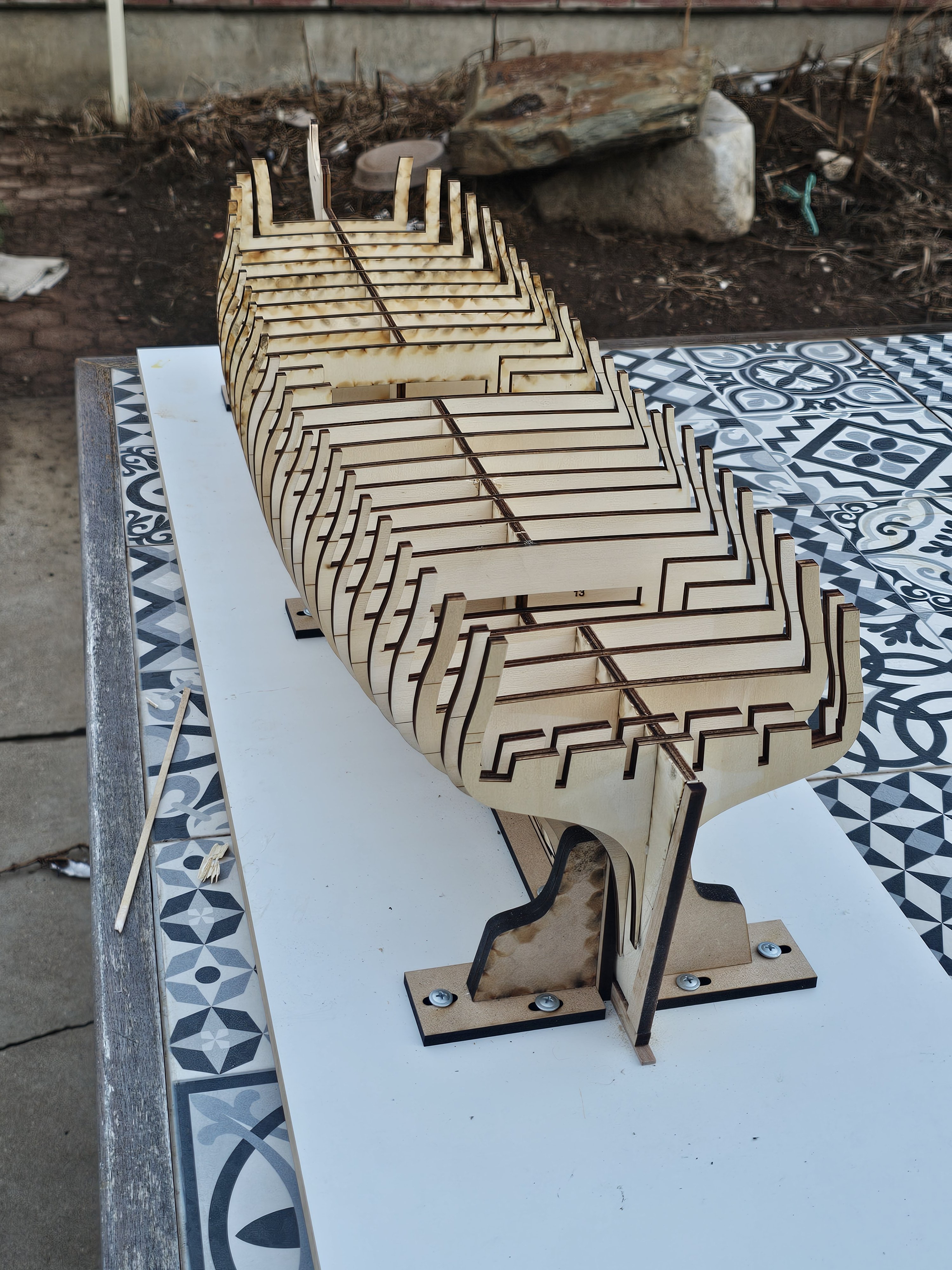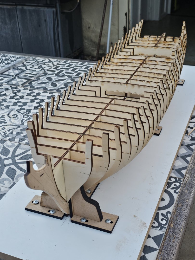 9. All of the joins were as supplied in the files. I calibrated the cut power as best I could. I have not yet investigated the kerf or taper of the laser. The machine though apparently has a 0.15mm kerf. The 11 pieces of the stem fit together snugly after cleaning the tabs that hold the pieces in place after cutting. I am now in the process of assembling the keel and frames. I hope to have an update here soon.