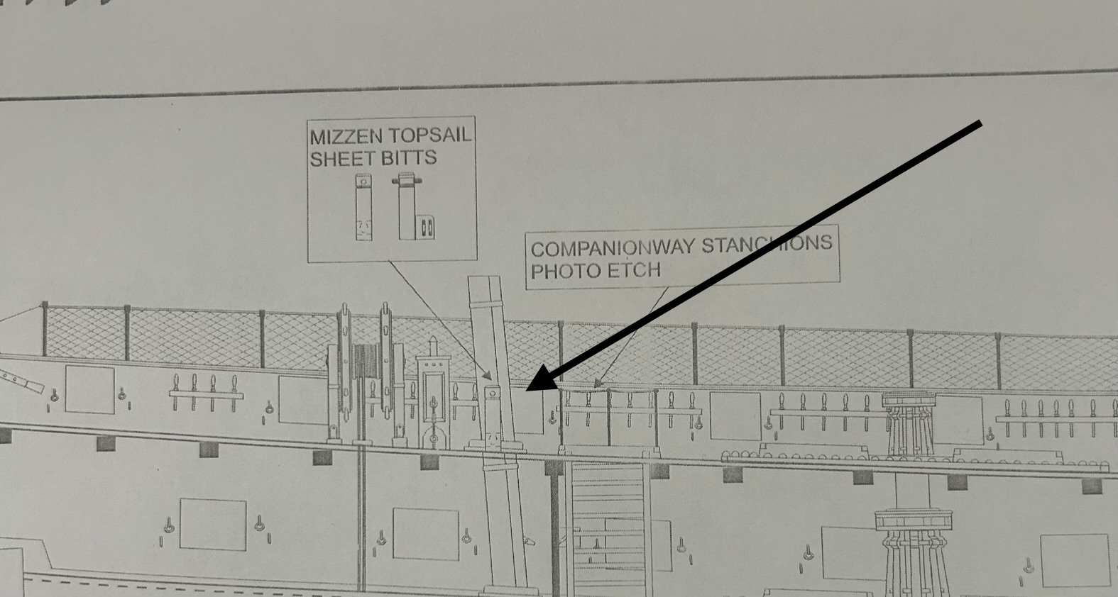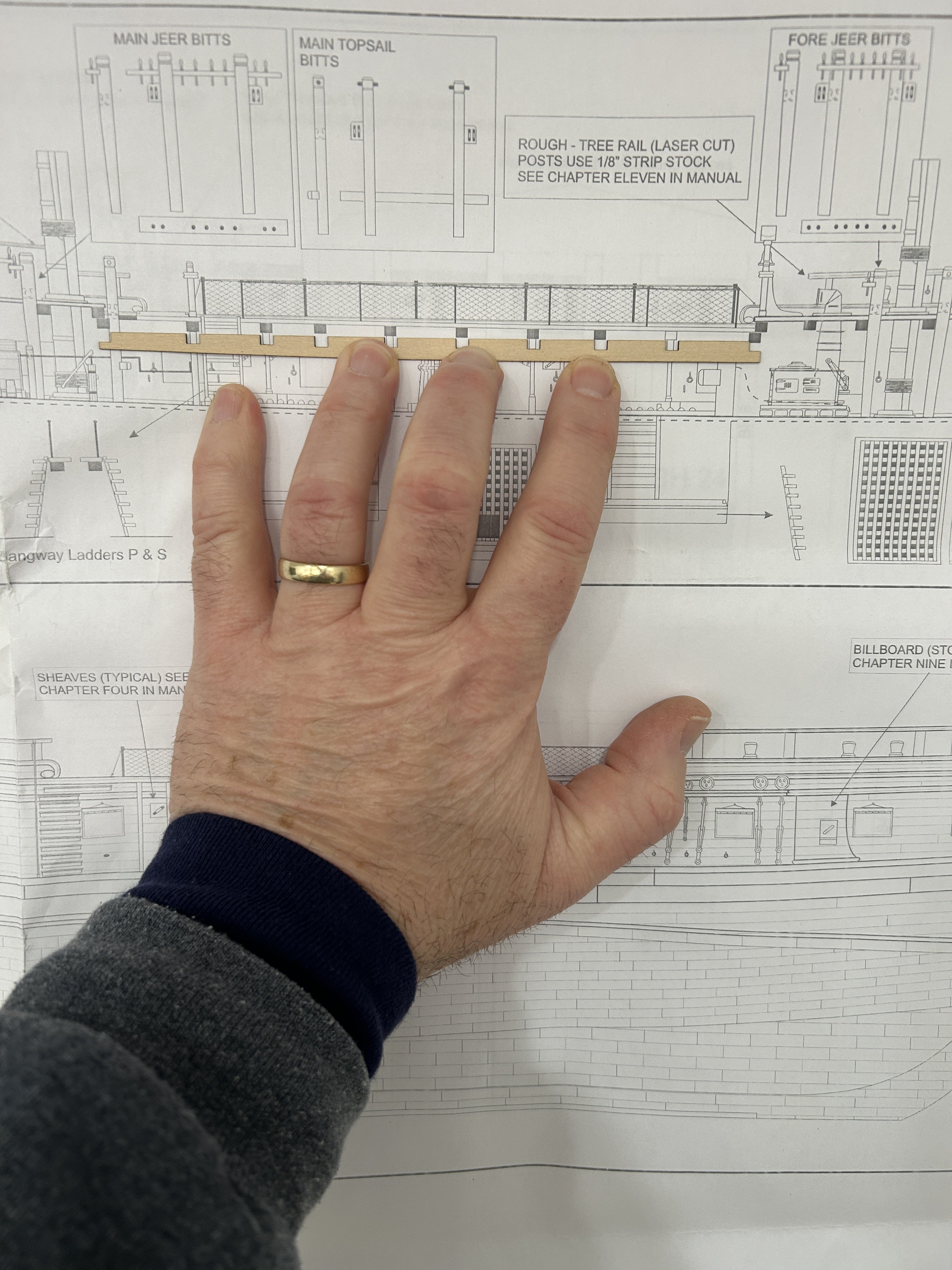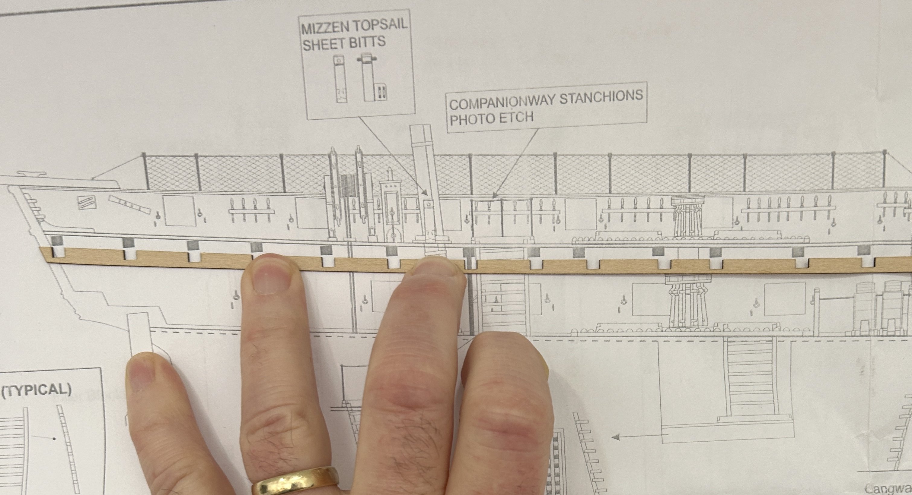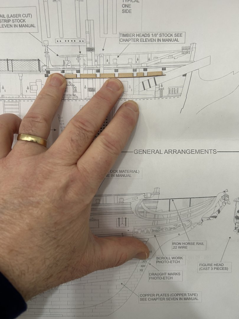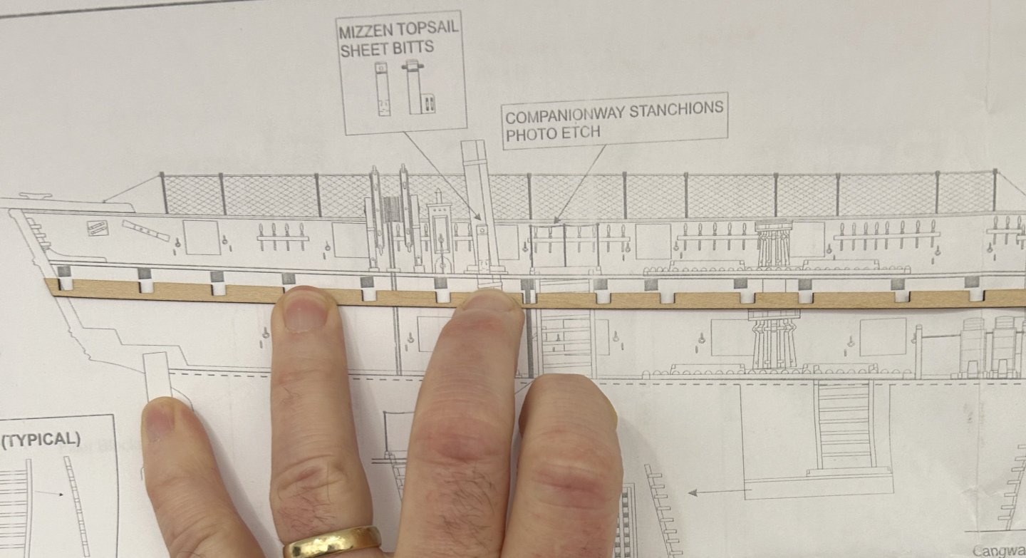 I have the interior planking installed and are working on painting. I have also started thinking about the placement of the beams. The kit uses strips of 1/32 inch thick beam pockets that are glued to the bulwarks for the beams to rest on. 1/32 of an inch is really thin. I am concerned about their ability to support the beams as the deck is installed and the margin plank is cut into to joggle the planks. I am also concerned that with a slight inward flare to the bulwarks it will be really hard the fit the beams without making them slightly undersized. This would result in not being long enough to rest on the 1/32 pocket. I can take steps to add additional material to overcome this problem. I still need to install them in the proper place. The plans show where the beams are placed on a completed model, but most of the features that can be used for reference from the plans are not installed yet. you can see one of the beams is placed in a location on the plans different form the beam pocket. My biggest issue is the placement of the mizzen mast. The actual placement of the mast on the model is determined by a hole precut in the false deck. Unfortunately that hole is about 1/2 - 3/4 further aft than the plans show. This will create a conflict with the placement of one of the beams. I will need to figure out how to adjust for this. I was attracted to this model due to the detail of the features on the gun deck and top deck. The instructions for these features are complete and extensive. Unfortunately for the placement of the beam pockets the author gave us 1 short paragraph with no real instruction on where to place then.