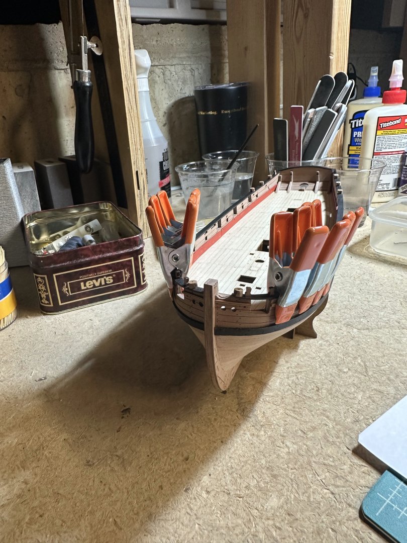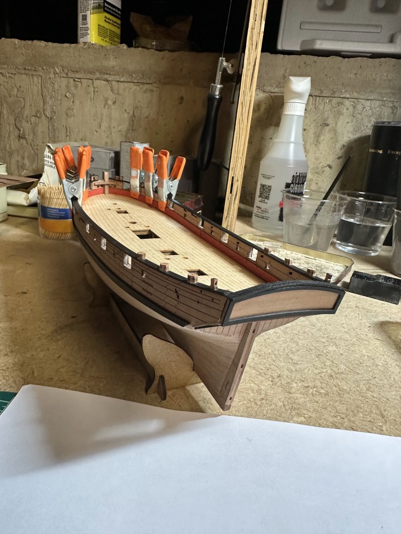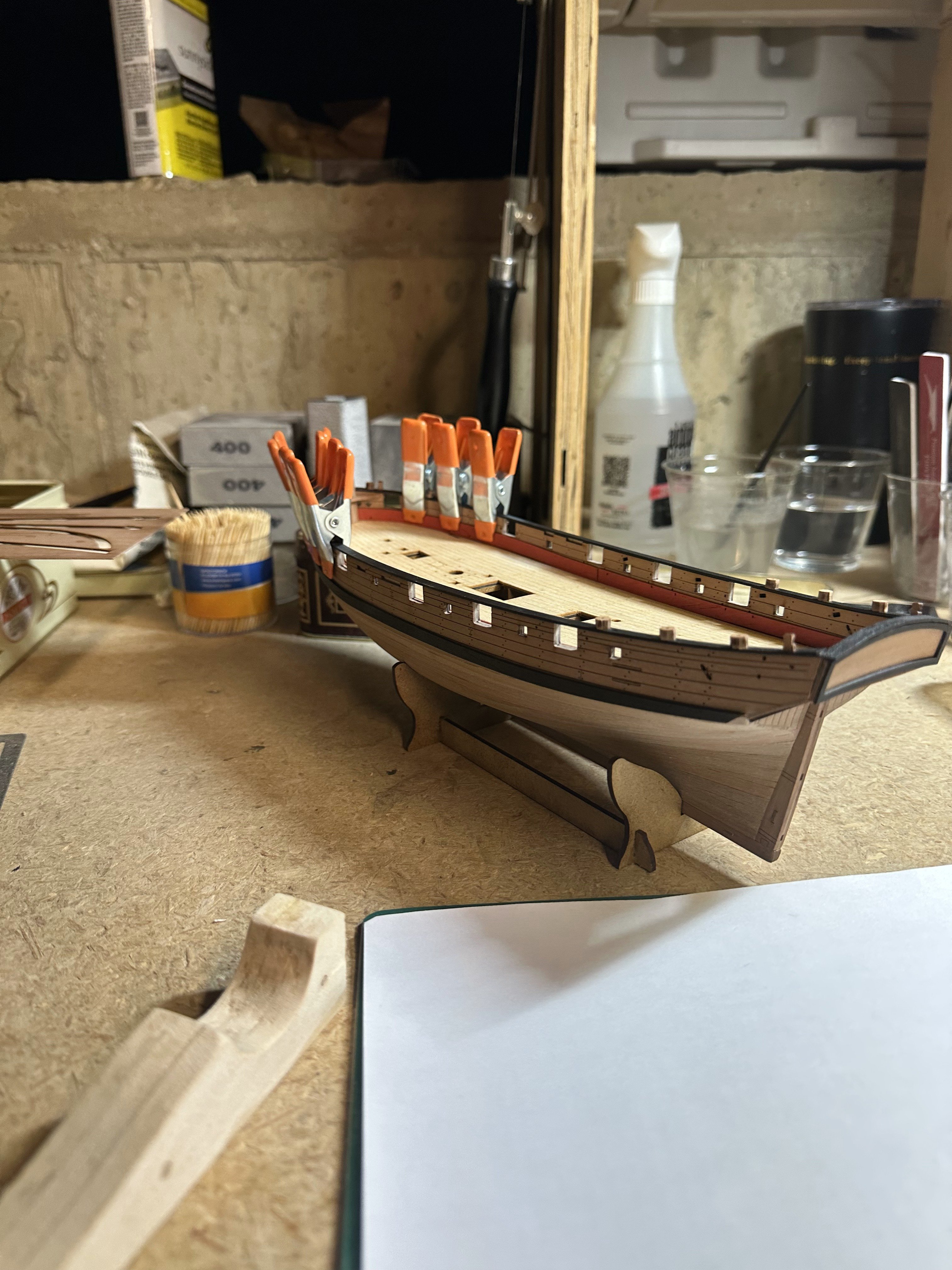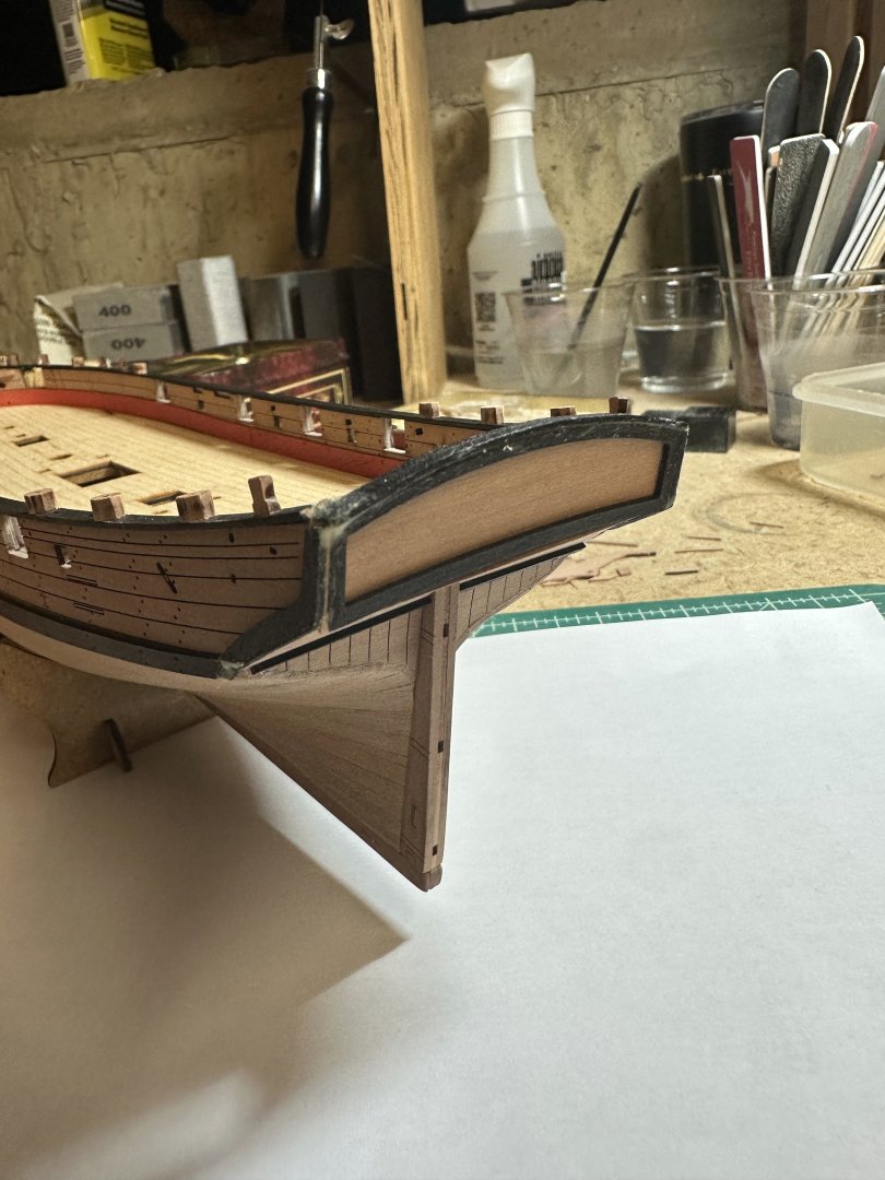 thank you SO much to everyone with your advice! I bought thick and med CA glue in preparation for the second layer of planking as you guys suggested (and from reading other posts on this forum on glue recommendations, Bob Smith Industries one)... Meanwhile sanded the planks and glued some parts. Looks like there is not enough space to slide some planks and too much space at the front but i think extra glue with sawdust should cover it after planking... Trying to prepare/think ahead... what would be recommendations around protecting the painted and unfinished wooden parts? Are there different types of finishes that go on the painted surface as opposed to the unfinished wood one? Something matte I imagine...? Would there be an option to use one type of finish over painted and unpainted surfaces? a bit worried about putting inadvertently a drop in the wrong place and then not being able to get rid of it..