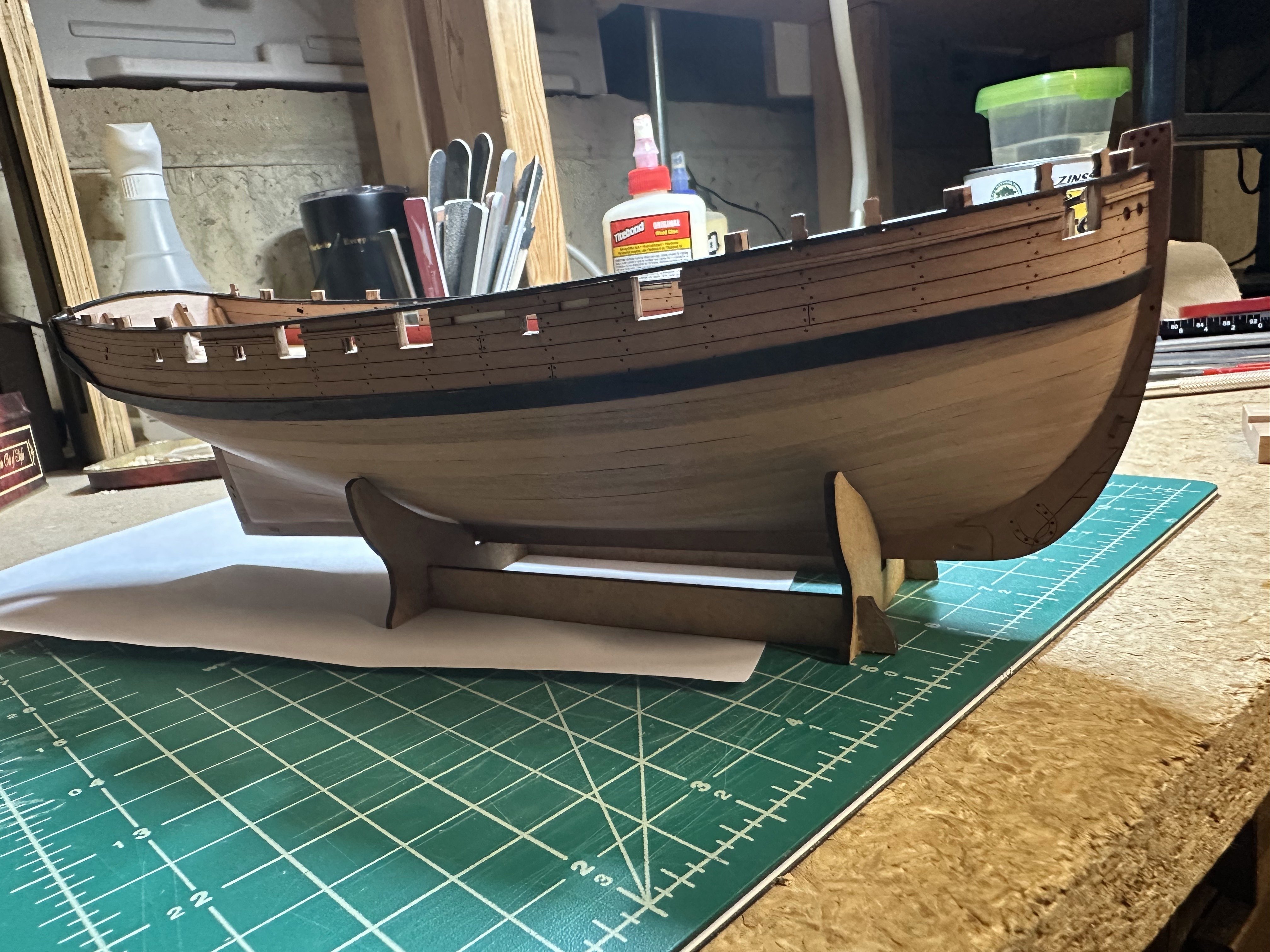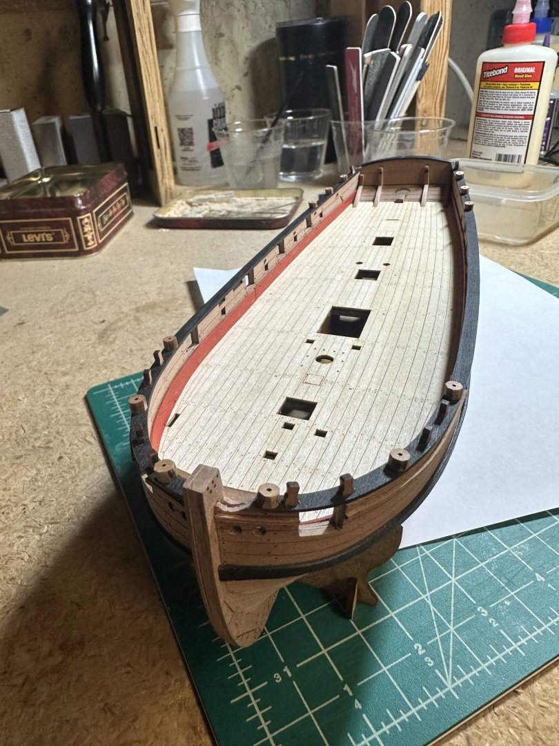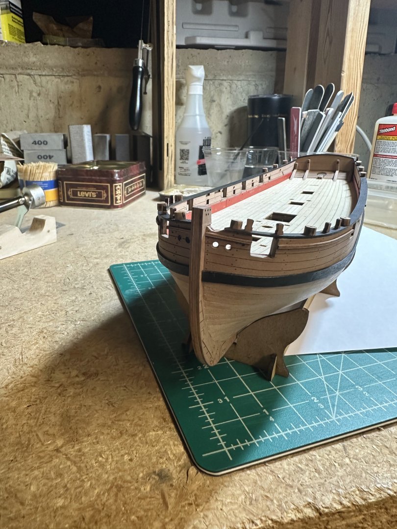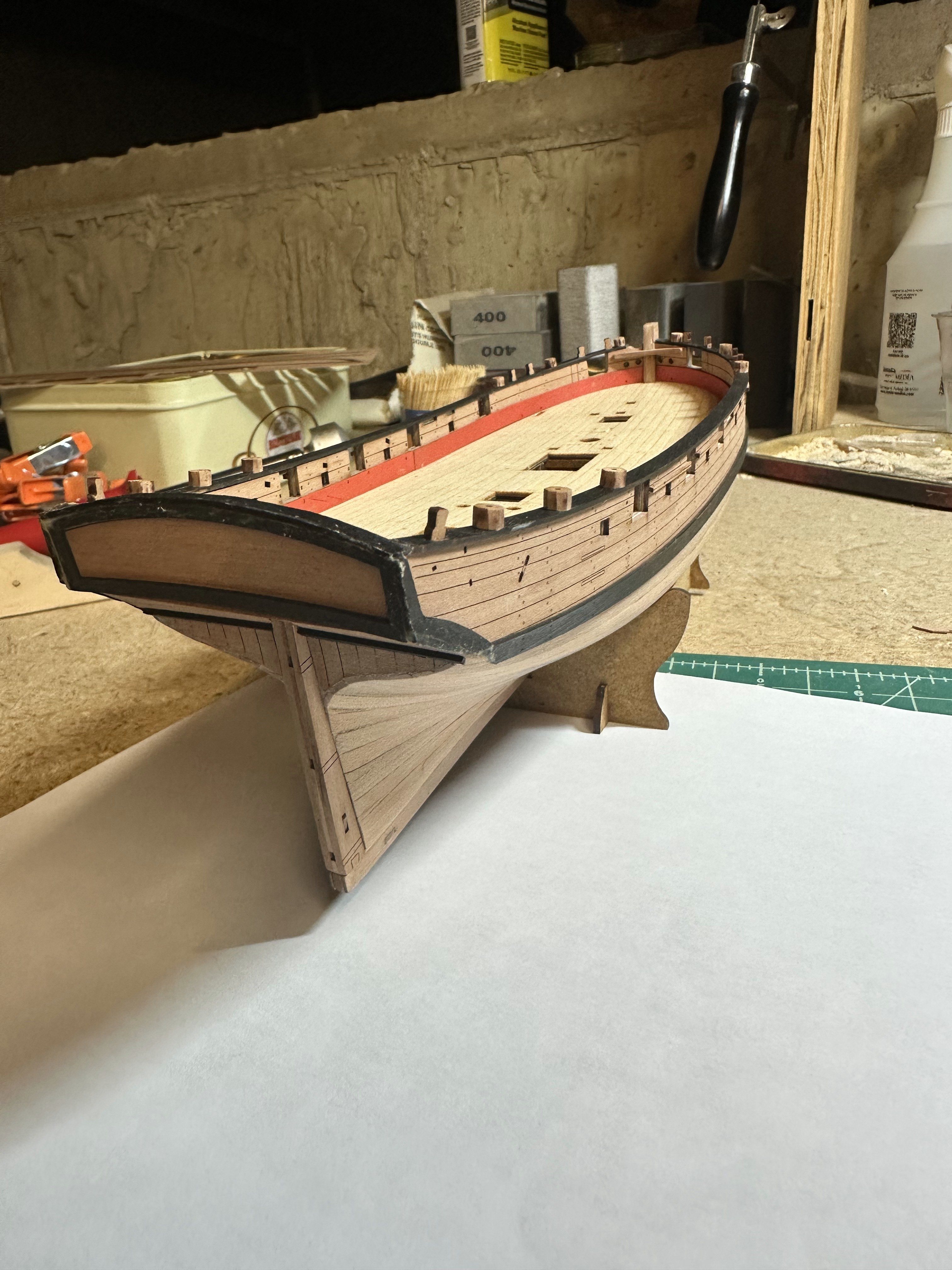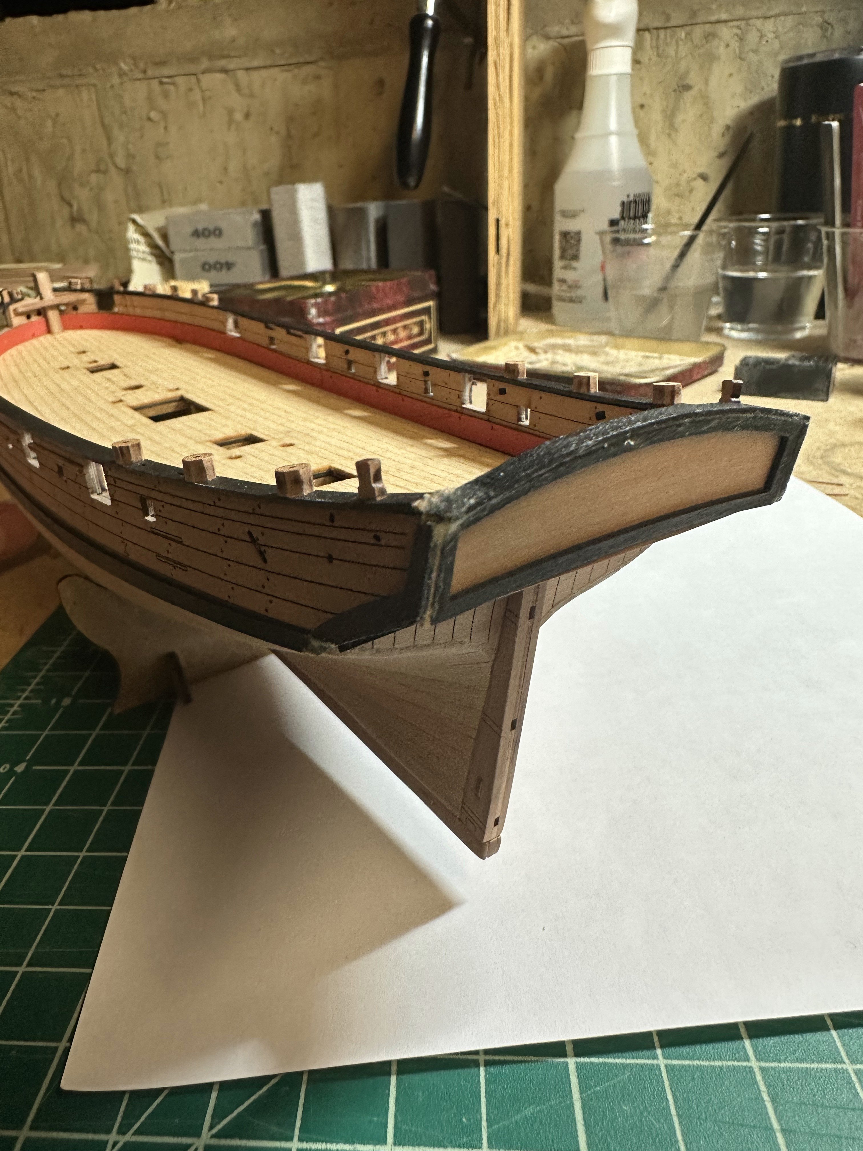 I was thinking about the colors of the hull since coming up to that step... White somehow does not sit as good with me... Started doing a bit of digging and from this forum the article below came up: "Pitch, Paint, Varnish and the Changing Colour Schemes of Royal Navy Warships, 1775–1815: A summary of existing knowledge" by Brian Vale. It had a text in there: "In terms of preservation and decoration, the Navy Board divided the sides of a ship into two parts: that from the wales, that is the strengthening timbers which stretched from the stem to the stern, down to the waterline; and the area which extended above this to the rails. The first was ‘payed’ with waterproof applications of pitch and tar, while the second was covered with various types of varnish and/or oil paint." So i take it the color was dark/gray tones of the wood which most directly translates to he unfinished wood look, outside of weathering it. So leaning towards just leaving the hull as is (only varnish with shellac) and just having black wales.