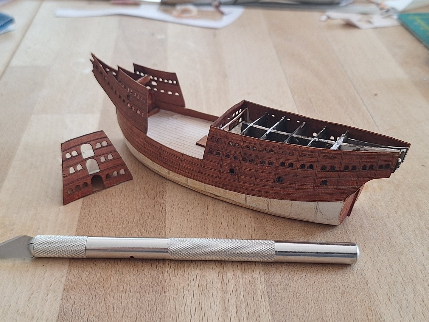 This is better. The masts have been lengthened and the fighting tops have been reduced in size. I'd like to depict the sail as billowing as Brueghel did. I've used Bible paper for other models at this scale. However, it's difficult to curve it in two directions. Perhaps someone here has a tip on how I could create such a billowing, curved sail. best regards Alvb