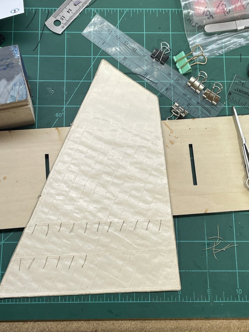 I’ve been shaping the yards and boom. Also making the sails. This teabag paper is working good for me. It doesn’t require a new skill:-) First I trace the sails on the paper then paint one side to give it a little stiffness. After a few days of drying, so it’s not tacky. I cut them out. next I cut strips for the seams, hems and corner supports. After all that’s done I paint over both sides. Then glue a rope around the sides. I still have four more sails to glue this rope on.