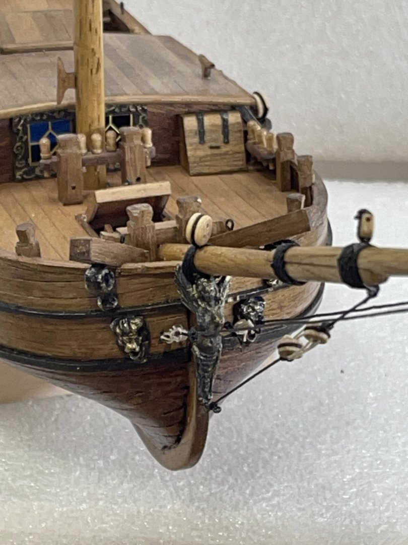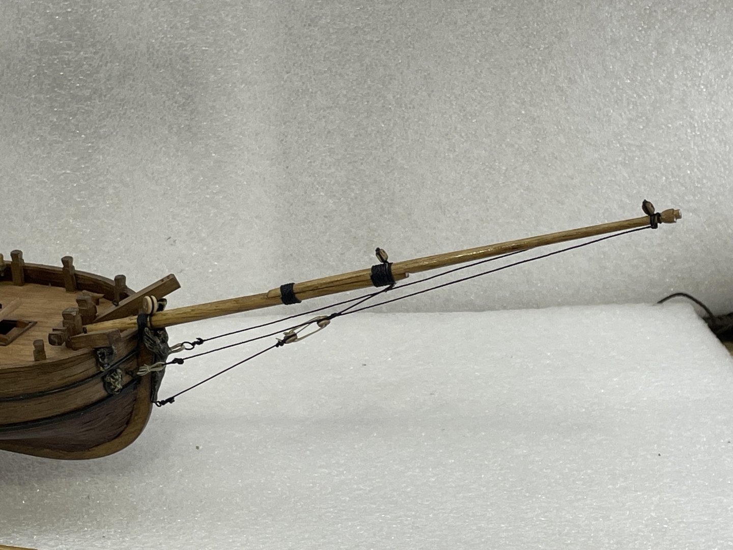 After pulling off the Gretel for a month, to insulate and finish my wife’s garage, aka the old shipyard. I am super relieved to get back to scale building . 4’ x 8’ sheets of plywood and 15’x 4’ blankets of insulation are zero fun. When I stopped last month I was about to start the rigging. Everytime I go from planking to sails and sail to rigging, it takes me days to acclimate my brain and build up enough confidence to get back started again. I started on the bowsprit because I could see the end 🙂 I still have work to do to get the sails ready and I need plenty of time to keep studying the plans on the rigging. The only thing that’s bothering me is the possibility I will put something up that’s in my way:-) Here I’m trying to get these reefing ropes in the main sail.