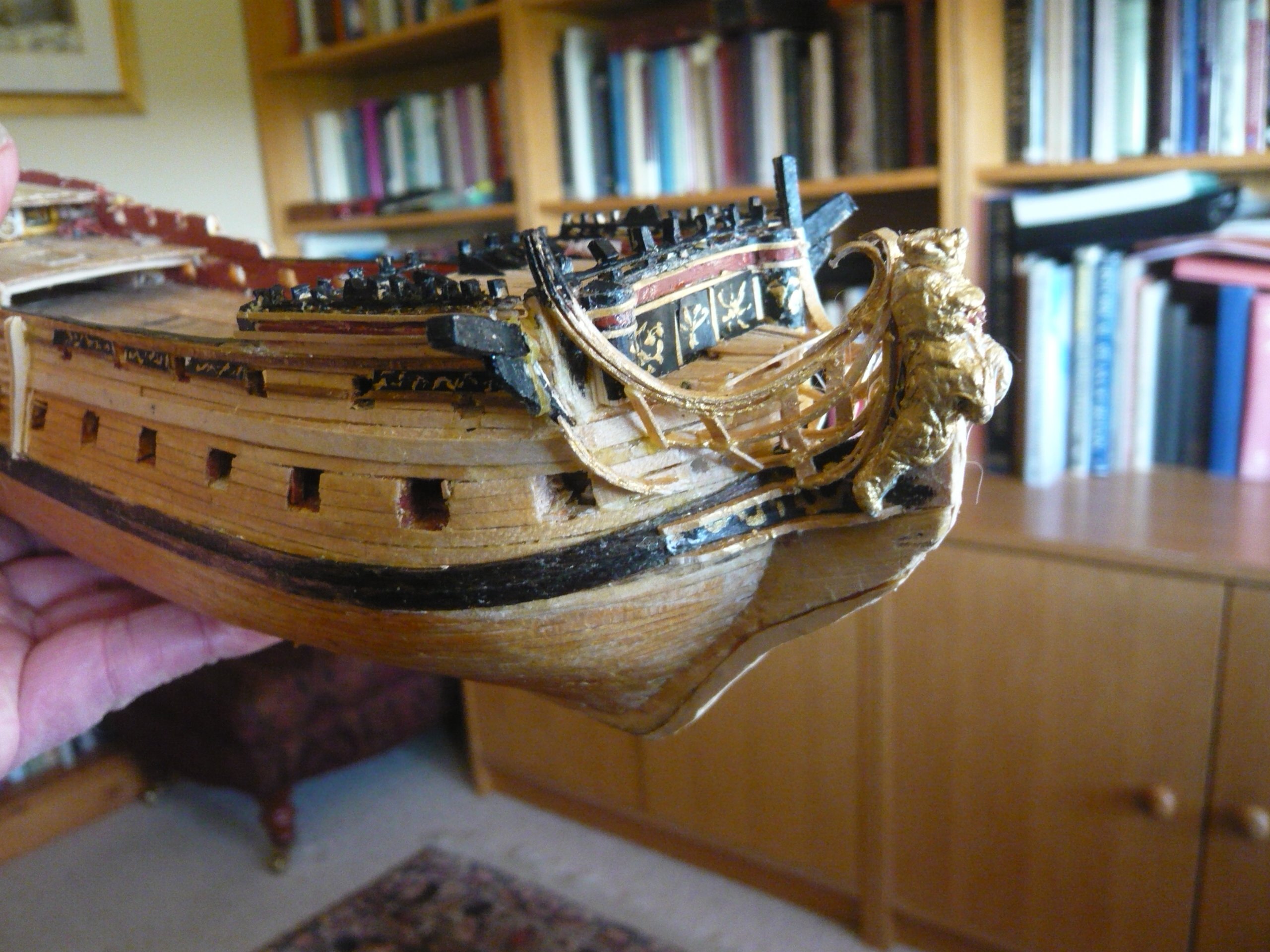 Once again t’s a fair time since I updated this blog - apologies. The bow was a problem, and my initial efforts were a predictable failure. I tried using card, but it just did not look right, even though, unlike wood, there is no problem in bending it. So I have used stripwood, soaking it in hot tap water (provided the boiler is working, which was a bit of a problem until a new one arrived recently). The bent strips are then glued together to achieve a plausible thickness. As for the figurehead, I have used Milliput, as I can’t carve anything that small. The figure is no more than about an inch in height. One grandson said helpfully that it looks more like a seal than a lion, but I think it will have to do. I’ve gilded it rather than attempting polychrome - it’s not clear how the original would have been finished, but this seems best. There’s a good deal of tidying up to be done, and photos always seem to bring out the faults, but I hope this gives some impression of progress on the this part of the model. Meanwhile I’ve also been working on the stern, which is taking ages. Incidentally, I have belatedly found an excellent video of the model in the National Maritime Museum at https://www.youtube.com/watch?v=RAM-K193fYk. As well as the ship, it features ‘relaxing classical music’. I’m not clear who made it, but it’s not the work of the museum.