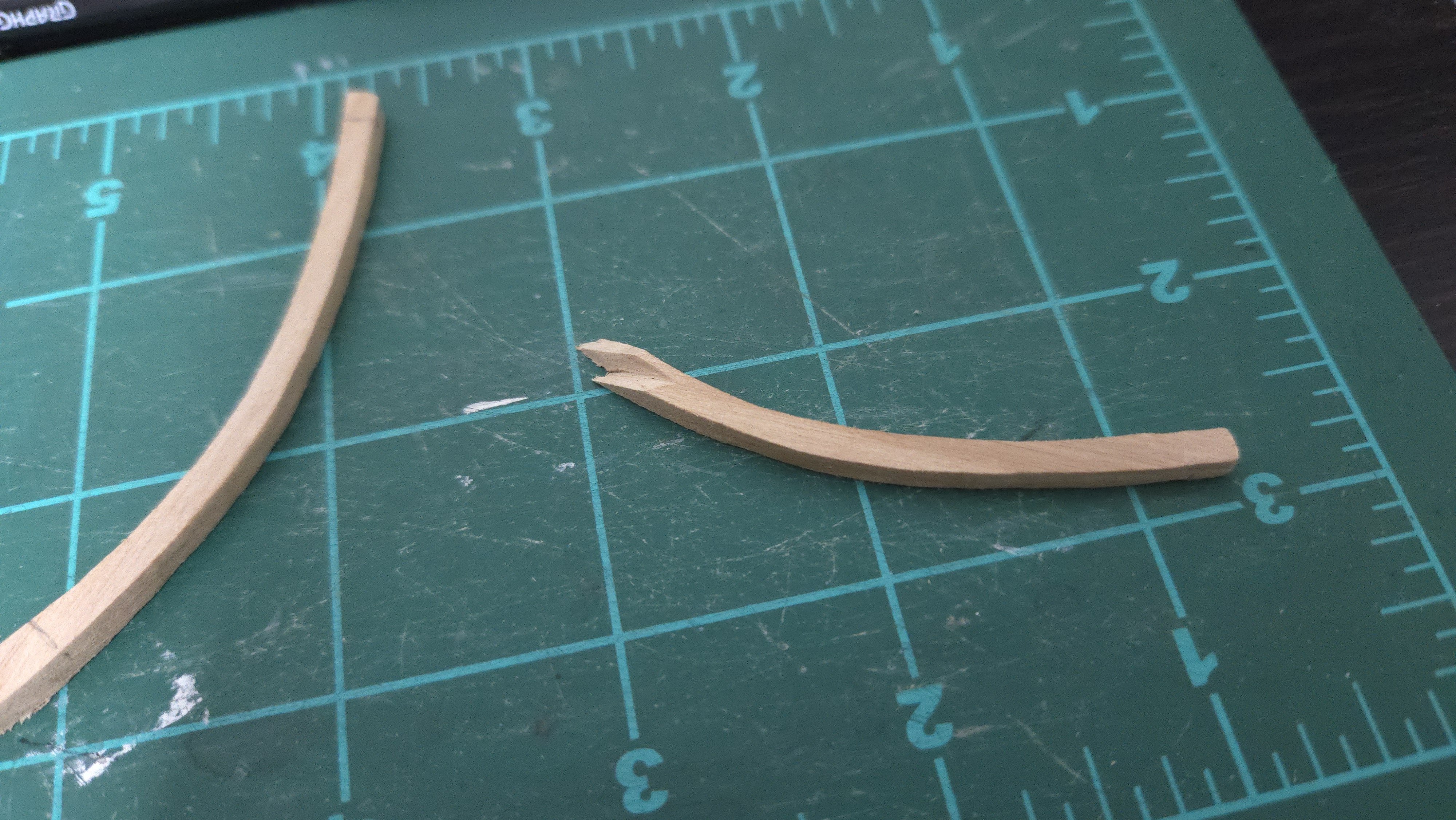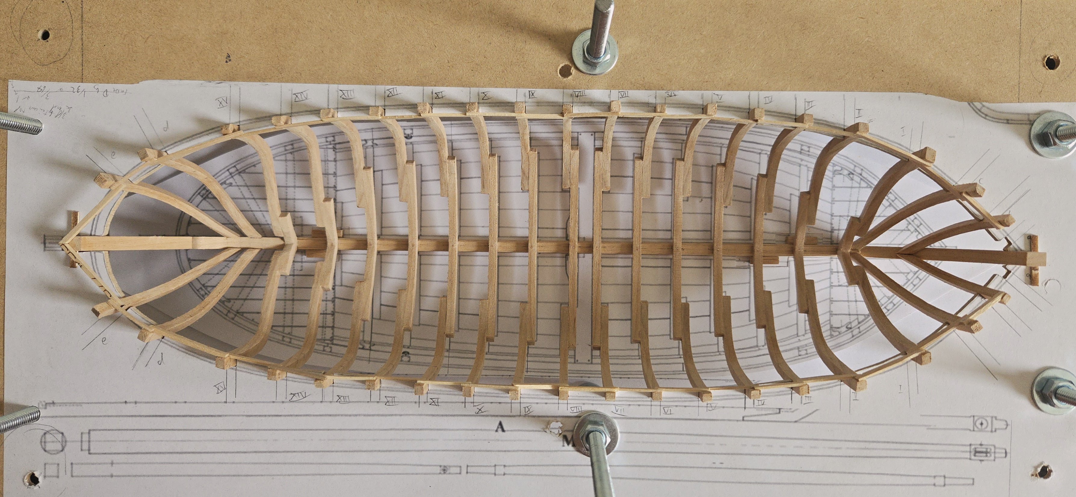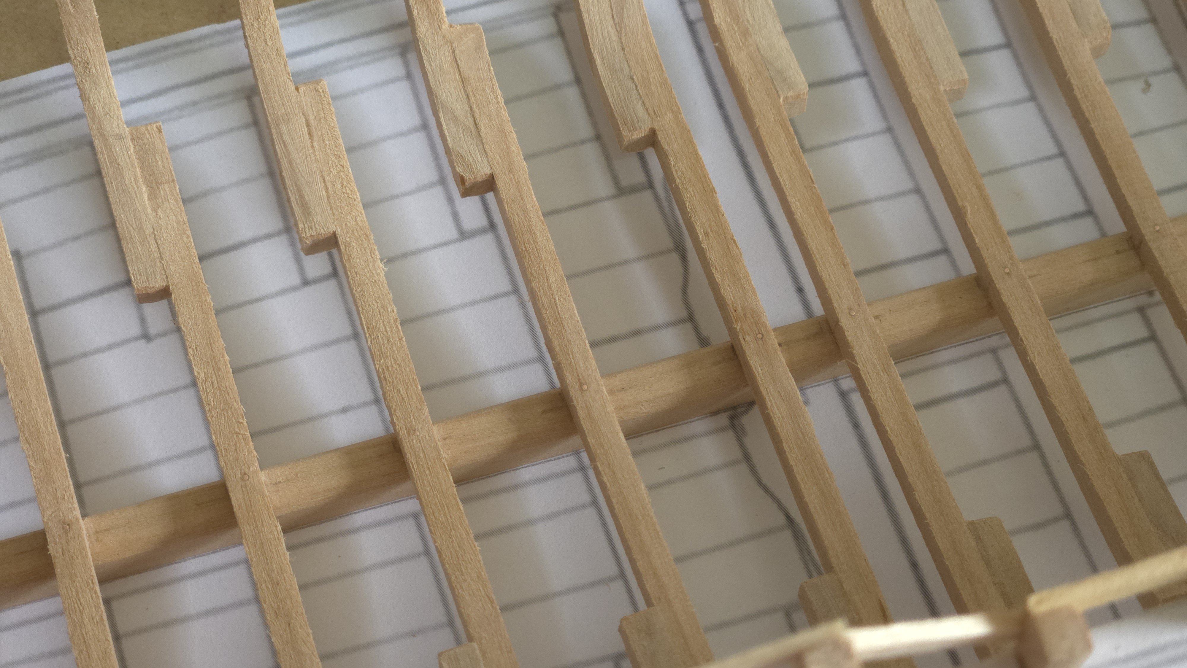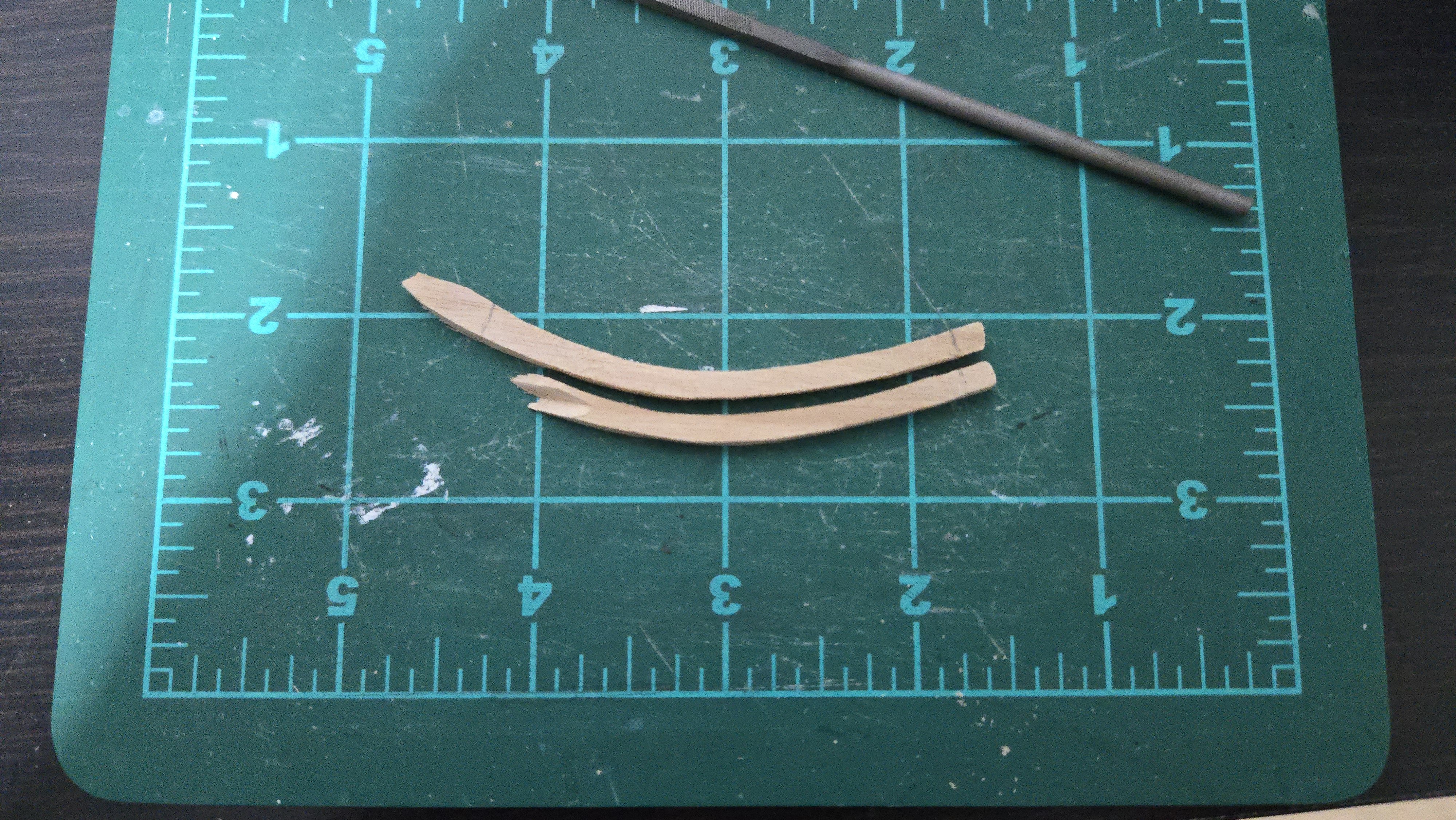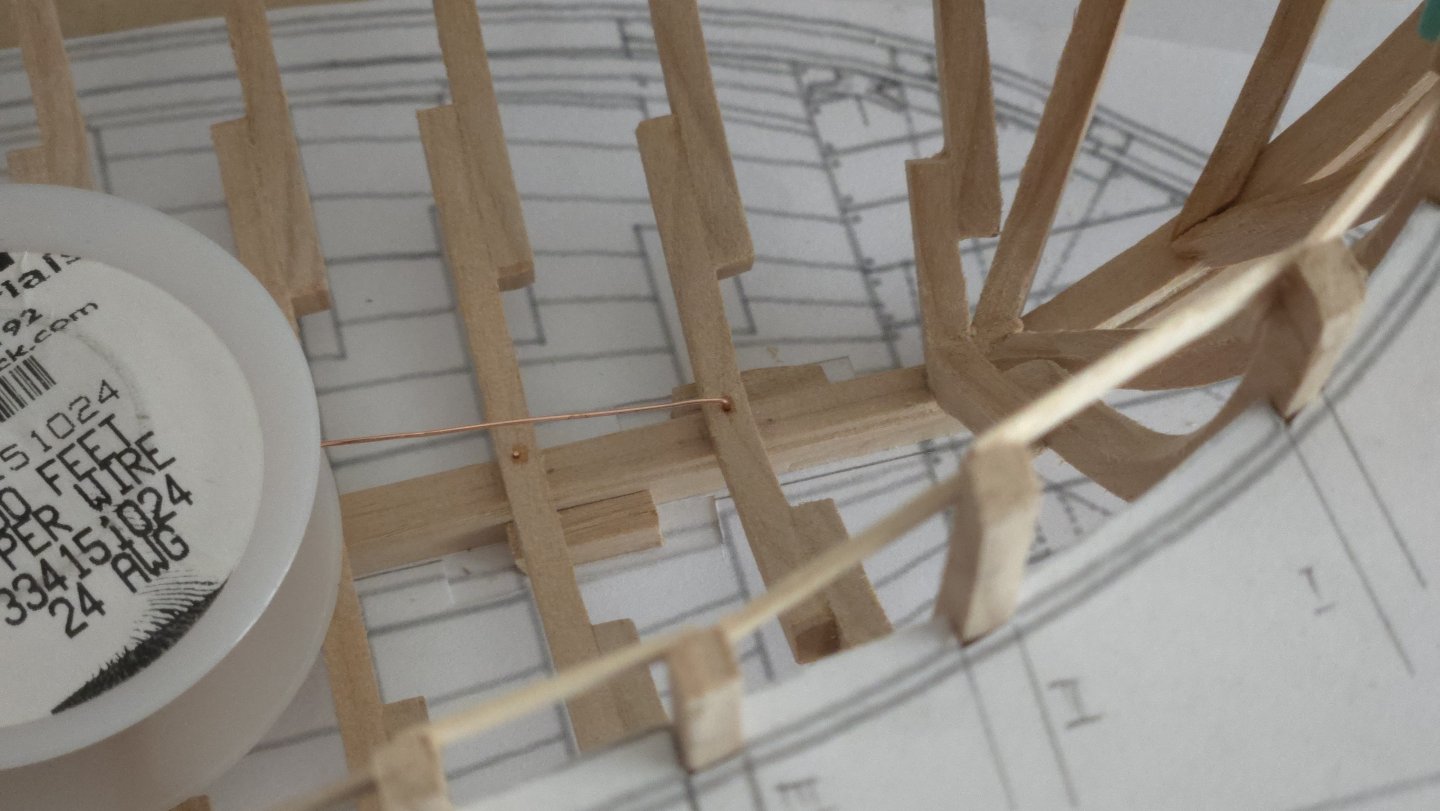 Thanks, Paul! I've found the time to make a bit more progress on this build. First, the keelson. This is just a long strip of wood, slightly tapered at both extremes. I'm making mine slightly longer than given on the plans to better cover the messy joints of cant frames C. Each end was also angled on the underside to better fit against the frames there. After a good bit of fairing, it fits smoothly across the frames, except for at frame 2 near the bow. I'm not sure if I cut the floor too thin here or what, but the keelson can't really be bent to fit onto this frame. I'm going to continue fairing frame 1, which I think is still too thick--the keelson is supposed to sweep up a bit at the ends, but maybe not quite this much--but I may have to add a support piece here. Second, cant frames B. As I've mentioned many, many times, the plans don't show the bottom ends of these. I had to trial-and-error my way into fitting them against the stem. One challenge is that the frames need to be on the aft side of the rabbet, but the frames are thicker than the relatively narrow ledge of the stem behind the rabbet. Checking photo logs of this model, I found that other builders have shaped these frames to fit onto the back of the stem--e.g., ending the frame in a notched joint rather than just a straight cut. I did one side first, constantly checking for fit and adjusting. It was a tricky cut to get right! By the time I had it right, the frame was a lot shorter than shown on the plans, as can be seen below (the parts were cut overlength, but the ends given by the plans are marked in pencil). Eventually I got both cut to shape. And I glued them in place. The joint with the stem didn't turn out quite perfect, but it should be stable enough and will be covered by the foredeck. Finally, I decided to pin the frames to the keel with a bit of copper wire and super glue, in order to strengthen the small butt joint there. It was tricky to push the wire all the way down into the holes because it easily bent and it was hard to get a grip to push it down, although it got easier once I started bending the wire at 90 degrees just above the length of the pin so that I could push down on the bend instead. Once all the pins were in, I was able to file them flush. I finally got to use the riffler file set I bought a while ago for this. Here's the current state of the build: Next, I need to add the last frames, cant frames A (which are basically hawse timbers or knightheads on either side of the stem). Given the highly acute angle where they meet the stem, these will be another challenge to shape.