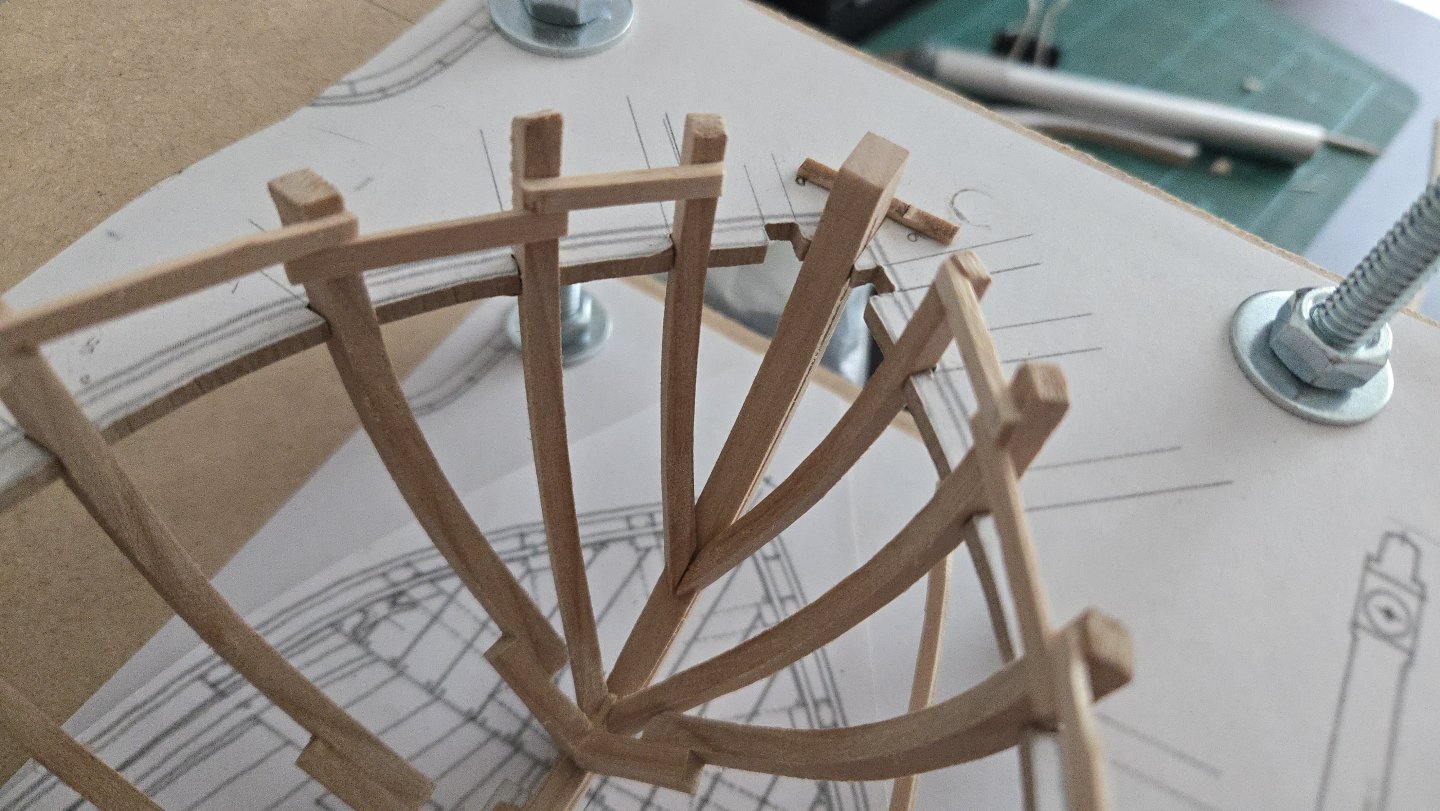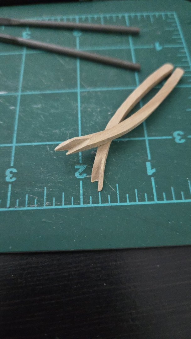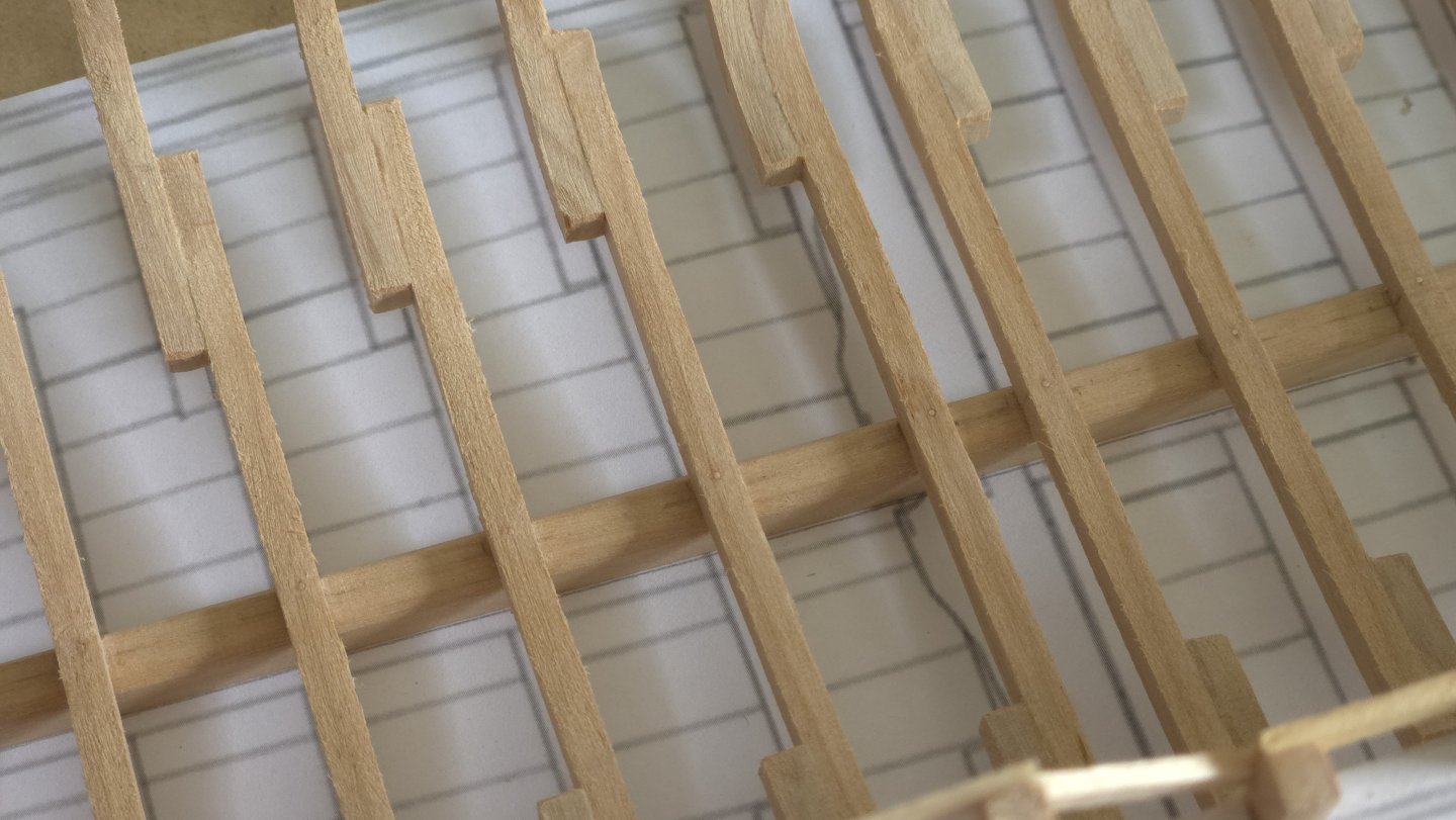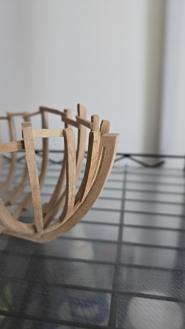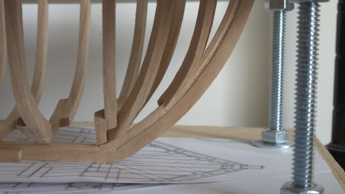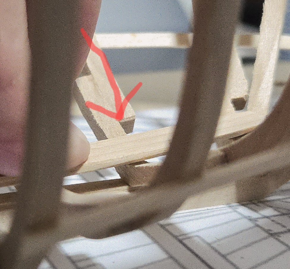Thanks, @wefalck. I'll have to check out the watchmaking/repair shop here again. They seemed to have some interesting stuff. Unfortunately like many small shops here, their setup was not very amenable to browsing--I got the impression that you have to already know what to ask for when you go. I may have to redo some parts. Cant frames A turned out more challenging than I thought (I'll spare everyone my now-habitual complaining about the plans). Due to their position right alongside the keel, it was hard to test fit them until they were already shaped. Shaping them took a while, as they needed very long notches, curved to match the stem curve. I then glued them in position. Unfortunately, there ended up being quite a gap where they meet the stem. The starboard side is especially bad, the port side better but still not great. The aftmost part of the joint with the stem is also off, with the tips floating a bit above it. Apparently I added too much of a curve to the notch (after initially being unable to properly fit it because there wasn't enough of a curve). I'm debating whether or not to remake these frames, or at least the starboard one. Part of the problem is that I'm having a really hard time conceptualizing what the notch should even look like. I think that, at a certain point, it should be something like the drawing below showing a cross section of the frame piece, but the exact position would need to change along the length of the piece to match the angle of the frame-stem joint and the curve of the stem. I'm also not sure if the angle of the notch relative to the frame piece is really close to correct. So, on one hand, it would be better to have better-fitting frames here. On the other hand, I'm not at all confident in my ability to do a better job, given that I can't really figure out what shape the notch should be, and the jig makes it difficult to trial fit until you're already fairly close (but you also need the jig to trial fit in the first place). It's also worth noting that the second frame piece I made, not the first, is the one that turned out worse. I'm also not sure when I'll get the chance to go to the carpentry workshop again and would be able to cut new pieces--things are so busy with work that I really haven't been able to go, and have only been able to spend an hour here or there on modeling at home. Anyways, if anyone has any suggestions about the frame, I'd be happy to hear them!