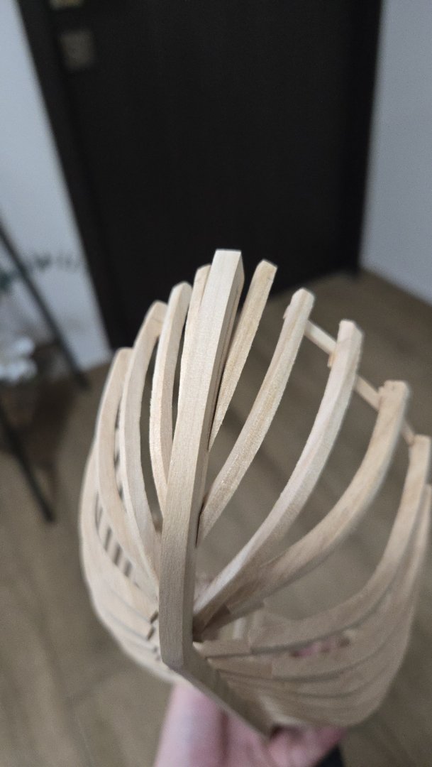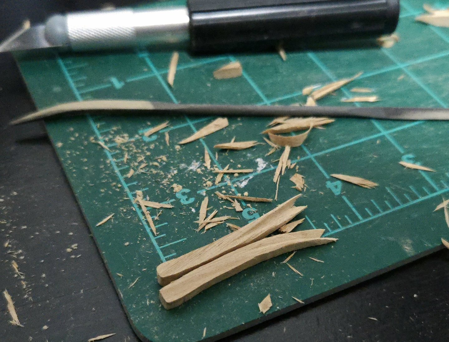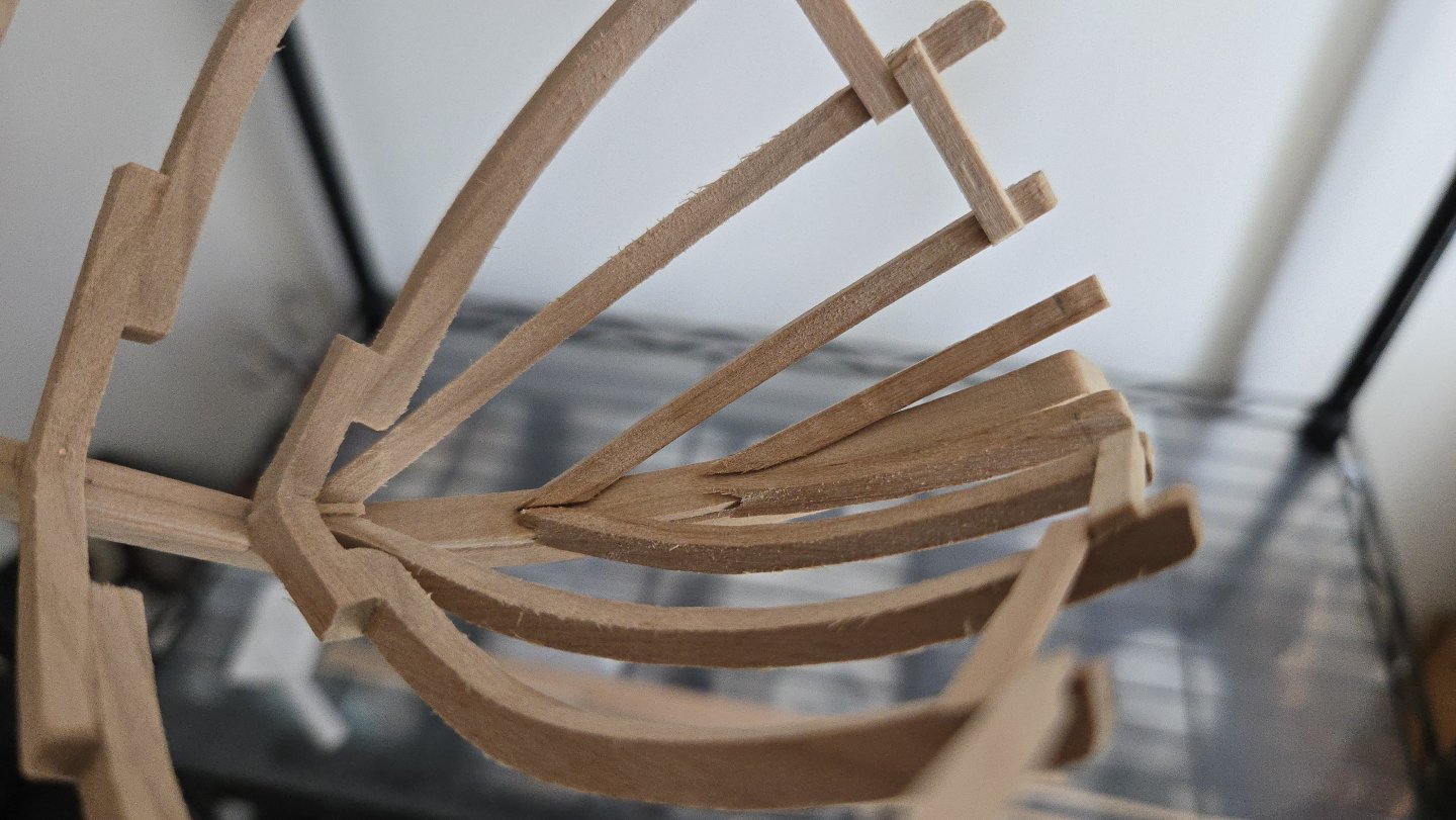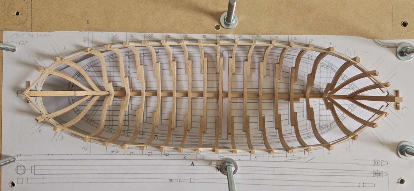 While my modeling time has mostly been focused on the Bateau build, I've progressed a bit. The next step is fairing the hull. The kit design would have you add the deck now to stiffen the hull for fairing, but I won't be adding the deck until much later so I can more easily build the cockpit. So, as the frames felt a bit fragile, I added supports between the bulkheads. I've also started fairing. My method for a small hull like this is to first use a batten to check which frames seem especially high at the top, middle abd bottom of the hull, taking notes on this. I then fair with a flexible sanding stick, and a curved sanding block in the hollow of the lower aft hull, giving special attention to the high frames. It's then a slow process of continuing sanding and checking fairness with a batten. By this point, I've gotten the starboard side and the deck mostly fair. Next up will be the port side, then I'll check both sides for evenness and final fairing.