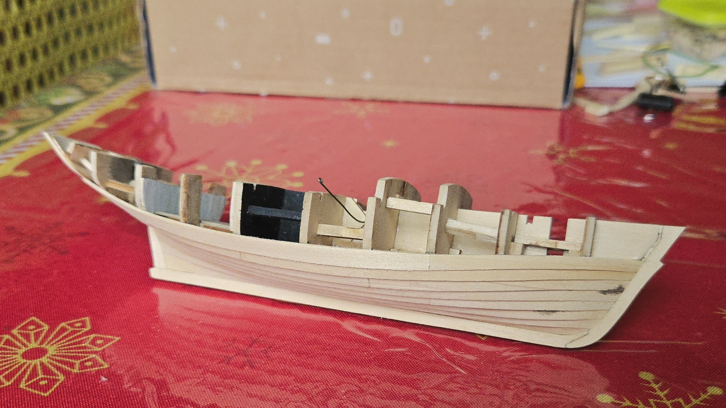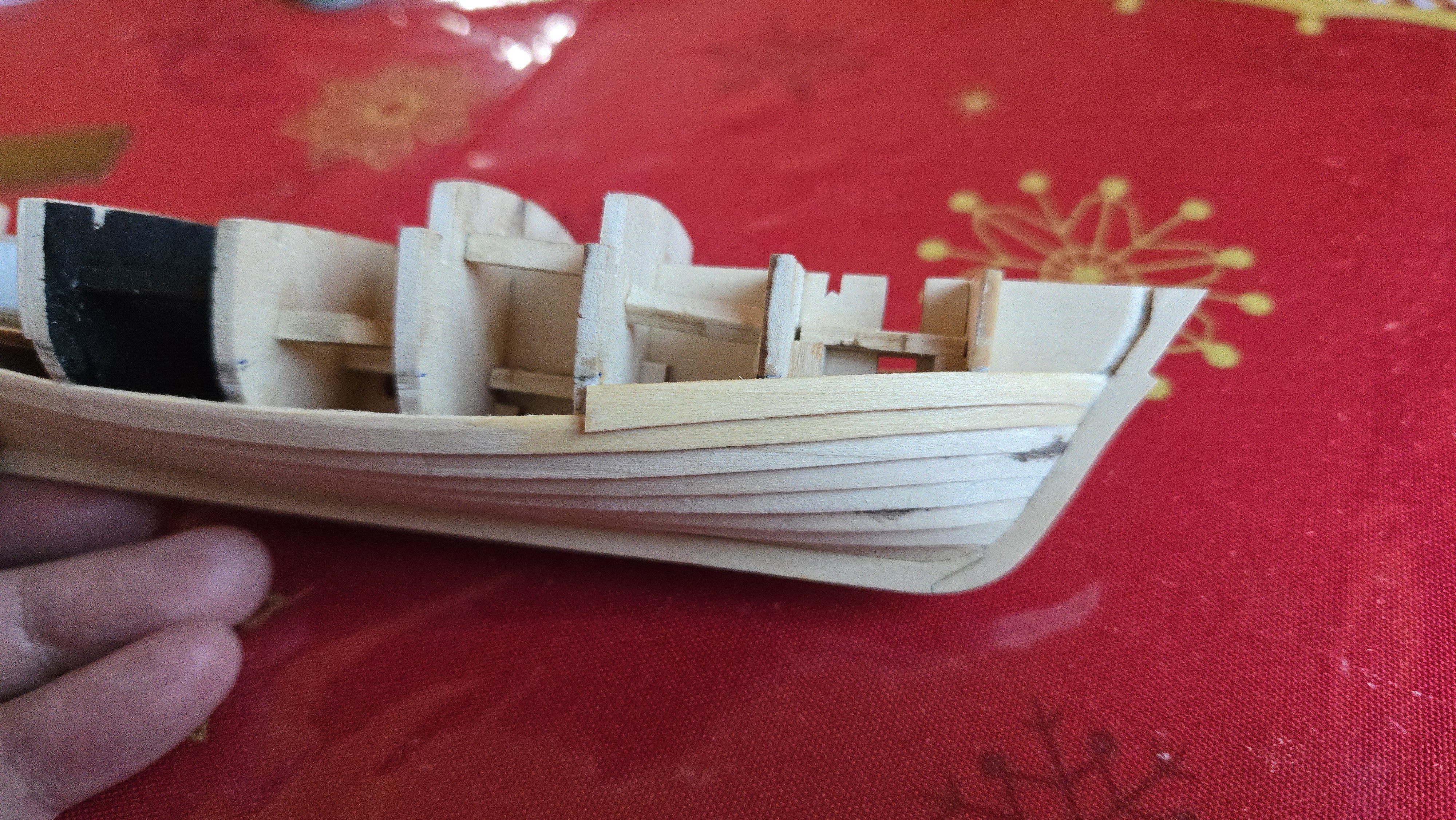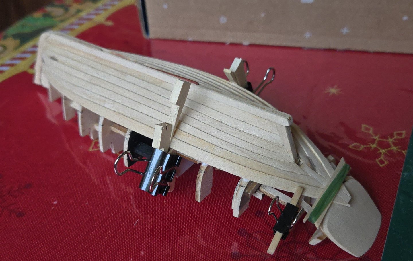 Looks good to me! I feel like with a bit of filler and sanding it should smooth out nicely. Challenges with the sheer strake aside, the kit planks seem to go together very nicely. I almost regret going with lapstrake planking on mine, as it has made what I was hoping would be a straightforward, fairly simple build into something rather more complex. As for the more prominent grain on the sheer strake, I wonder if a bit of shellac or some other sort of sanding sealer would smooth it out? (I seem to remember that you're planning on painting this hull, I could be wrong though). I recently tried shellac for the first time on a different project and was pleasantly surprised by how smooth it turned out and how straightforward it was to apply, and apparently it takes paint very well.