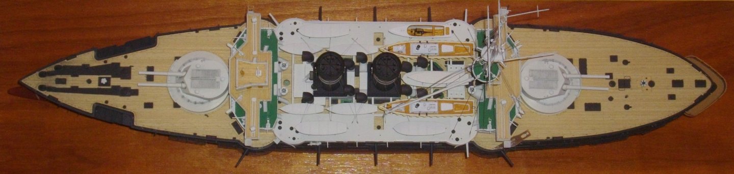 23. After applying a coat of gloss varnish to the rooftops, I put on the wooden decks. I painted doors and the the binnacles a wood color. The deckhouses were glued on their place with a fair amount of CA-gel and the bulkheads indicated with the blue arrows with pink Zap. Finaly I glued on the port and starboard light housings. Which gives this over all view Untill next update, enjoy modelling.
