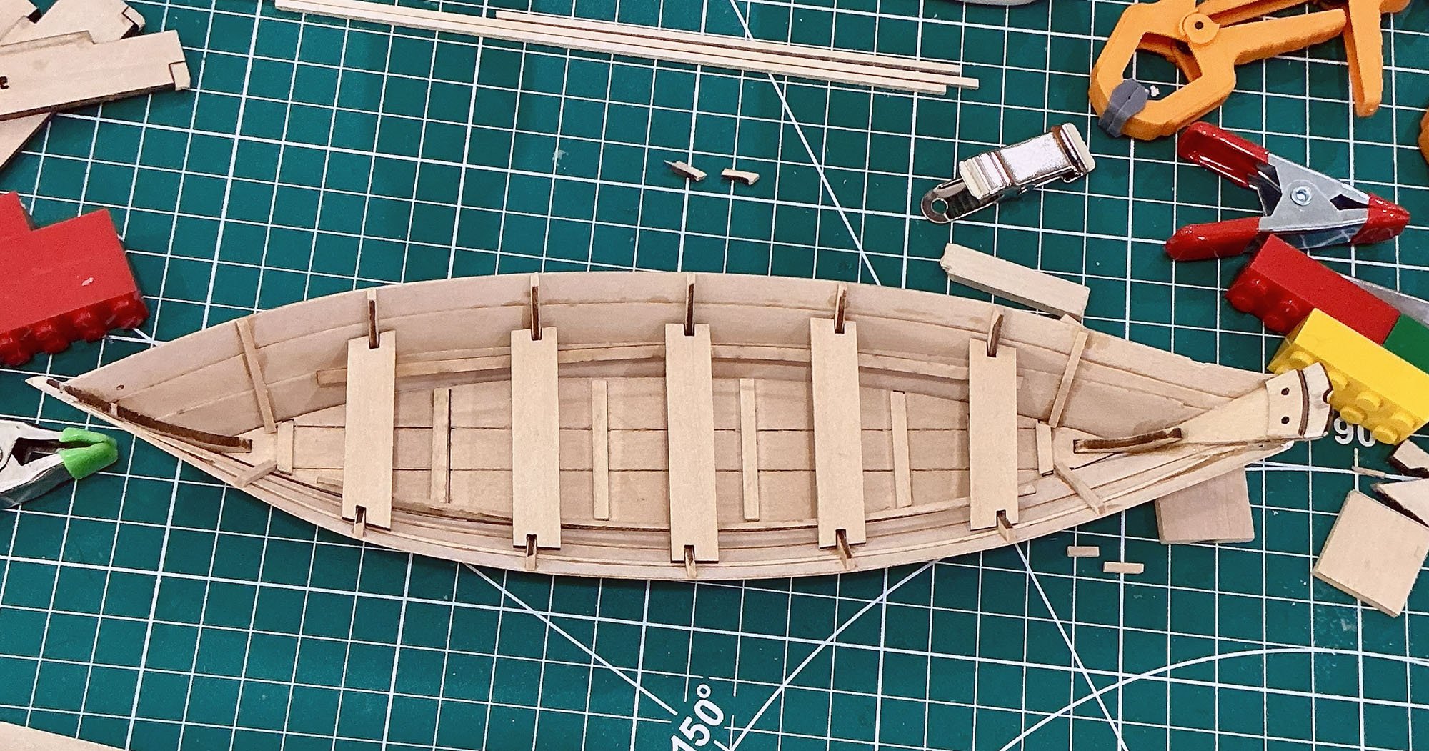 After getting it off the stand, realized there were a few places that the plank didn't completely touch the frame, so touched those up. Plus added the bow strip. I'm just guessing on which thickness of wood to use, as the instructions don't mention it and I don't see a plan view that specifies.